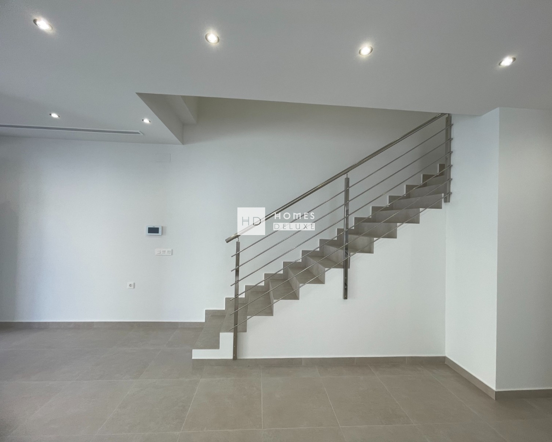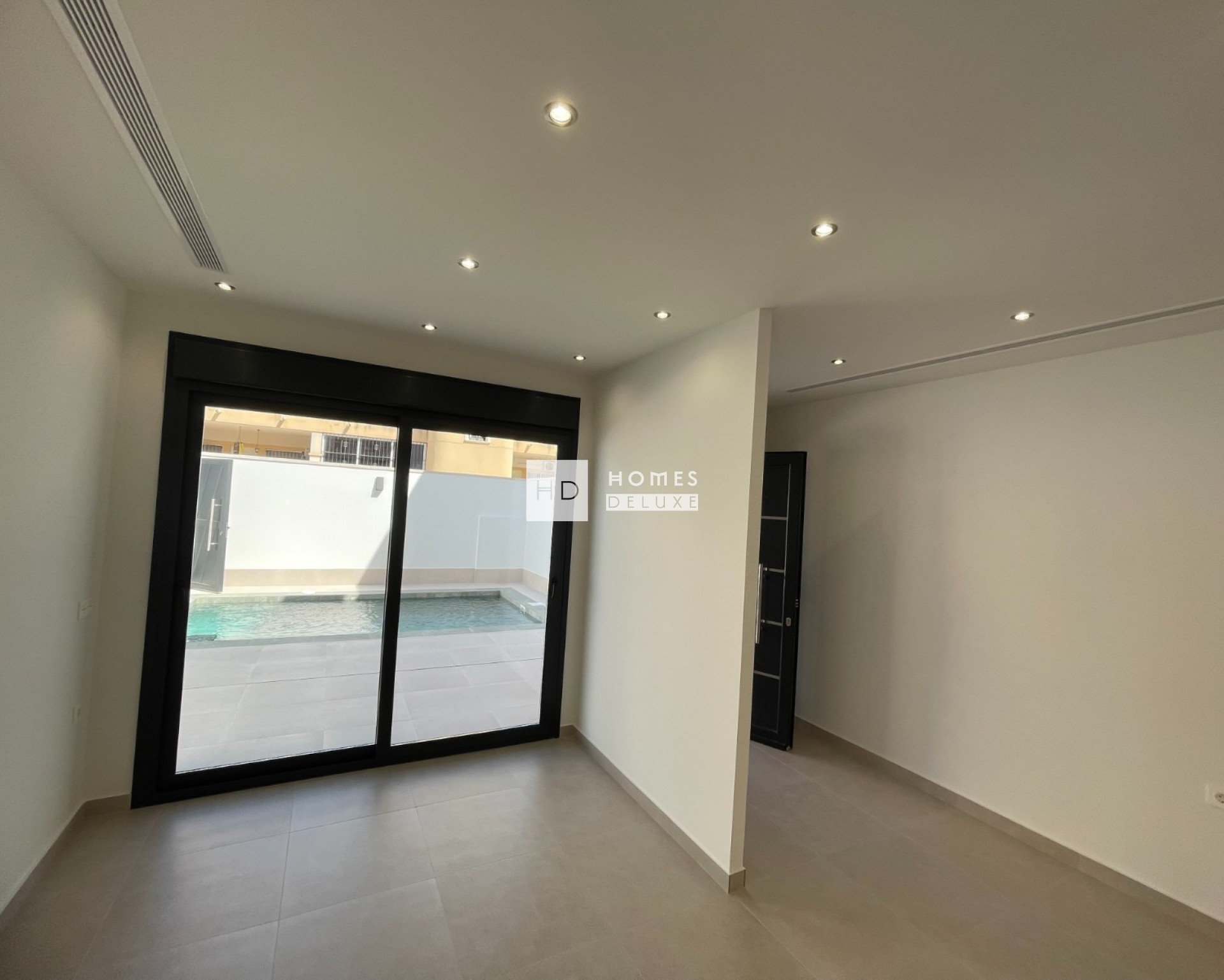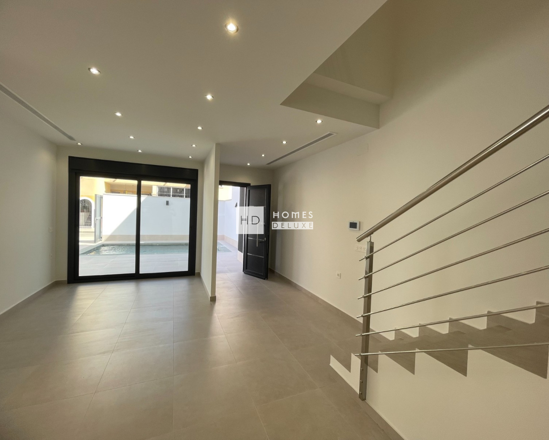 La distribución interior consta de un luminoso y espacioso salón de planta abierta y comedor con puertas que dan a la terraza, dentro del espacio de vida principal es una moderna cocina americana totalmente equipada con una isla central, y hay una sala de lavandería separada útil. La planta baja también incluye un dormitorio doble de buen tamaño con puerta de acceso a una zona ajardinada, y hay un baño de invitados. La escalera interior que conduce a la primera planta con dos dormitorios Suite impresionante, ambos con baño en-suite y walk-in-armarios / vestidores. El dormitorio suite situado en la parte delantera de la propiedad tiene acceso a una terraza privada con vistas al jardín y la zona de la piscina. Las propiedades incluyen aire acondicionado por conductos con control de zona, electrodomésticos de cocina, armarios empotrados en todos los dormitorios, iluminación LED interior y exterior, jardín con sistema de riego automático, piscina privada y aparcamiento privado en la parcela.