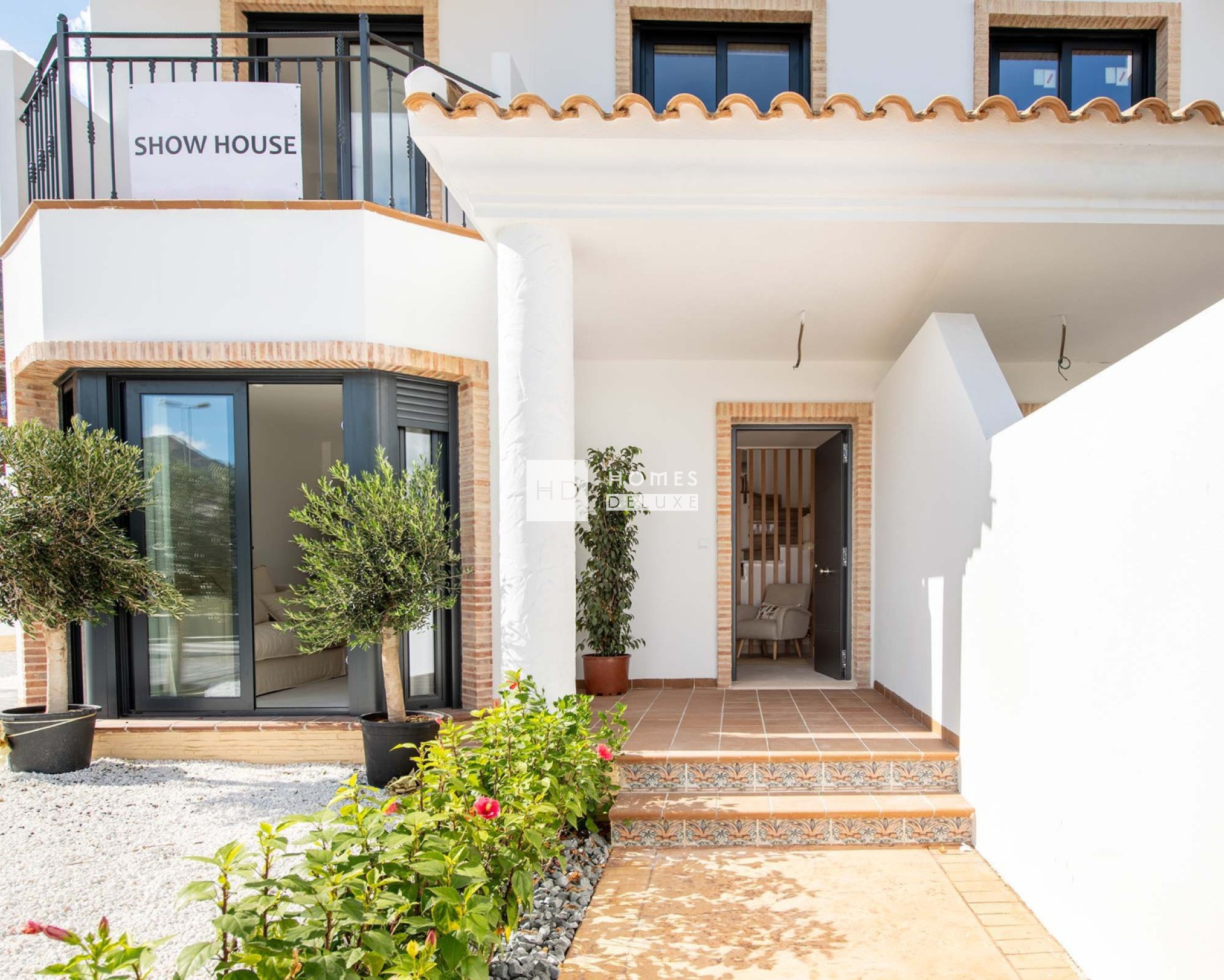 Este modelo en particular es la opción de casa adosada y la propiedad tiene dos niveles con un solárium en la azotea. La distribución interior consta de un amplio salón y comedor diáfanos con grandes ventanales que dan al jardín privado. La cocina independiente incluye armarios inferiores y superiores y hay una puerta de acceso al patio trasero de 12 m2, donde se encuentra la zona de lavandería. La planta baja también incluye un dormitorio doble de buen tamaño y un cuarto de baño independiente para invitados. La escalera interior conduce a la primera planta, donde se encuentra el amplio dormitorio principal con puertas que dan a una terraza privada en la parte delantera de la propiedad. Hay otro dormitorio doble y un cuarto de baño familiar. La primera planta también tiene acceso a una terraza de 12 m² en la parte trasera de la propiedad, que cuenta con una escalera exterior que conduce a la amplia azotea de 32 m², que incluye una cocina de verano, perfecta para disfrutar de comidas al aire libre bajo el sol durante todo el día.