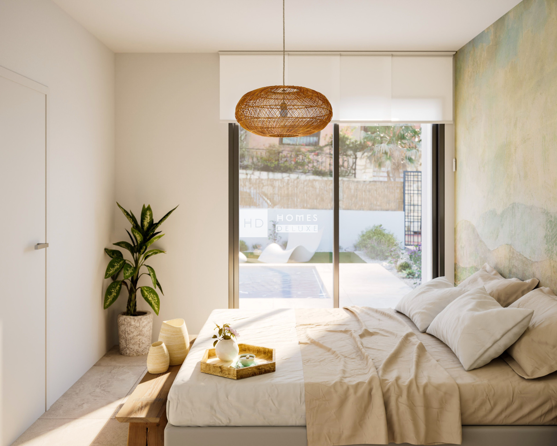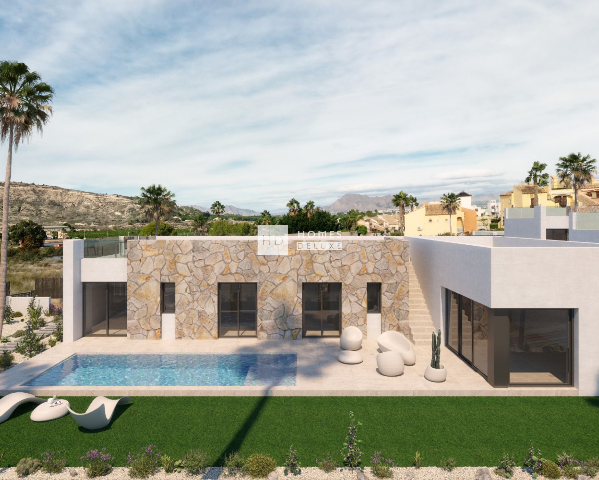 Descubra este exclusivo complejo de villas construidas con los más altos estándares y equipadas con las últimas comodidades, incluyendo piscina privada, plaza de aparcamiento y jardín paisajístico. Villas independientes de una sola planta con 3 dormitorios y 2 baños, diseñadas para disfrutar de un entorno natural y privilegiado. El diseño combina líneas modernas con elementos tradicionales, como la piedra en la fachada, lo que añade la calidez de la construcción tradicional. Las propiedades aprovechan al máximo la vida al aire libre en España con un gran jardín privado y una terraza con una piscina privada de 8 x 3 m como punto focal. El amplio solárium de 61 m² en la azotea amplía aún más el espacio exterior.