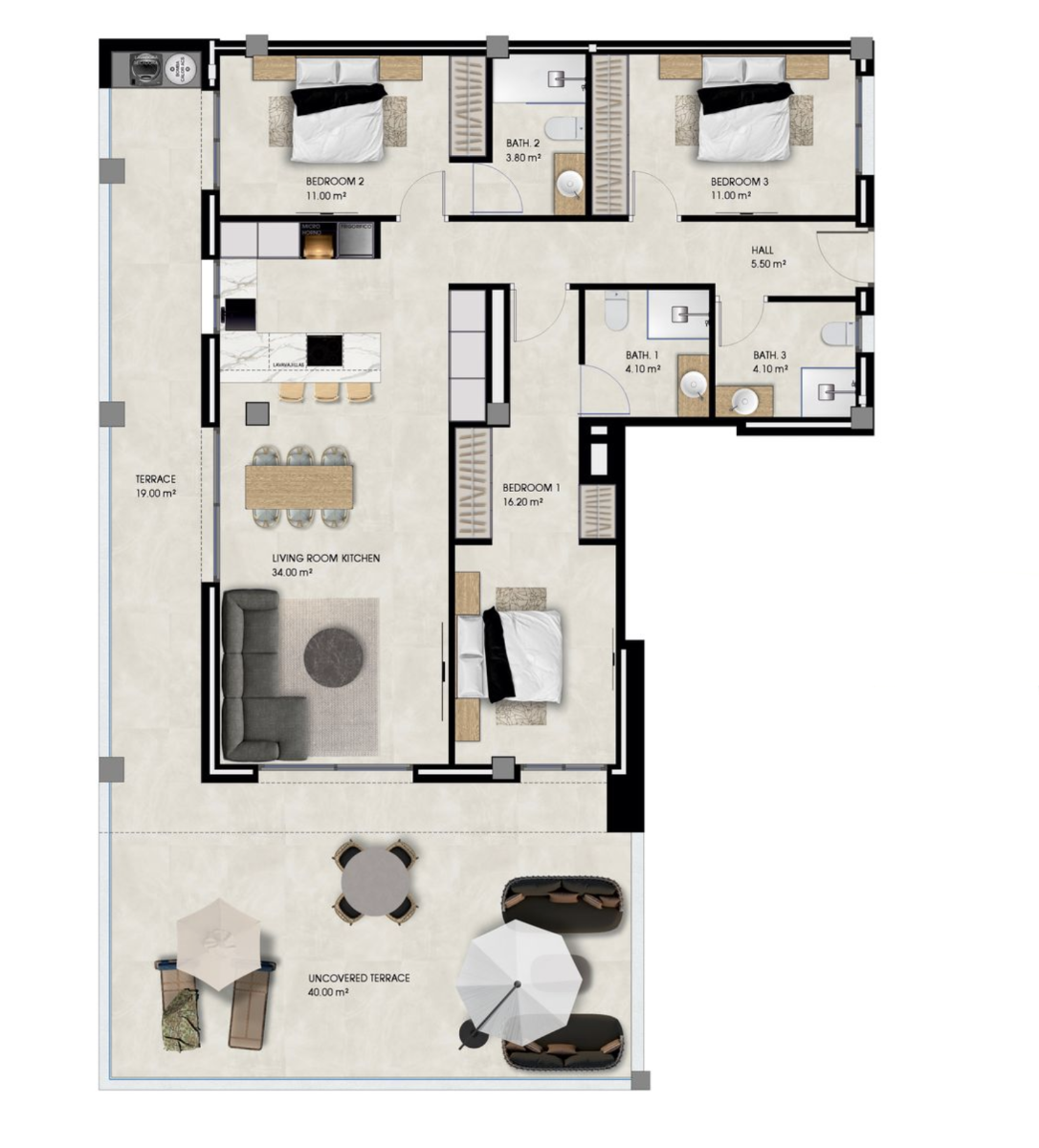 La distribución interior consta de un vestíbulo de entrada que conduce al amplio salón y comedor de planta abierta con ventanas que dan a la terraza privada. Dentro de la sala de estar principal hay una cocina moderna de estilo americano totalmente equipada con barra de desayuno. El amplio dormitorio principal incluye un cuarto de baño en suite, un vestidor y puertas que dan a la terraza. Hay otros dos dormitorios dobles de buen tamaño (uno de ellos con baño en-suite) y un baño de invitados independiente. Los apartamentos están completamente amueblados, incluyendo todos los electrodomésticos de cocina y la iluminación.