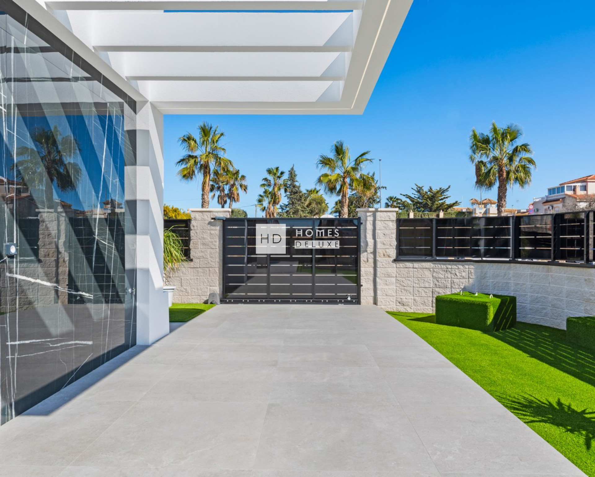 Las propiedades incluyen preinstalación para aire acondicionado por conductos, electrodomésticos de cocina (horno, placa de inducción, campana extractora, microondas, frigorífico-congelador, lavavajillas y lavadora), armarios empotrados en todos los dormitorios, lavadero, iluminación LED interior y exterior, persianas eléctricas, sistema de videoportero, jardín ajardinado con césped artificial, piedras blancas y palmera, piscina privada de 7x4 m, y aparcamiento privado en la parcela con puerta de entrada motorizada.