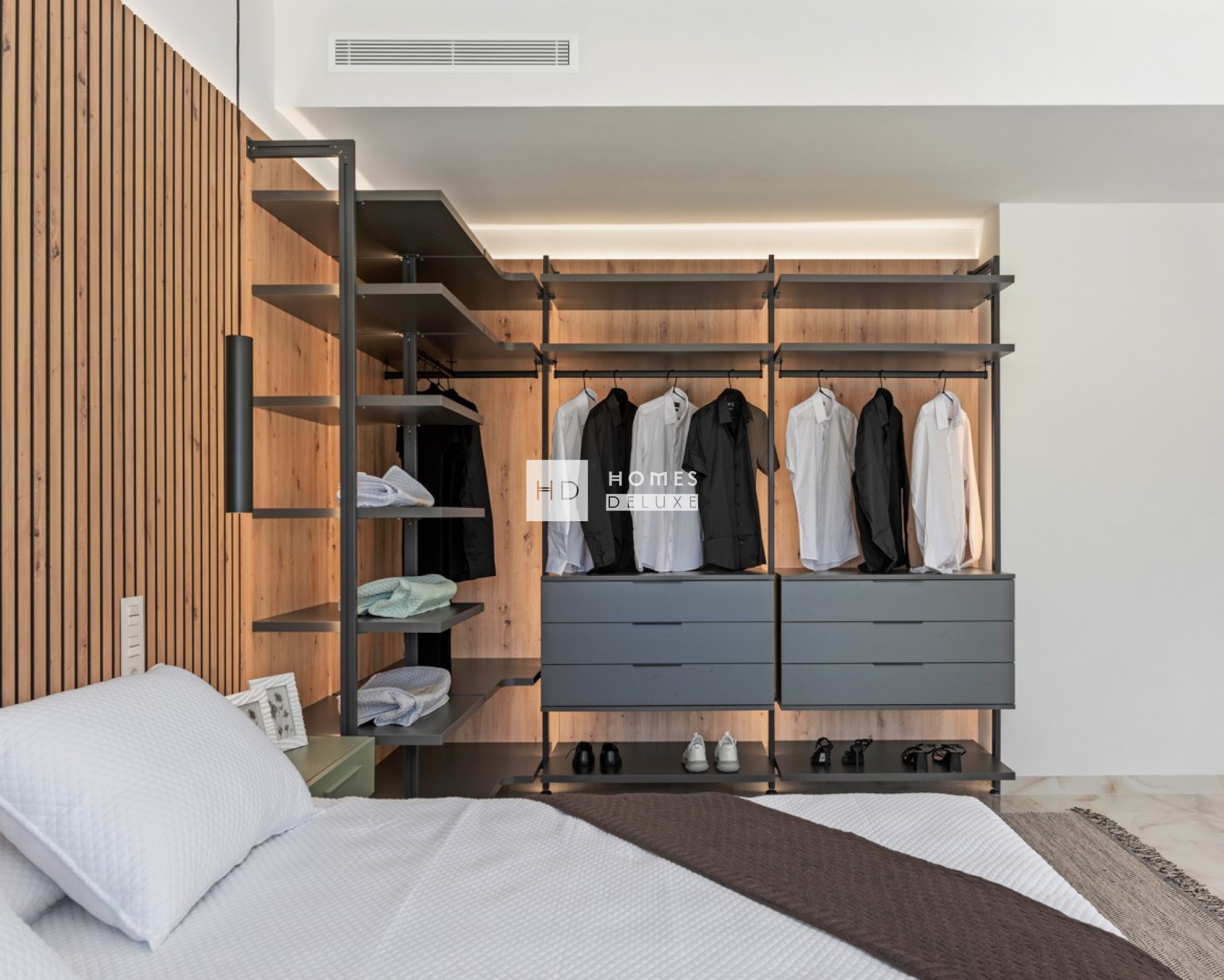 La distribución interior consta de un vestíbulo de entrada que conduce al luminoso y espacioso salón comedor diáfano, con grandes ventanas que se abren completamente y se ocultan en la pared, unificando el espacio interior y exterior. Dentro de la zona de estar principal hay una elegante cocina moderna totalmente equipada, de estilo americano, con armarios altos y bajos, y una isla central con zona de desayuno. Al otro lado de la villa se encuentra la impresionante suite principal, con un amplio dormitorio, cuarto de baño en suite y vestidor. Hay otras dos habitaciones dobles de buen tamaño y un cuarto de baño independiente para invitados. Cada habitación tiene acceso a la terraza principal con vistas a la piscina privada a través de una puerta acristalada. Hay mucho espacio exterior para disfrutar, con una gran terraza y un jardín con piscina privada, perfecto para relajarse y recibir a familiares y amigos en el maravilloso clima español. La escalera exterior situada en el lateral de la propiedad conduce a la amplia azotea de 150 m2 con cocina de verano y pérgola bioclimática, una extensión perfecta del espacio exterior para disfrutar del sol durante todo el día y de comidas al aire libre.