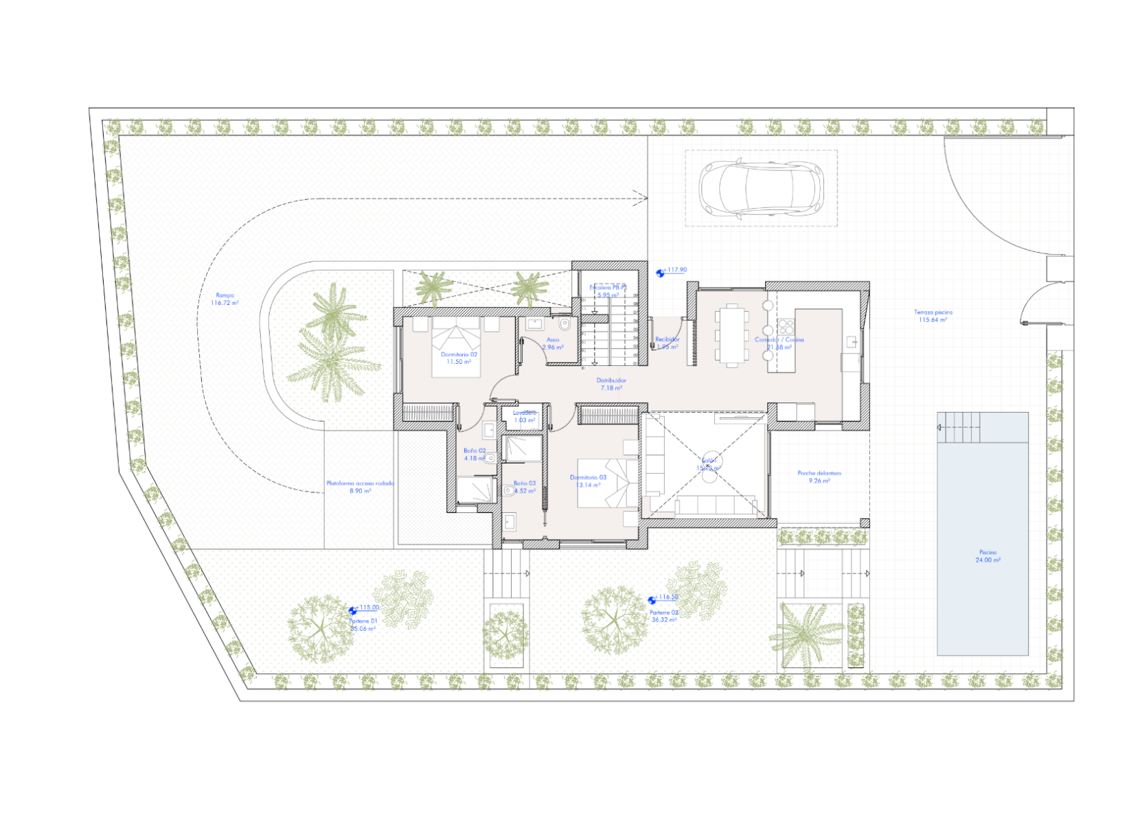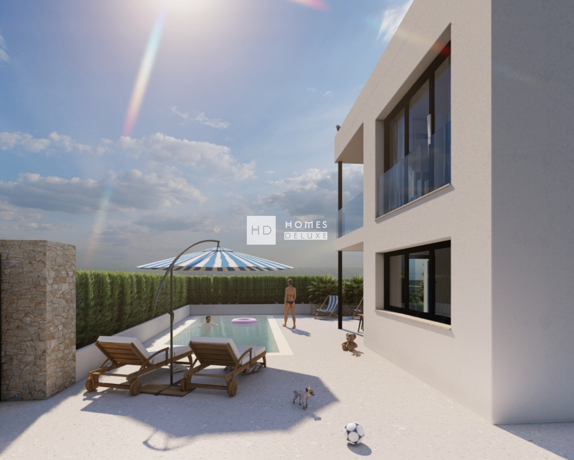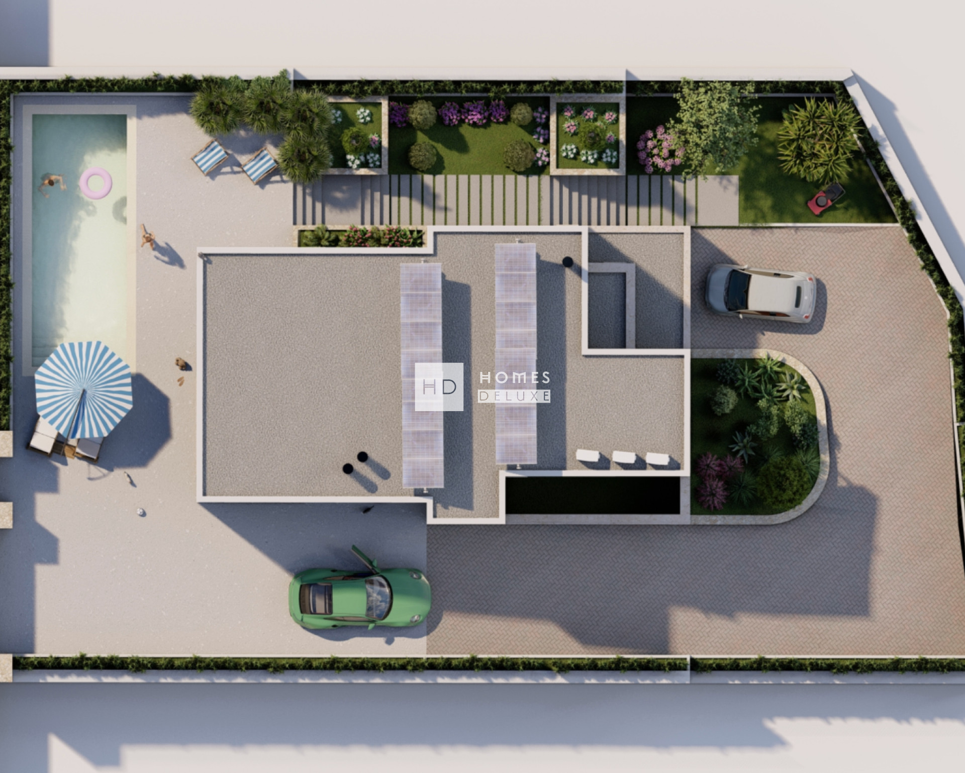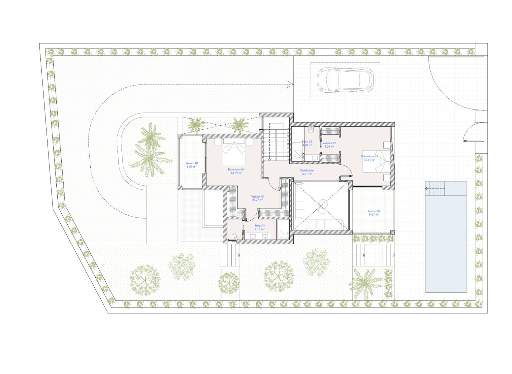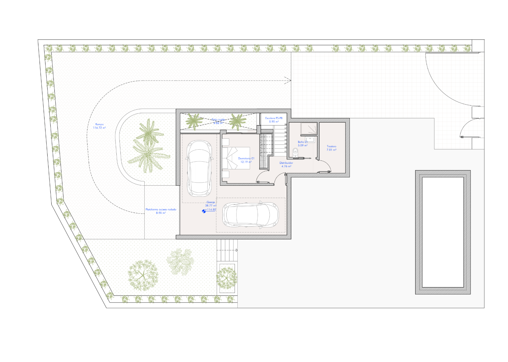 Este proyecto de villa en particular ofrece una impresionante propiedad de 5 dormitorios y 5,5 baños distribuidos en dos plantas, con un sótano adicional donde se encuentra el garaje privado. La distribución interior consta de un vestíbulo de entrada que conduce al luminoso y espacioso salón-comedor diáfano, con techos altos y grandes ventanales que dan a la terraza exterior. Dentro de la sala de estar principal hay una gran cocina con amplio espacio de almacenamiento y encimeras, y también hay un práctico aseo para invitados. La planta baja también incluye dos dormitorios dobles de buen tamaño, ambos con baño en suite. La escalera interior conduce a la primera planta, donde se encuentra la impresionante suite principal con un gran dormitorio, baño en suite y un vestidor extragrande. La suite principal también cuenta con su propia terraza privada. La primera planta también incluye otro dormitorio en suite con cuarto de baño, vestidor y acceso a su propia terraza privada. El sótano de la propiedad amplía aún más el espacio habitable con otro dormitorio doble y un cuarto de baño independiente para invitados, muy útil para familias numerosas o cuando vienen invitados. El sótano tiene luz natural y ventilación gracias al patio inglés, y también tiene acceso directo al espacioso garaje para dos vehículos y un trastero.