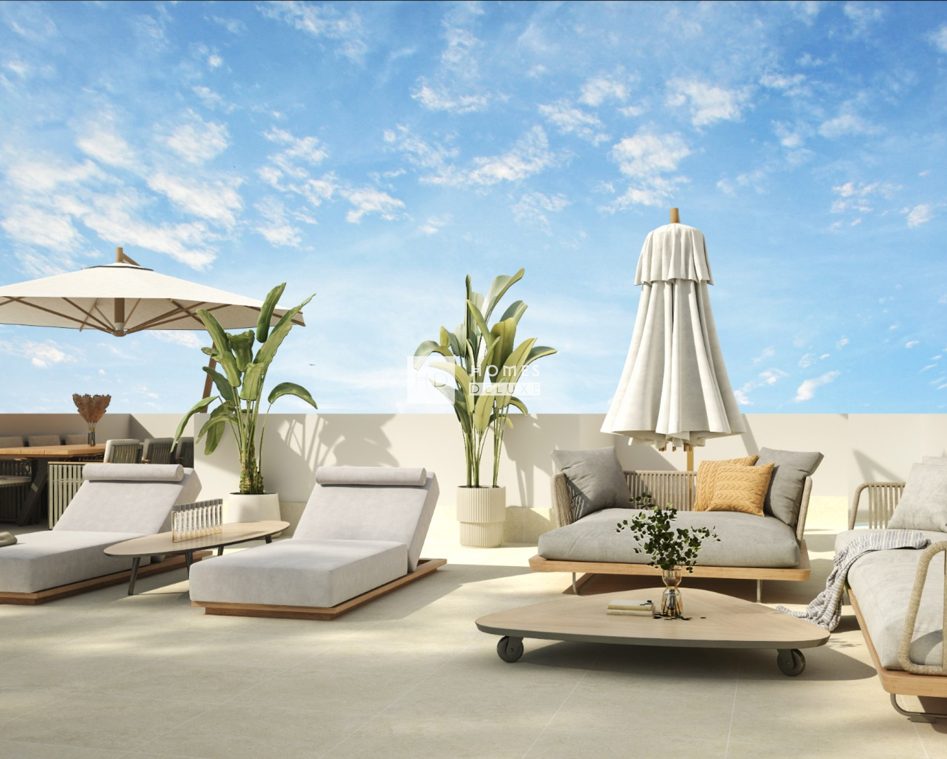 Cada villa cuenta con 3 dormitorios y 2 baños completamente equipados, diseñados con un hermoso estilo contemporáneo y un concepto de planta abierta. La distribución interior comprende un amplio salón y comedor con puertas que dan a la terraza. Dentro de la sala de estar principal hay una cocina moderna totalmente equipada de estilo americano con armarios lacados de alto brillo y encimeras de porcelana o similar. La cocina tiene puertas que dan a un patio y permiten la entrada de mucha luz natural. El amplio dormitorio principal incluye un cuarto de baño en suite con claraboya, y hay otros dos dormitorios dobles de buen tamaño. Todos los dormitorios tienen acceso mediante puertas acristaladas a la terraza principal delantera o al patio trasero de la propiedad. También hay un elegante cuarto de baño independiente para invitados. Una escalera exterior desde el patio trasero conduce a la amplia azotea de 72 m2 para aprovechar al máximo la vida al aire libre.