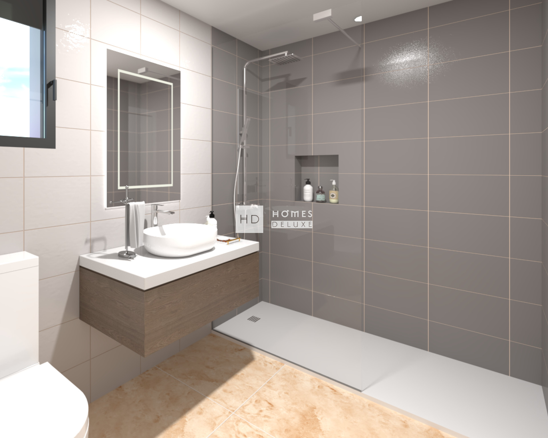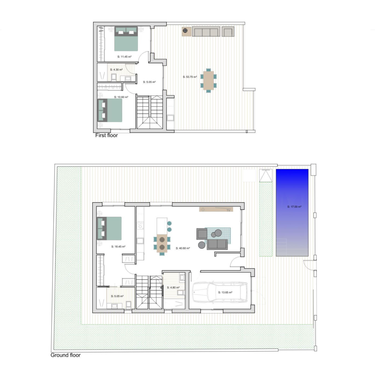 La villa tiene dos plantas y la distribución interior consta de un vestíbulo de entrada que conduce al luminoso y espacioso salón comedor de planta abierta, con grandes ventanales en todo el espacio que permiten la entrada de mucha luz natural y dan acceso a la terraza y al jardín. Dentro de la sala de estar principal hay una cocina americana totalmente equipada con isla central acabada en color Toria Walnut o similar, con encimera Silestone en color crema o similar. La planta baja también incluye el impresionante dormitorio principal con baño en suite y vestidor, y también hay un baño de invitados independiente. La escalera interior conduce a la primera planta, donde hay otros dos dormitorios dobles de buen tamaño y un cuarto de baño familiar. La primera planta cuenta con un amplio solárium de 54 m2 con cocina de verano, perfecto para disfrutar de comidas al aire libre. El solárium permite ampliar el espacio exterior del jardín privado y la terraza de la planta baja, aprovechando al máximo la vida al aire libre en España.