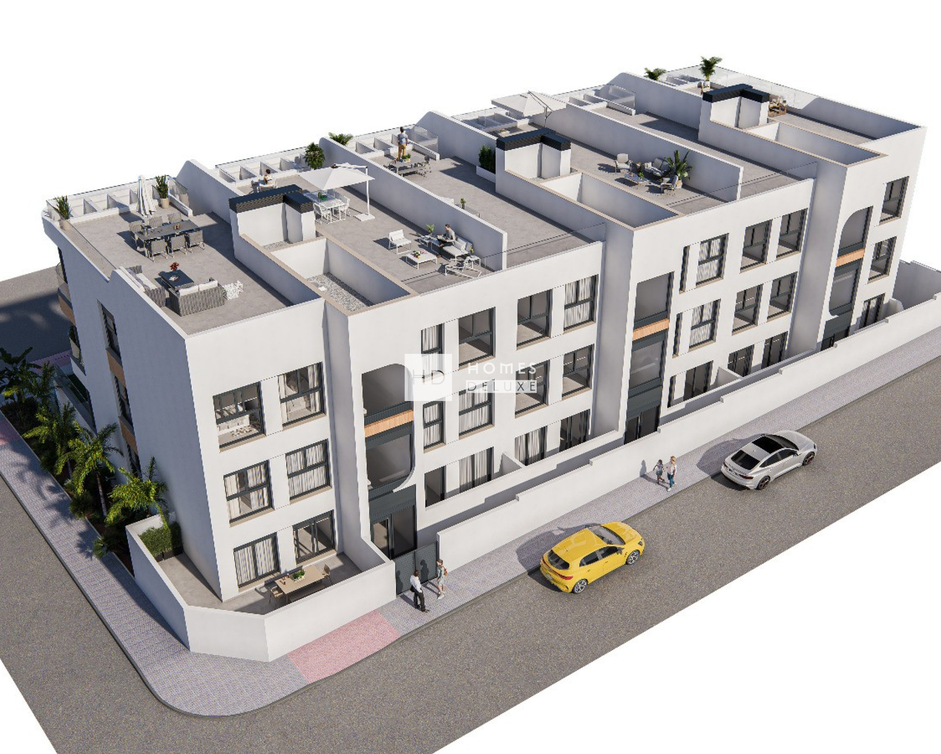 Diseñadas para ofrecer el máximo confort, con espacios modernos y funcionales. La distribución interior consta de un vestíbulo de entrada que conduce al espacioso salón y comedor de planta abierta con una moderna cocina de estilo americano con muebles altos y bajos, así como una isla central, todo ello acabado en melamina blanca combinada con melamina de madera. Hay detalles exclusivos como un innovador mueble de TV giratorio y un elegante asiento en la ventana para disfrutar de las vistas. El gran dormitorio principal incluye un baño en-suite y vestidor, además de tener acceso a la terraza. Hay otros dos dormitorios dobles de buen tamaño y un cuarto de baño independiente para invitados. Los áticos tienen una escalera exterior en la terraza que conduce a la amplia azotea solarium con pre-instalación para una cocina de verano, ideal para disfrutar del sol todo el día. Las viviendas incluyen preinstalación de aire acondicionado por conductos, placa de inducción y campana extractora en la cocina, armarios empotrados y persianas eléctricas en todos los dormitorios, iluminación LED interior y exterior, aparcamiento subterráneo y trastero.