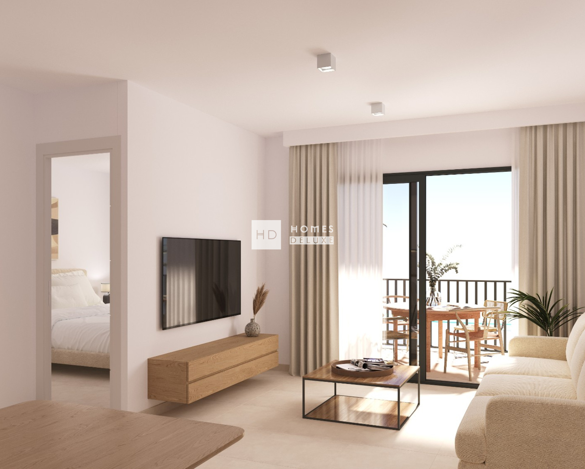 Hay varias opciones de apartamentos de 2 dormitorios entre las que elegir: 2 dormitorios y 1 baño, 2 dormitorios, 1 baño y un aseo de invitados, y 2 dormitorios y 2 baños. La distribución interior consta de un salón y un comedor diáfanos con puertas acristaladas que dan a la terraza, y dentro de la sala de estar principal hay una moderna cocina de estilo americano. Hay un amplio dormitorio principal con baño en suite (en las opciones de 2 dormitorios y 2 baños), otro dormitorio doble, todos los dormitorios incluyen armarios empotrados y hay un baño independiente. El proyecto combina arquitectura moderna, comodidad y una ubicación privilegiada: una oportunidad única para vivir o invertir en una de las zonas más deseadas de la Costa Blanca.