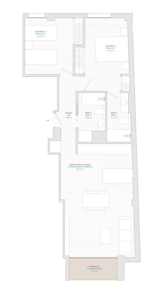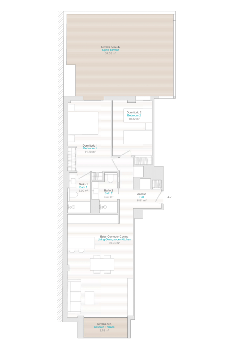 La distribución interior consta de un vestíbulo de entrada que conduce al amplio salón y comedor de planta abierta con grandes ventanales que dan a la terraza. Dentro de la sala de estar principal hay una cocina moderna de estilo americano totalmente equipada con armarios de gran capacidad en la pared y en la base, así como una isla central. El amplio dormitorio principal incluye un cuarto de baño en suite con un amplio espacio para guardar ropa. Hay otro dormitorio doble de buen tamaño y un cuarto de baño independiente para invitados. Las opciones de ático tienen una escalera interior que conduce al amplio solárium de la azotea, lo que amplía aún más el espacio exterior.
