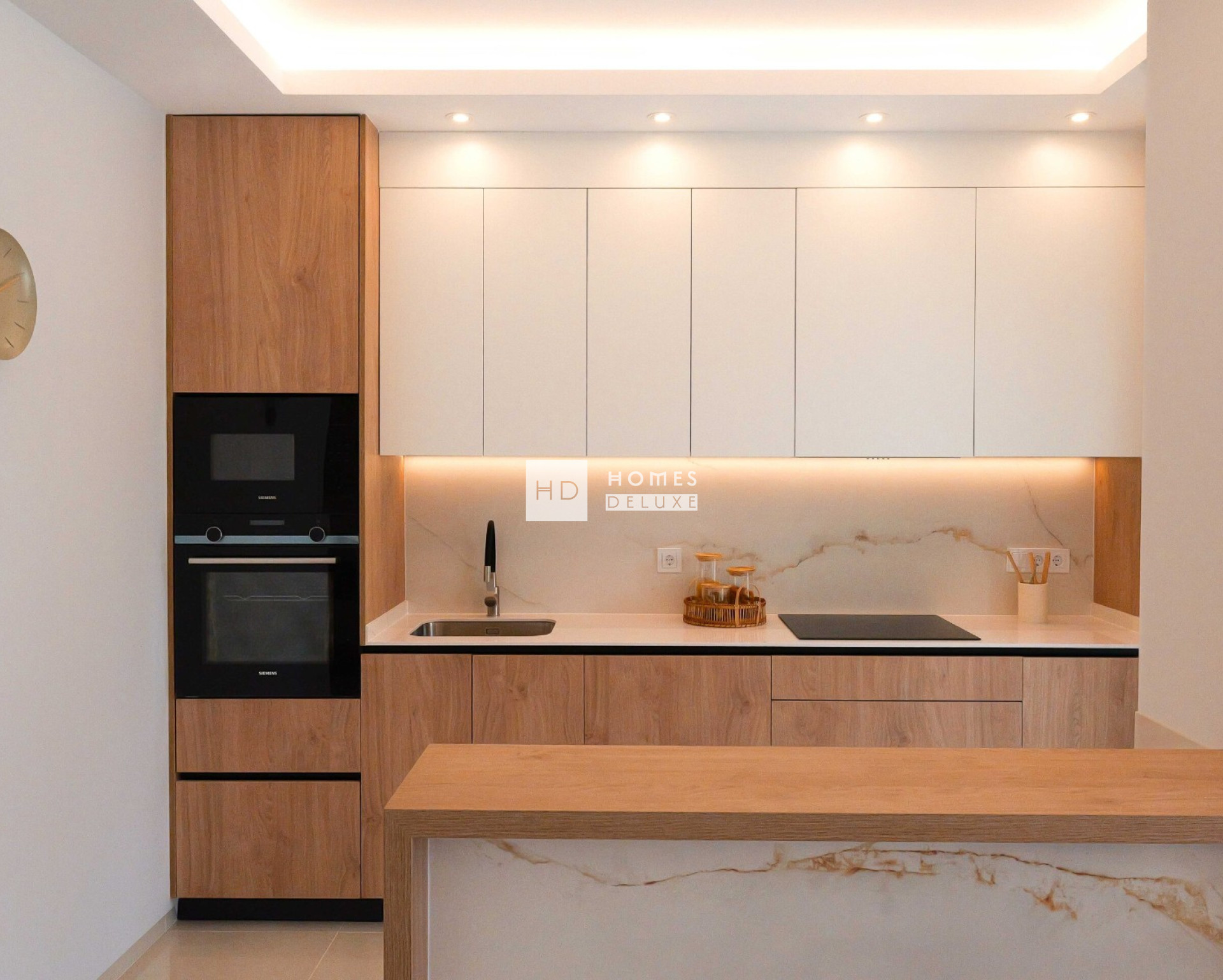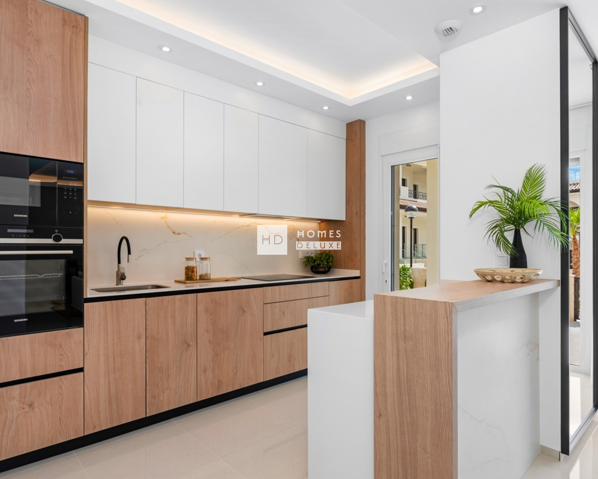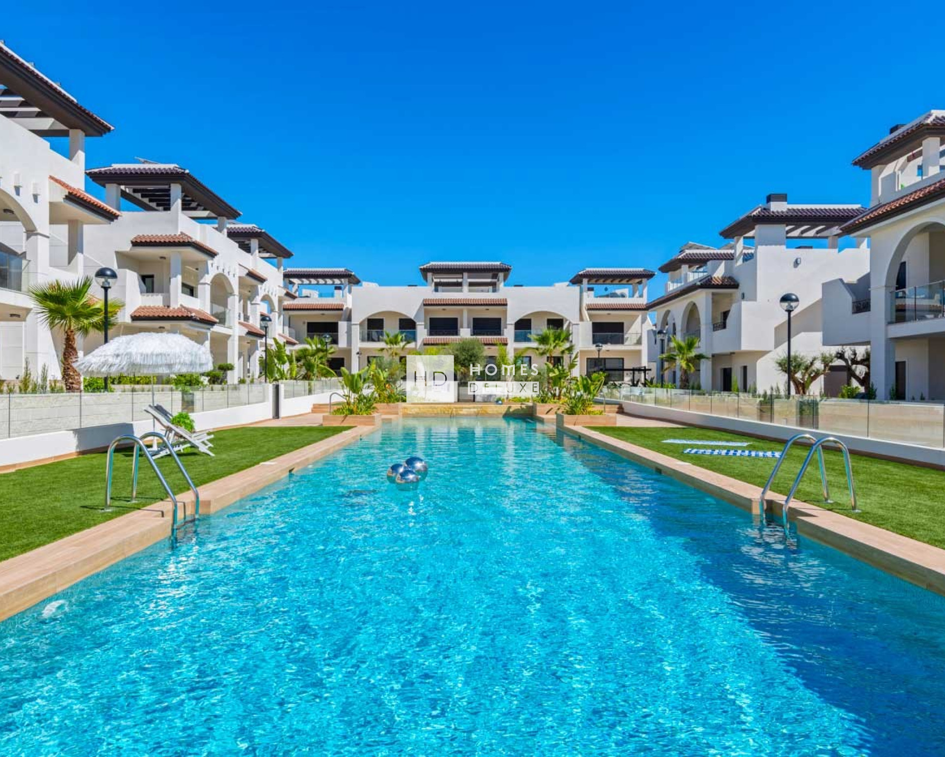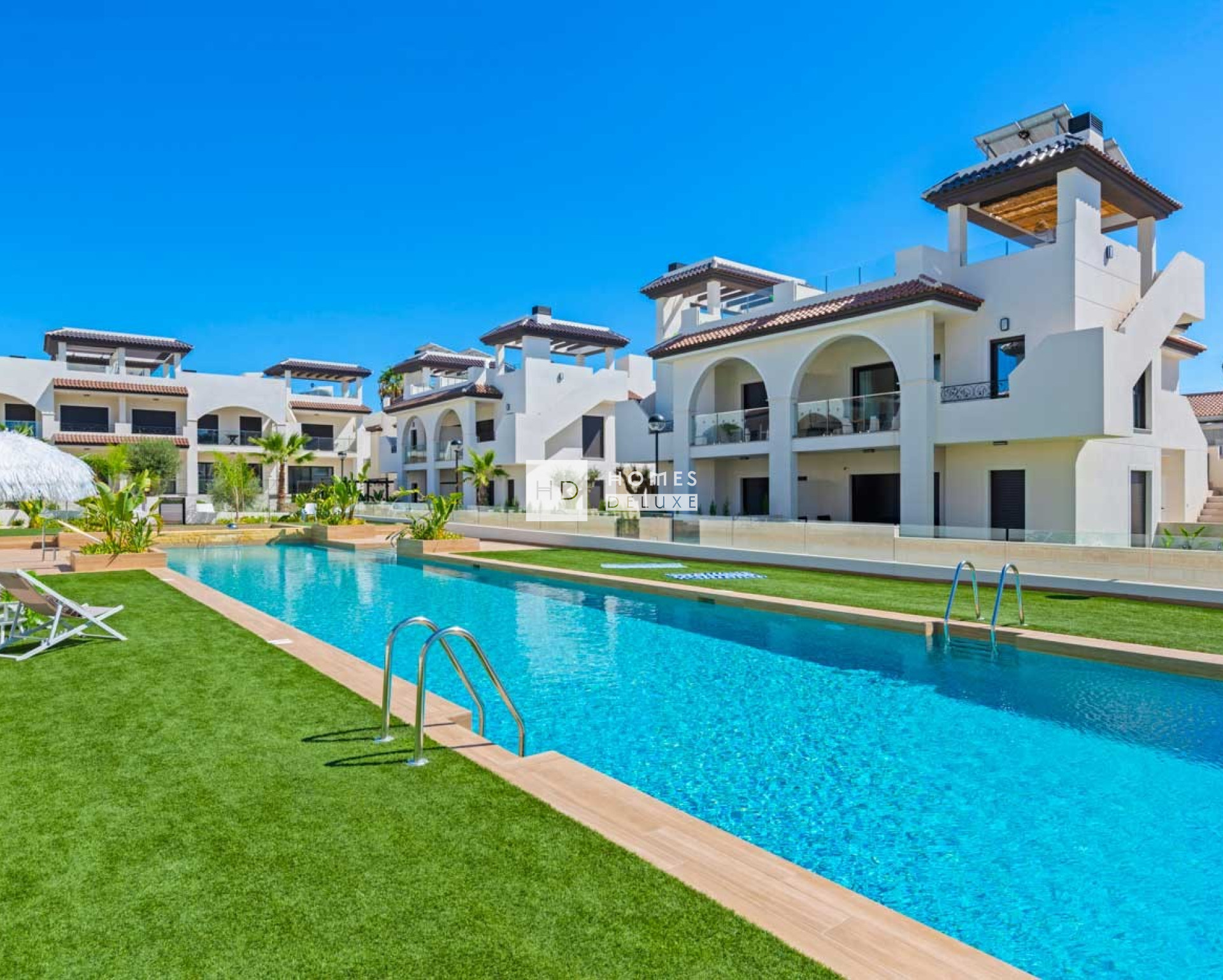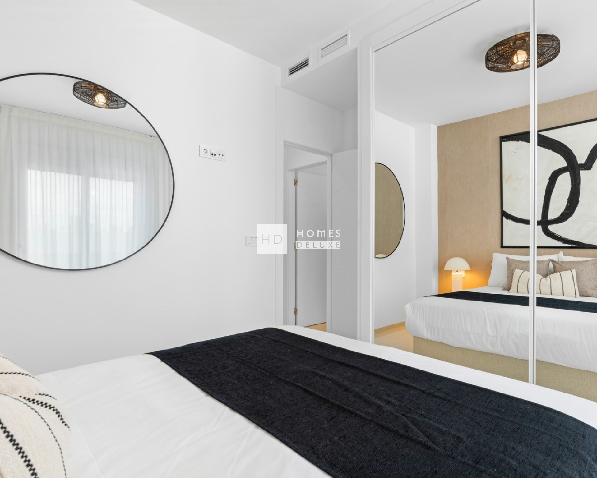 El complejo le ofrece la posibilidad de elegir entre apartamentos en la planta baja con un amplio jardín privado y terraza o apartamentos en la última planta con un gran solárium en la azotea. La distribución interior consta de un vestíbulo de entrada que conduce al luminoso y espacioso salón-comedor diáfano con ventanas que dan a la terraza. Dentro de la zona de estar principal hay una cocina de estilo americano con armarios bajos y altos, así como una barra de desayuno. El amplio dormitorio principal cuenta con un cuarto de baño en suite. También hay otro dormitorio doble de buen tamaño y un cuarto de baño independiente para invitados. Los apartamentos de la última planta tienen una escalera exterior en la terraza que conduce al amplio solárium de 75 m² en la azotea para disfrutar del sol durante todo el día. Las propiedades incluyen preinstalación de aire acondicionado por conductos, armarios empotrados en todos los dormitorios, persianas eléctricas, sistema de intercomunicación y aparcamiento privado.