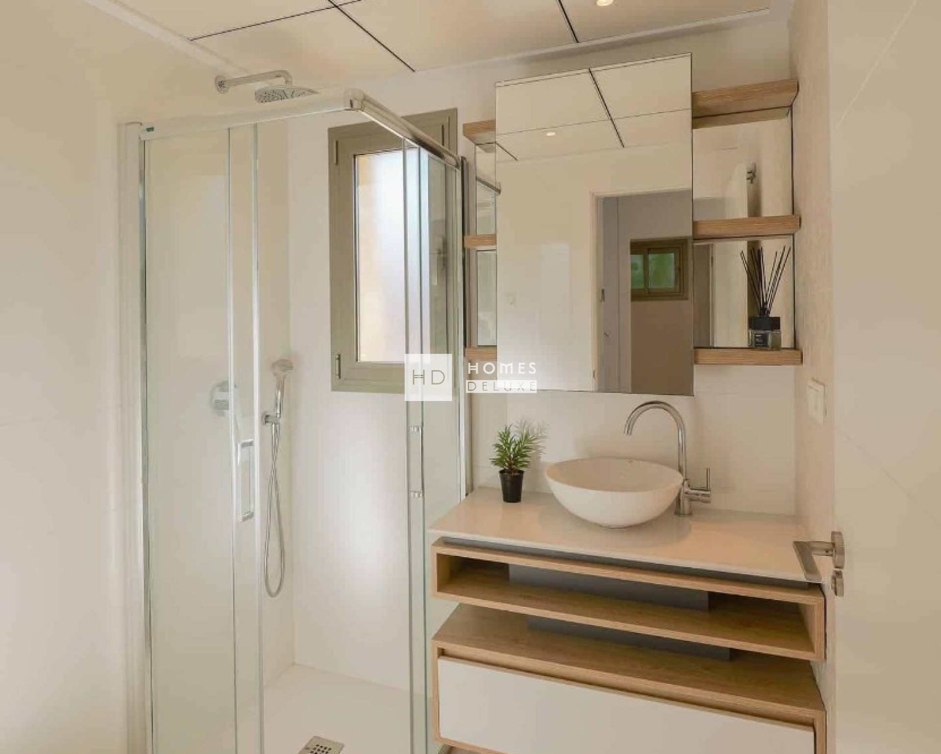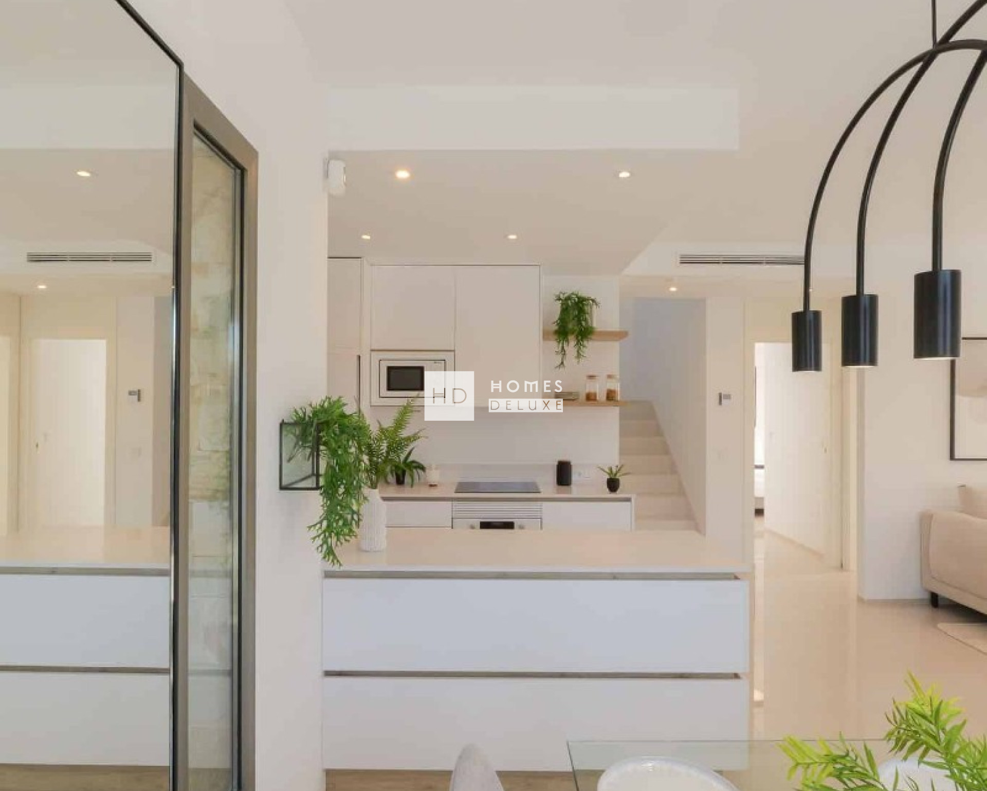 Las villas se distribuyen en dos plantas y la distribución interior incluye un salón-comedor diáfano, amplio y luminoso, con grandes ventanales que dejan entrar mucha luz natural y dan acceso a la terraza y al jardín. Dentro de la zona de estar principal hay una moderna cocina de estilo americano con isla central y un práctico armario lavadero debajo de las escaleras. La planta baja también cuenta con un dormitorio doble con armarios empotrados y un cuarto de baño independiente para invitados. La escalera interior conduce a la primera planta, donde se encuentra el amplio dormitorio principal con baño en suite y puertas acristaladas que dan a la preciosa terraza soleada. En la primera planta hay otro dormitorio doble de buen tamaño con baño en suite. Se accede al solárium de la azotea a través de la escalera interior de la vivienda. Las viviendas cuentan con preinstalación de aire acondicionado y calefacción por suelo radiante en los baños.