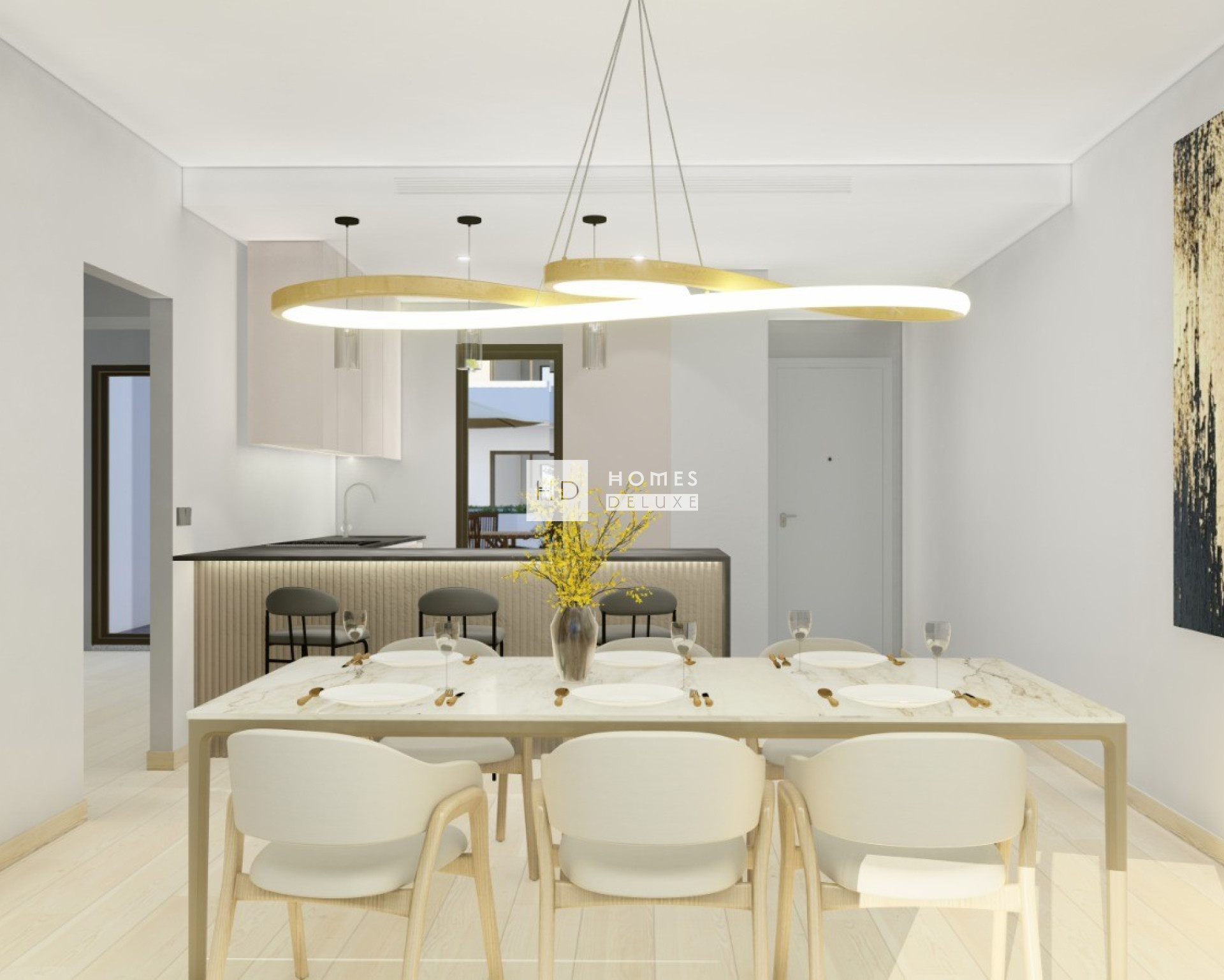 La distribución interior consta de un vestíbulo de entrada que da acceso al amplio salón-comedor diáfano, con grandes ventanales que se abren a la terraza. Dentro de la zona de estar principal se encuentra una moderna cocina de estilo americano con armarios altos y bajos, y hay un práctico lavadero independiente. El amplio dormitorio principal cuenta con puertas acristaladas que dan a la terraza e incluye un cuarto de baño en suite y armarios empotrados. Hay otros dos dormitorios dobles de buen tamaño con armarios empotrados y un cuarto de baño de invitados independiente. Las opciones de áticos cuentan con una escalera exterior junto a la puerta principal que conduce al solárium de la azotea de 113 m², y los bungalós de la última planta tienen una escalera exterior en la terraza que da acceso al solárium de la azotea de algo más de 130 m².