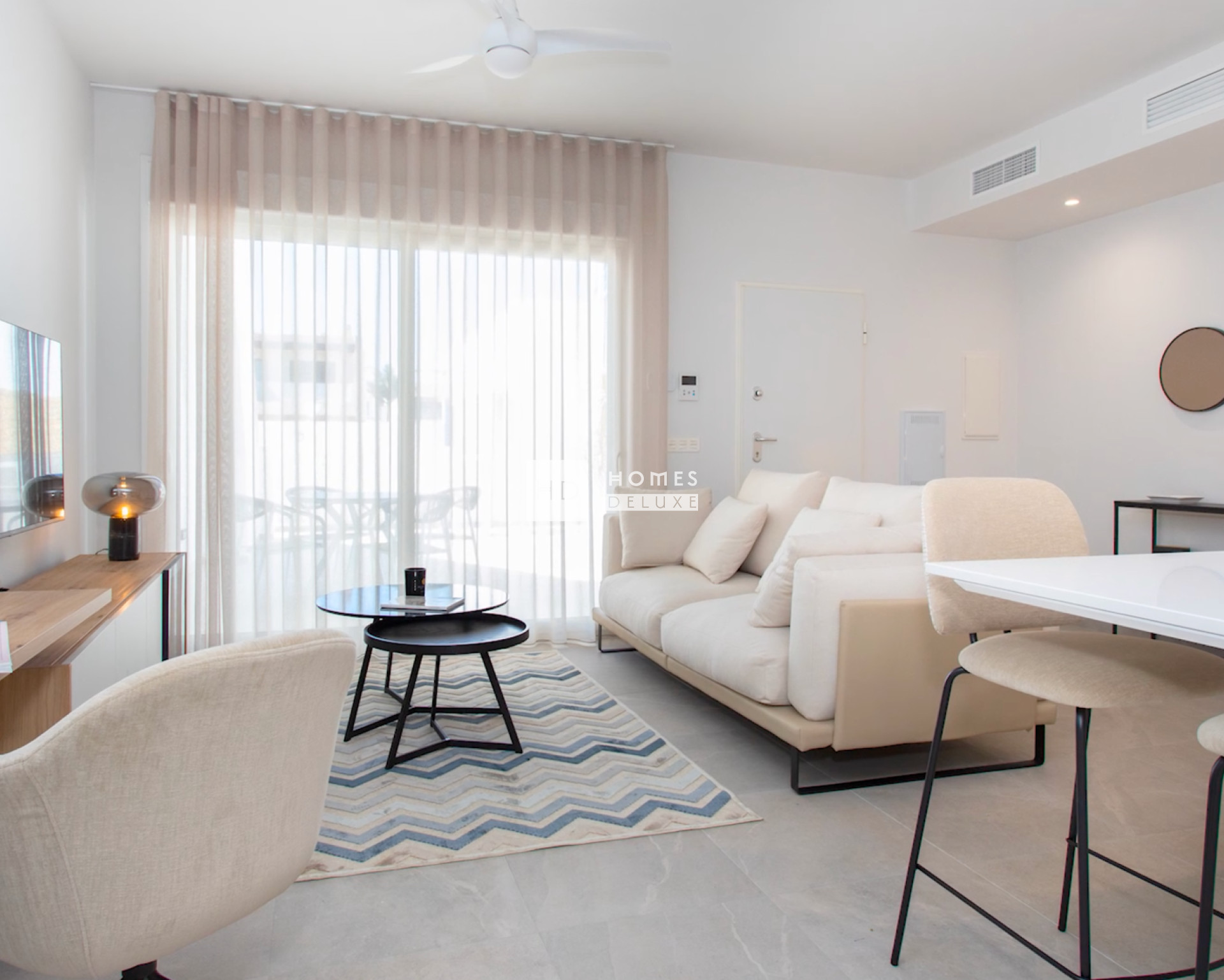La distribución interior incluye un amplio salón-comedor diáfano con grandes ventanales que dan a la terraza privada. Dentro de la zona de estar principal hay una cocina americana totalmente equipada con barra de desayuno (dependiendo del modelo de apartamento, algunos incluyen un lavadero independiente). El amplio dormitorio tiene una puerta acristalada que da acceso a la terraza e incluye un cuarto de baño en suite. Los apartamentos de la planta superior cuentan con una escalera exterior en la terraza que conduce a la amplia terraza solárium de la azotea, donde se puede disfrutar del sol durante todo el día.