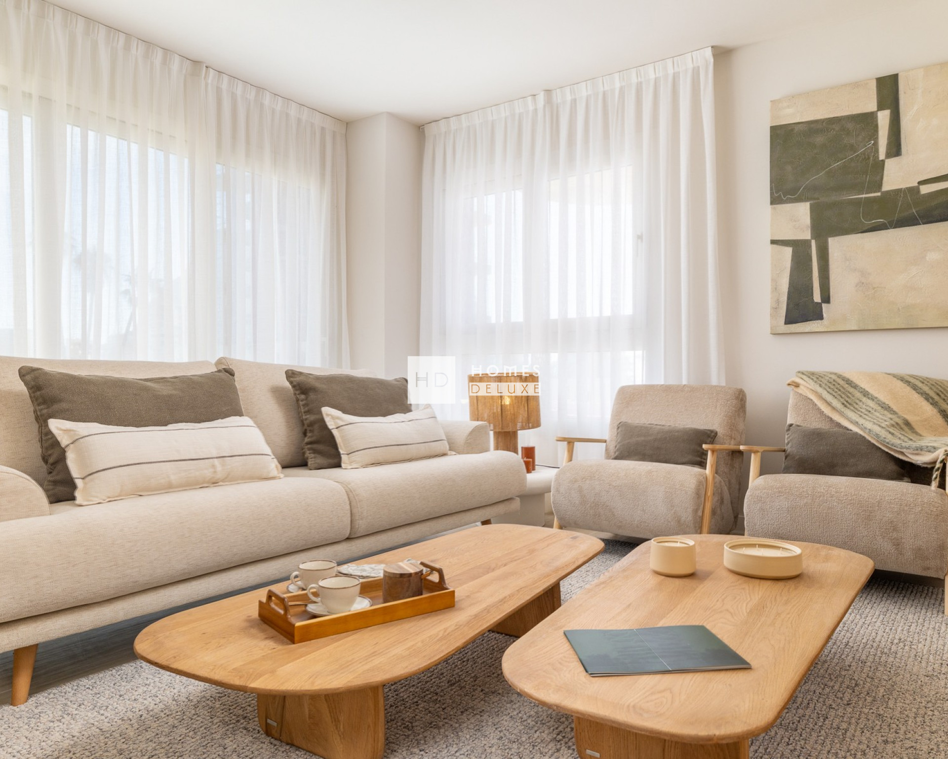 La distribución interior consta de un vestíbulo de entrada que da paso a un luminoso y espacioso salón-comedor diáfano, con grandes ventanales que se abren a la terraza privada. Dentro de la zona de estar principal hay una moderna cocina americana totalmente equipada, con armarios superiores e inferiores en acabado blanco, y cuenta además con un práctico lavadero independiente. El amplio dormitorio principal incluye un cuarto de baño en suite; hay otro dormitorio doble de buen tamaño y un cuarto de baño independiente para invitados. Los áticos cuentan con una escalera interior que conduce a la amplia terraza solárium de la azotea, donde se puede disfrutar del sol durante todo el día y contemplar las maravillosas vistas panorámicas. Las viviendas incluyen aire acondicionado por conductos, electrodomésticos de cocina de acero inoxidable (horno eléctrico, placa de inducción, campana extractora, frigorífico-congelador, lavavajillas integrado), armarios empotrados en todos los dormitorios, toallero eléctrico en los baños, aparcamiento subterráneo y trastero.