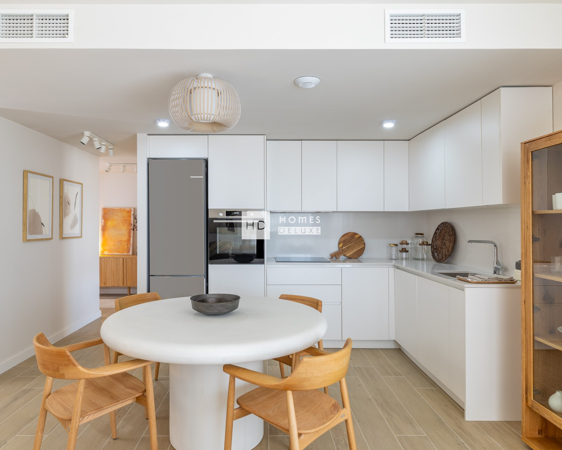 La distribución interior consta de un vestíbulo de entrada que da paso a un luminoso y espacioso salón-comedor diáfano, con grandes ventanales que se abren a la terraza privada. Dentro de la zona de estar principal hay una moderna cocina americana totalmente equipada, con armarios superiores e inferiores en acabado blanco, y cuenta además con un práctico lavadero independiente. El amplio dormitorio principal incluye un cuarto de baño en suite; hay otros dos dormitorios de buen tamaño y un cuarto de baño de invitados independiente. Los áticos cuentan con una escalera interior que conduce a la amplia terraza solárium de la azotea, donde se puede disfrutar del sol durante todo el día y contemplar las maravillosas vistas panorámicas. Las viviendas incluyen aire acondicionado por conductos, electrodomésticos de cocina de acero inoxidable (horno eléctrico, placa de inducción, campana extractora, frigorífico-congelador, lavavajillas integrado), armarios empotrados en todos los dormitorios, toallero eléctrico en los baños, aparcamiento subterráneo y trastero.