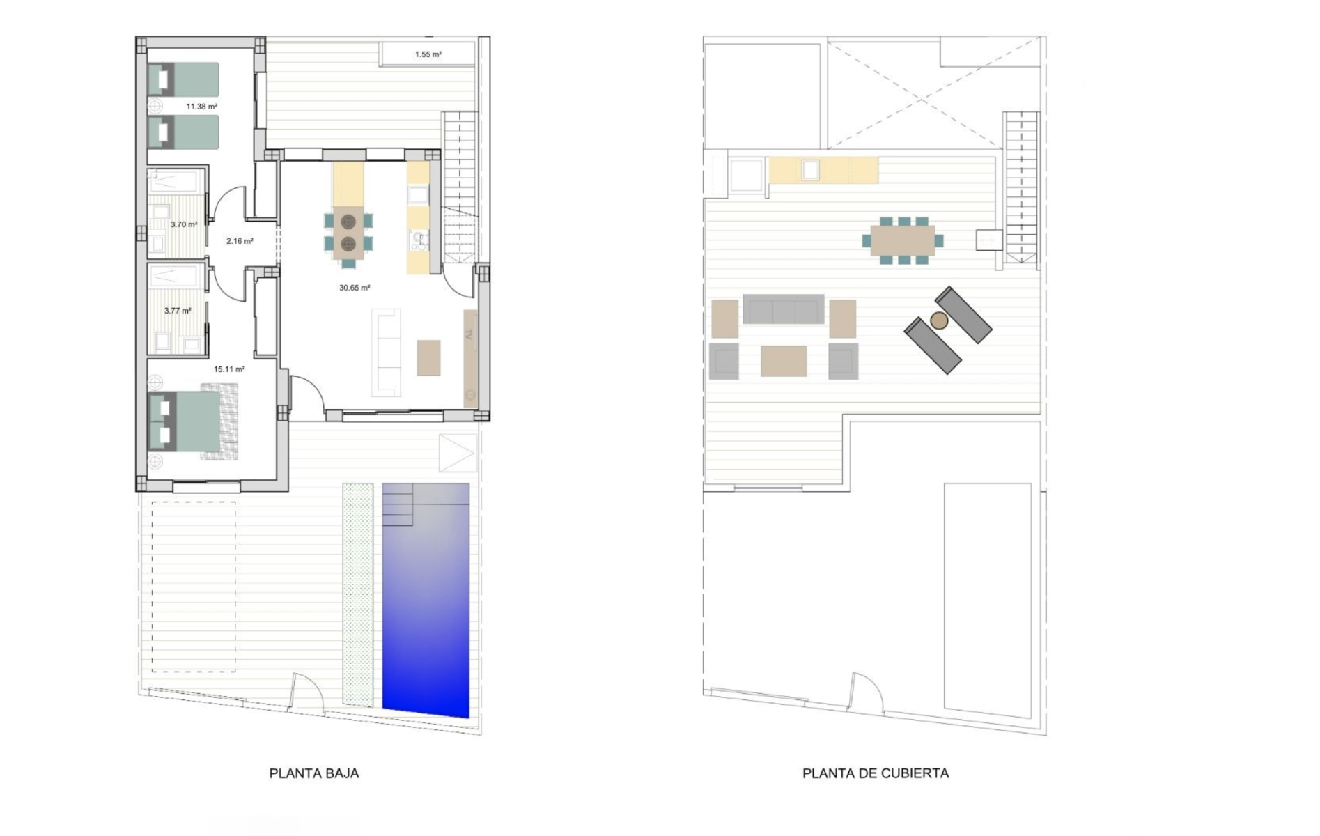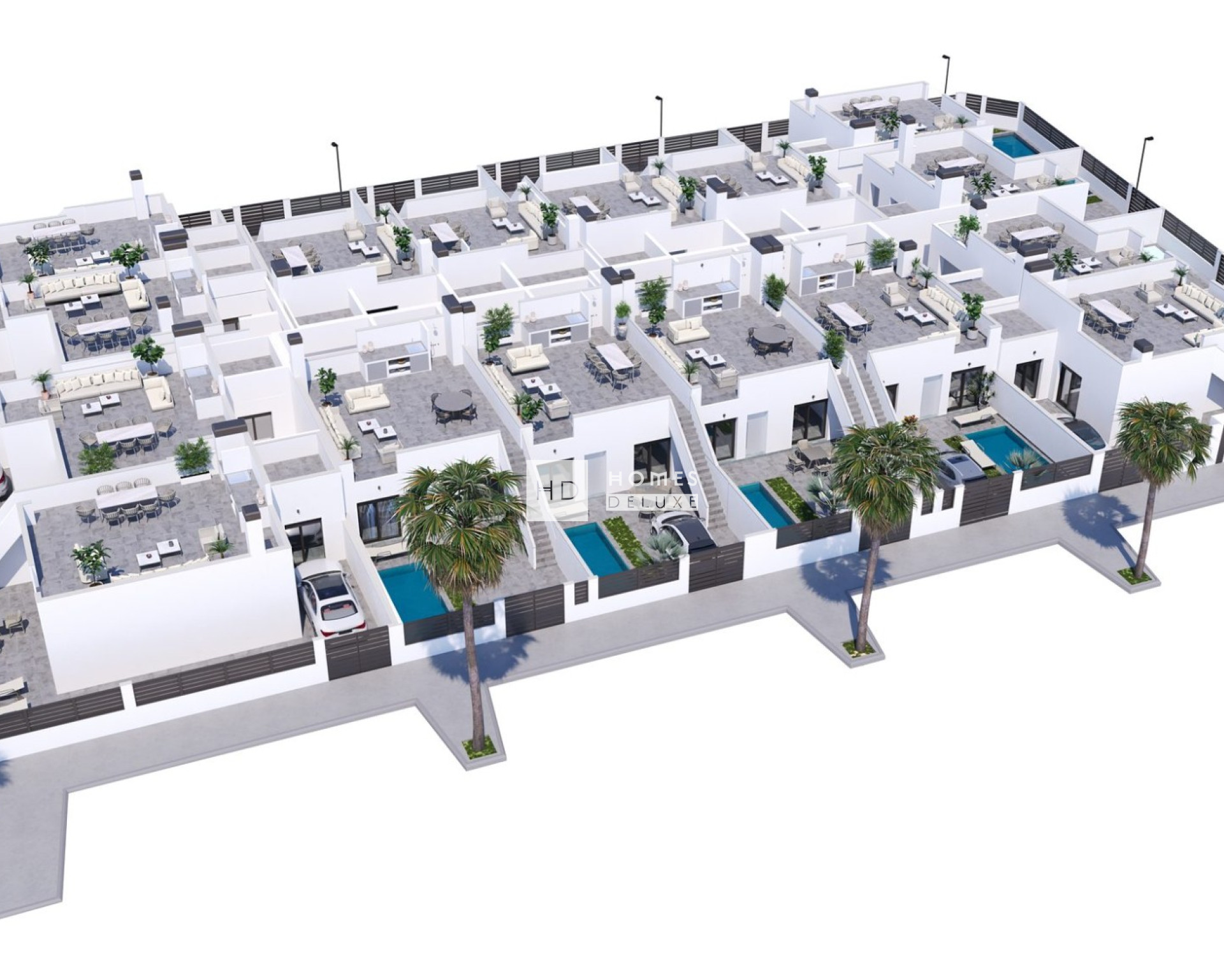 El proyecto consta de 16 villas adosadas de una sola planta, con un precioso jardín privado que incluye piscina privada y aparcamiento en la parcela. El espacio exterior se amplía aún más con un gran solárium en la azotea con cocina de verano, perfecto para disfrutar de comidas al aire libre y del sol durante todo el día.