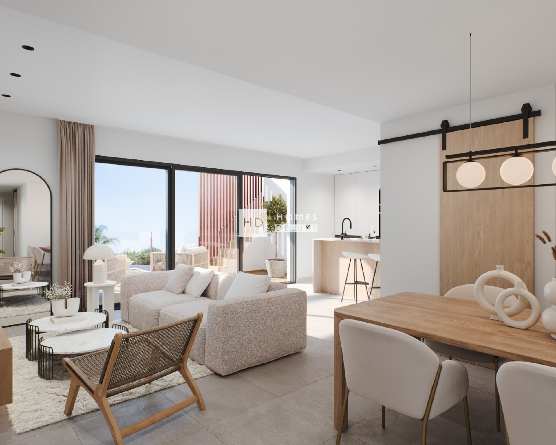 La distribución interior consta de un salón-comedor abierto con puertas que dan a la terraza, cocina americana moderna totalmente equipada (las opciones de la planta baja tienen acceso a la terraza trasera desde la cocina), dormitorio principal con baño en-suite, otros dos dormitorios dobles y un baño de invitados. Las opciones de la planta superior tienen una escalera exterior desde la terraza que da acceso al amplio solarium de la azotea para disfrutar del sol durante todo el día.