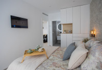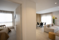 Les aménagements intérieurs comprennent un salon et une salle à manger spacieux avec de grandes portes-fenêtres donnant accès à la terrasse, une cuisine américaine entièrement équipée, une chambre principale avec salle de bains privative, deux autres chambres doubles et une salle de bains séparée pour les invités. Les propriétés comprennent la climatisation, le chauffage au sol dans les salles de bains, des appareils électroménagers de Bosch ou Siemens, des éclairages LED intérieurs et extérieurs, des volets électriques et un parking souterrain privé équipé d'une borne de recharge pour véhicule électrique et d'une salle de stockage. Les appartements penthouse comprennent également les éléments suivants : solarium privé, toilettes, pergola, barbecue électrique, cuisine d'été, gazon artificiel, douche extérieure et pré-installation pour un jacuzzi. En option, un ensemble de meubles de haute qualité est disponible pour tous les types d'appartements.