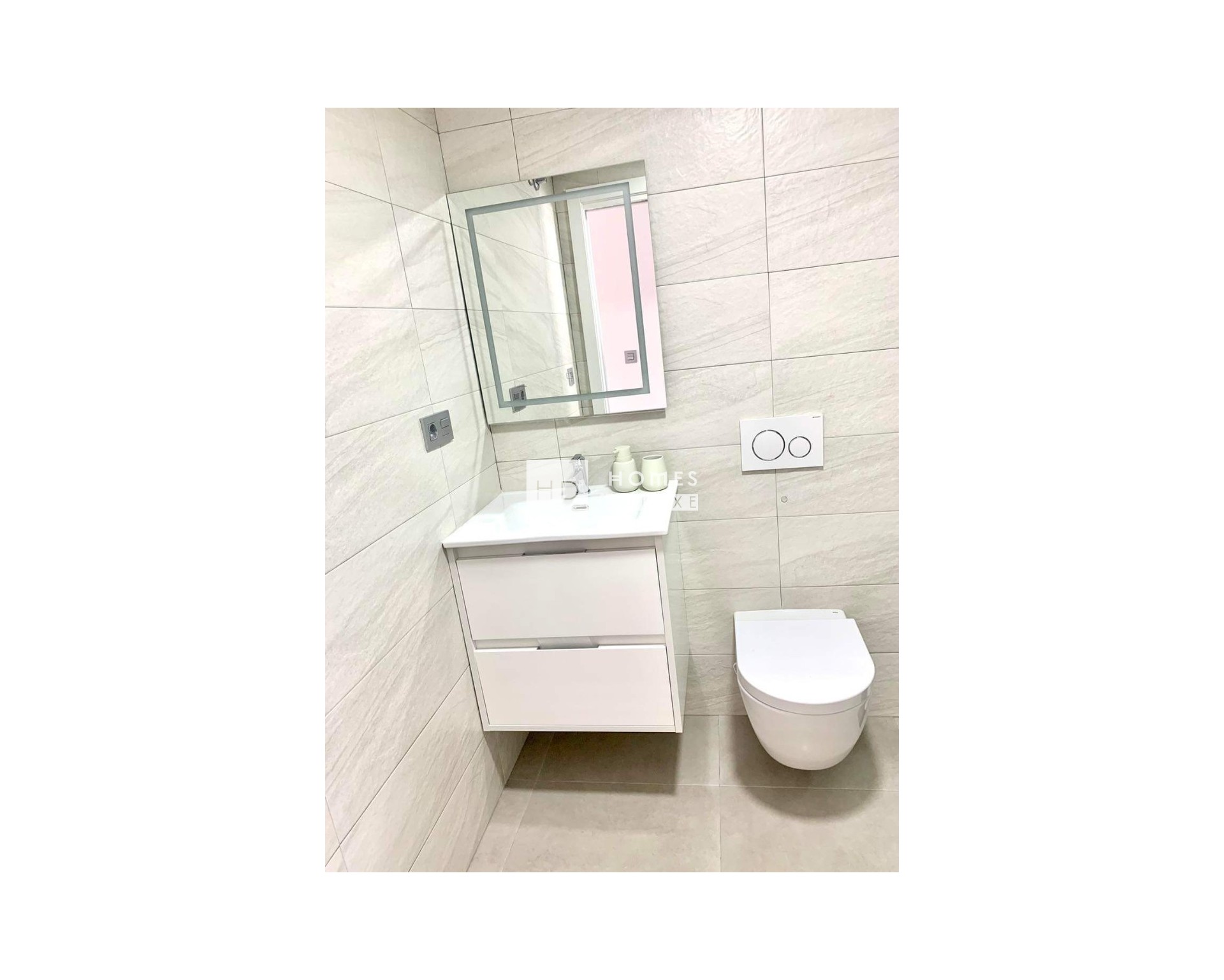 L'aménagement intérieur comprend un salon et une salle à manger spacieux avec de grandes portes-fenêtres donnant accès à la terrasse, une cuisine américaine moderne entièrement équipée, une chambre principale avec salle de bains privative et porte-fenêtre donnant accès à la terrasse, une autre chambre double et une salle de bains séparée pour les invités. Les appartements du dernier étage comprennent une autre chambre double et disposent d'un escalier extérieur sur la terrasse menant au vaste solarium sur le toit de près de 76 m2 pour profiter du soleil tout au long de la journée.
