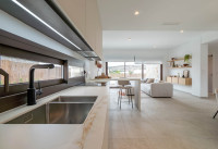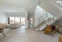 L'aménagement intérieur comprend un hall d'entrée menant à un salon et une salle à manger spacieux et lumineux qui s'harmonise parfaitement avec la cuisine moderne entièrement équipée de style américain, conçue avec une finition blanche mate et des éléments muraux contrastés de couleur amazonienne, l'espace de vie offre une double orientation qui relie l'intérieur et les zones extérieures. Le rez-de-chaussée comprend également deux chambres doubles et une salle de bains séparée pour les invités. L'escalier intérieur mène au premier étage où se trouve la grande chambre principale avec sa salle de bains attenante et une buanderie séparée. Le couloir du premier étage et la chambre principale ont tous deux un accès direct à la vaste terrasse ensoleillée pour profiter du soleil toute la journée.