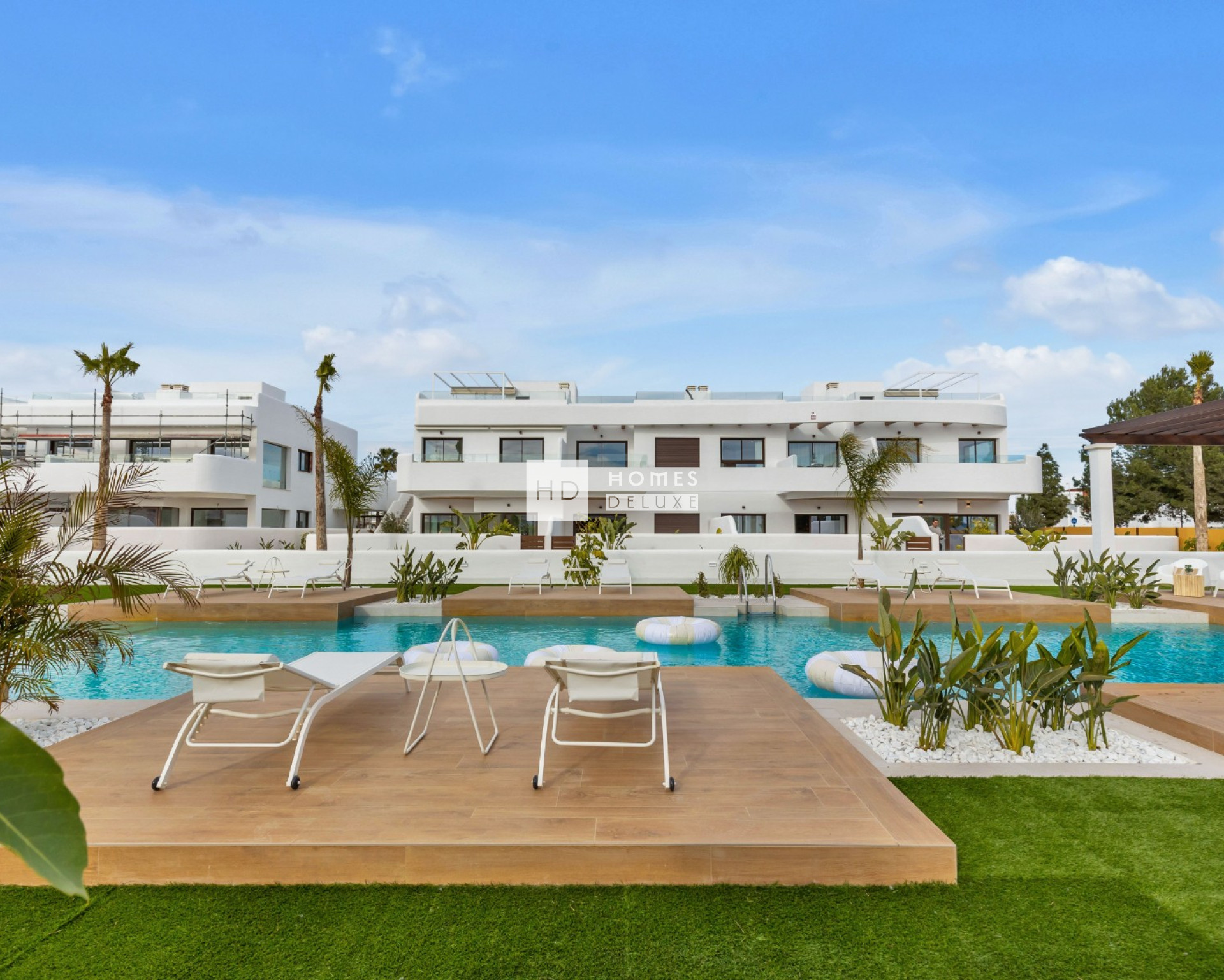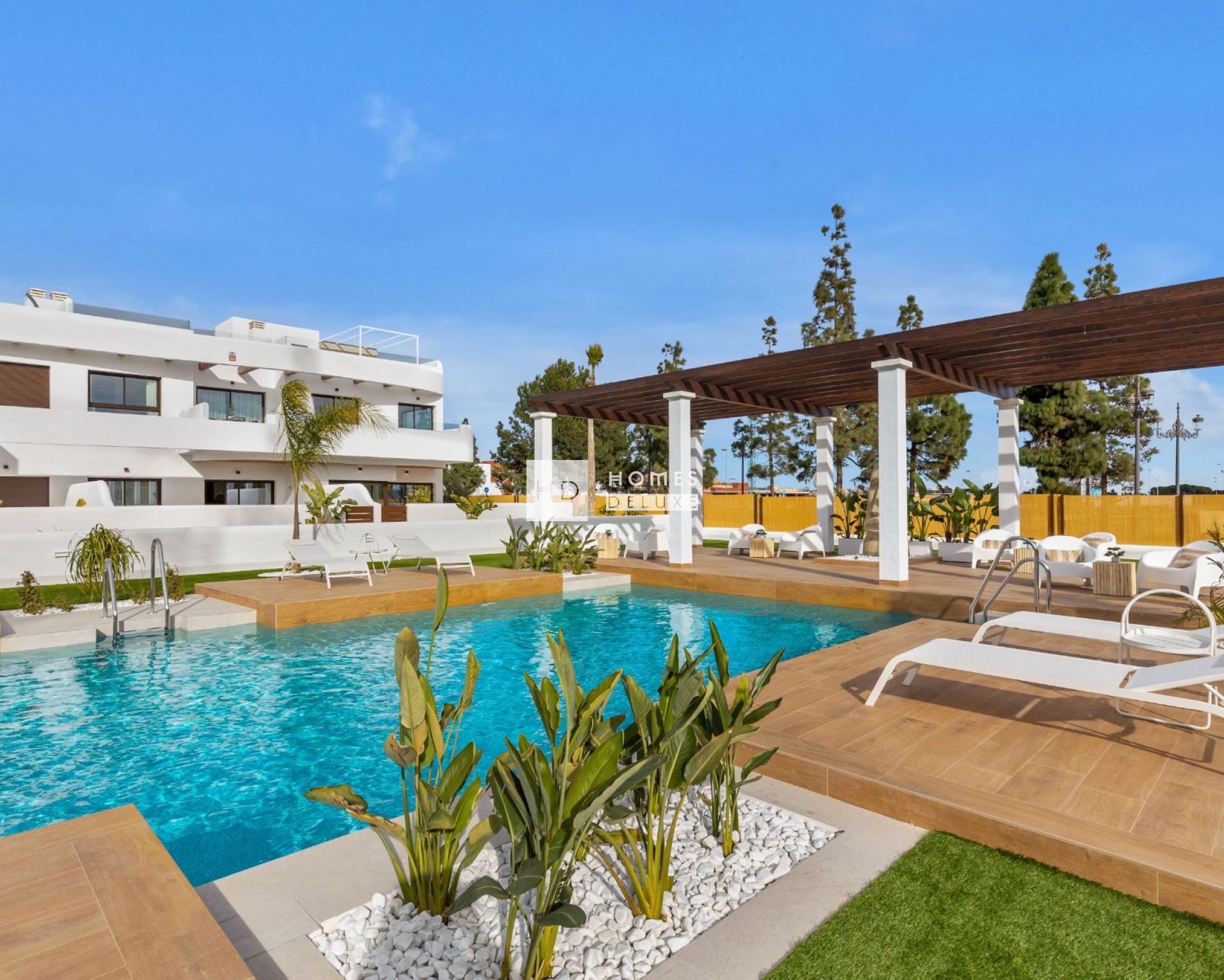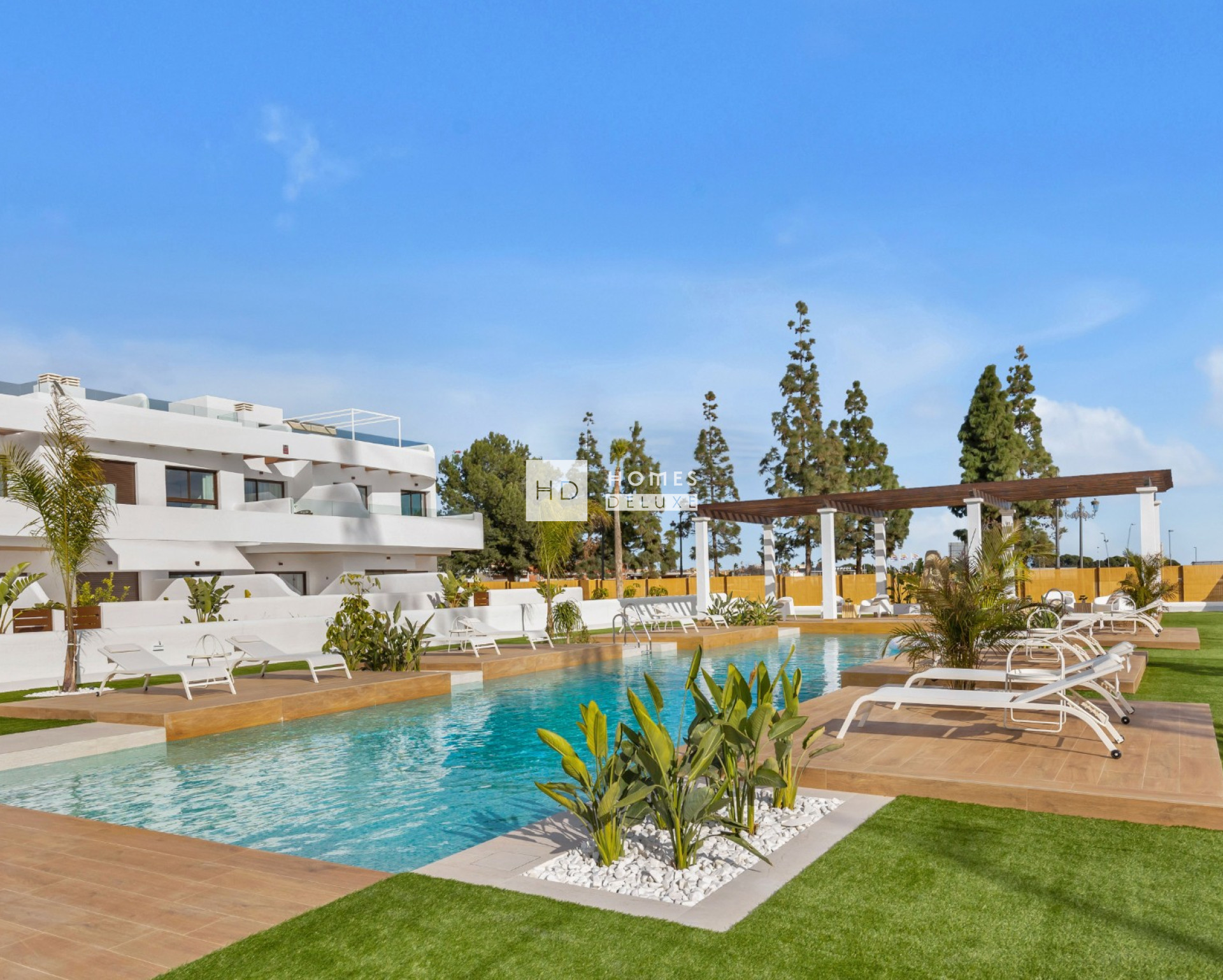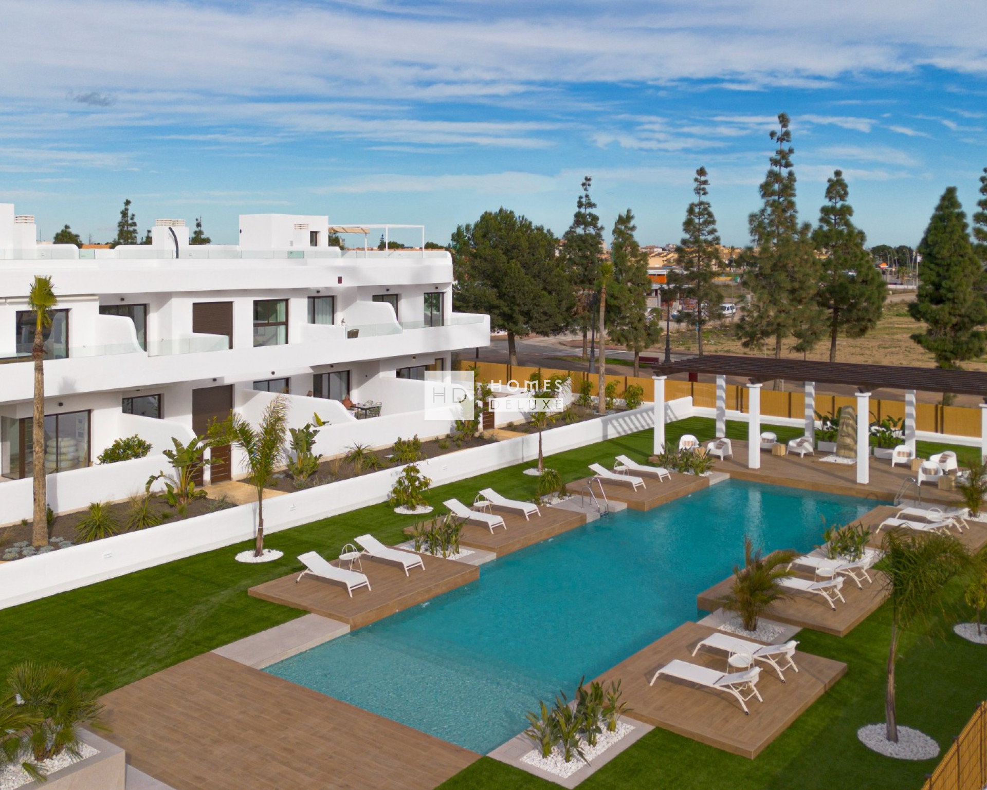 Le complexe dispose de superbes espaces verts communs centrés autour de la grande piscine commune où les résidents peuvent se détendre et s'amuser. Les pergolas ajoutent une touche de style méditerranéen au complexe et les appartements combinent un design moderne avec les meilleures qualités et fonctionnalités. Les deux premiers blocs offrent le choix entre des bungalows au rez-de-chaussée avec jardin privé ou des bungalows au dernier étage avec solarium privé sur le toit. Le troisième bloc est un immeuble d'appartements sur trois niveaux offrant des appartements au rez-de-chaussée avec un jardin privé, des appartements au premier étage avec une terrasse spacieuse et des penthouses avec un grand solarium sur le toit.