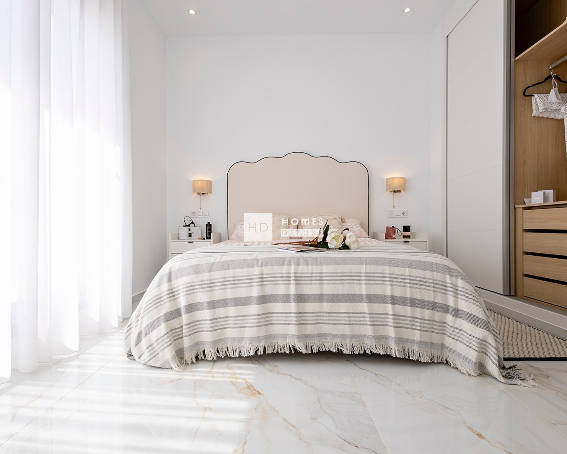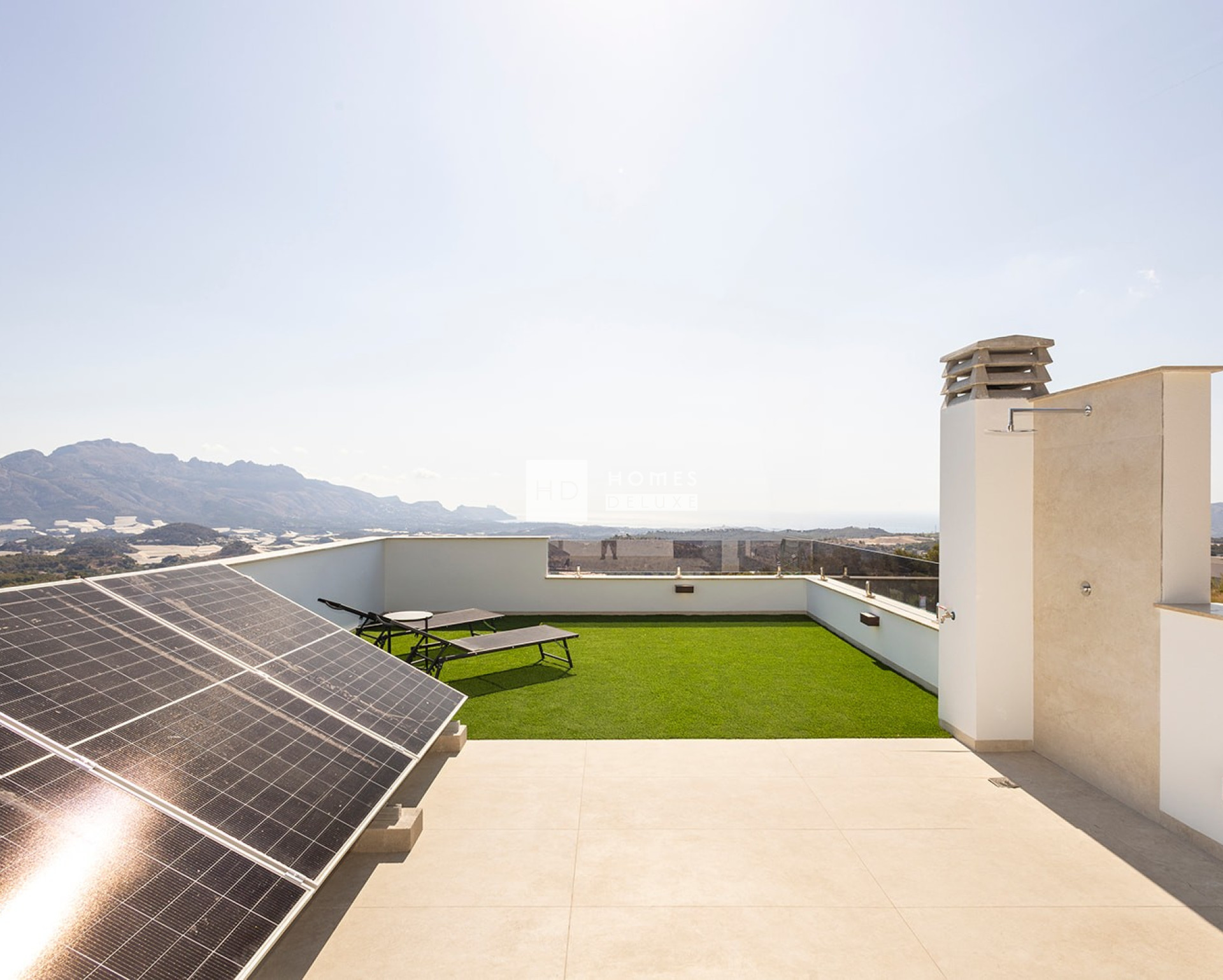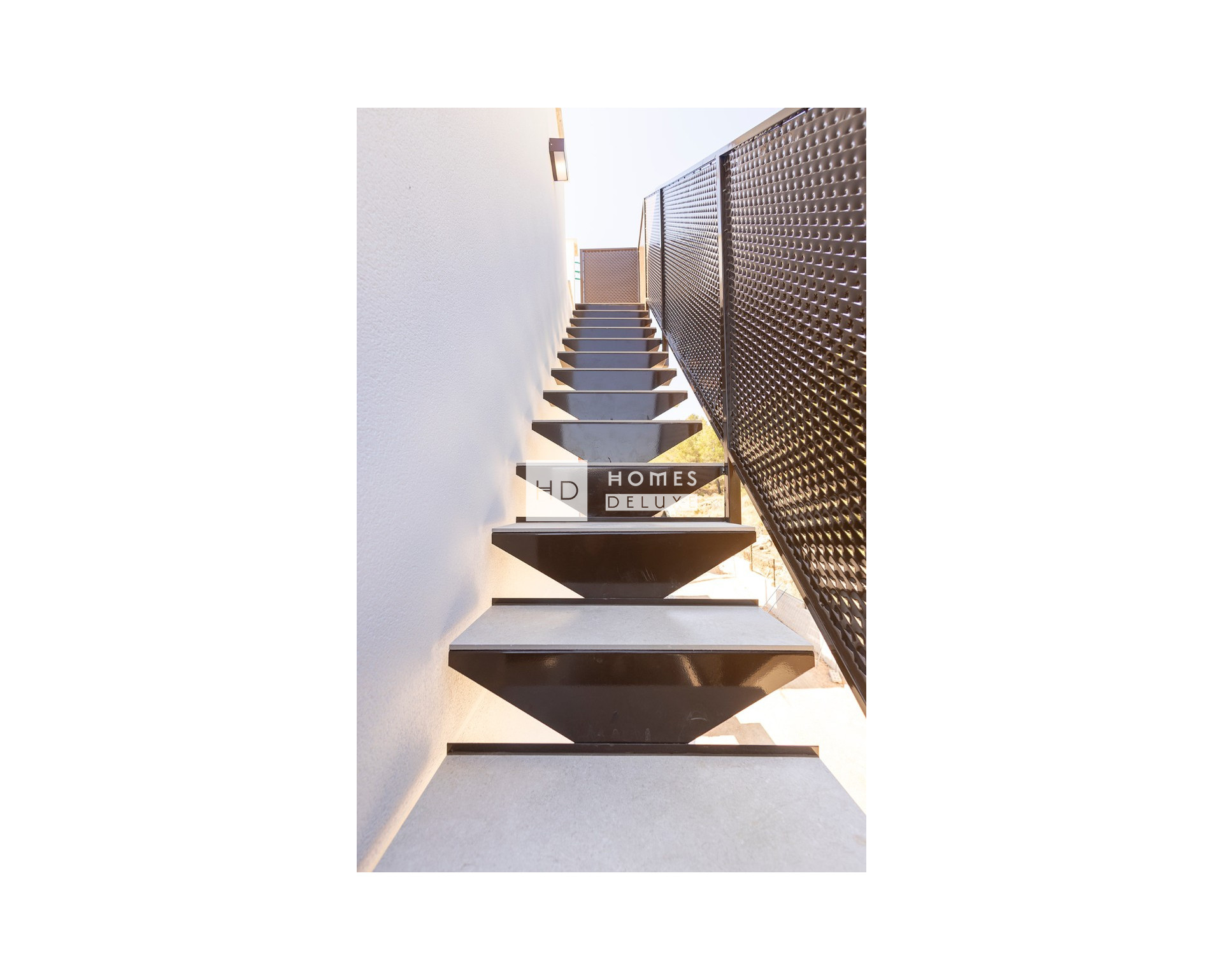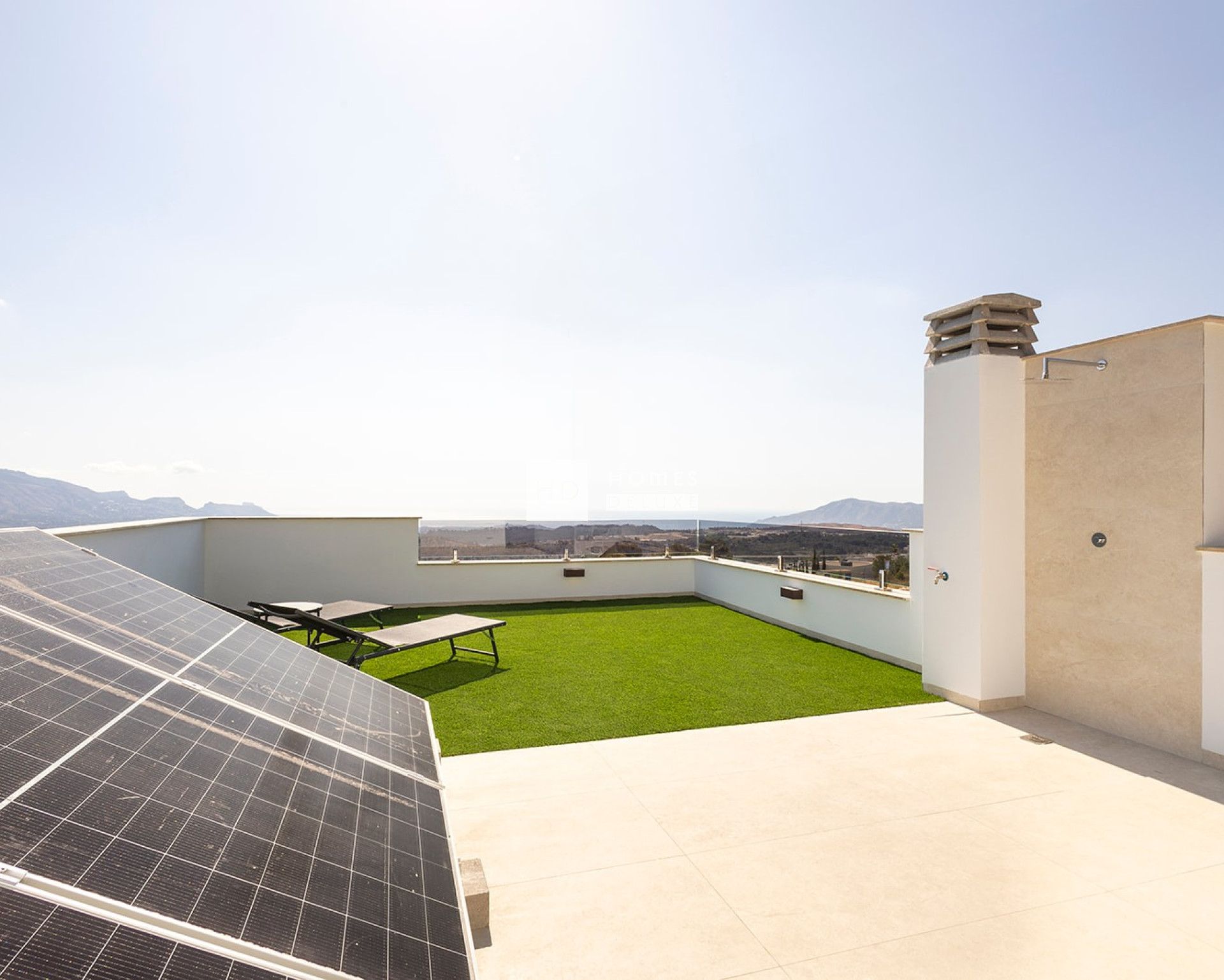 Ce modèle particulier de villa s'étend sur deux niveaux et dispose d'un solarium optionnel sur le toit. L'aménagement intérieur se compose d'un salon et d'une salle à manger ouverts, lumineux et spacieux, avec de grandes fenêtres qui s'ouvrent sur la terrasse. Dans l'espace de vie principal se trouve une cuisine moderne de style américain équipée de placards hauts et bas et d'un plan de travail compact en quartz. Le rez-de-chaussée comprend également une grande chambre double avec salle de bains privative et dressing, ainsi que des toilettes séparées pour les invités. L'escalier intérieur vous conduit au premier étage où se trouve la chambre principale avec salle de bain en-suite qui a accès à une terrasse privée de 28m2 avec vue sur la piscine et le jardin. Il y a une autre chambre double de bonne taille avec salle de bain en-suite qui a un accès privé à une terrasse plus petite. Le solarium optionnel est accessible par un escalier extérieur à l'arrière de la propriété, au premier étage. Le solarium de 46m2 vous permet d'étendre l'espace de vie extérieur où vous pourrez profiter du soleil toute la journée.