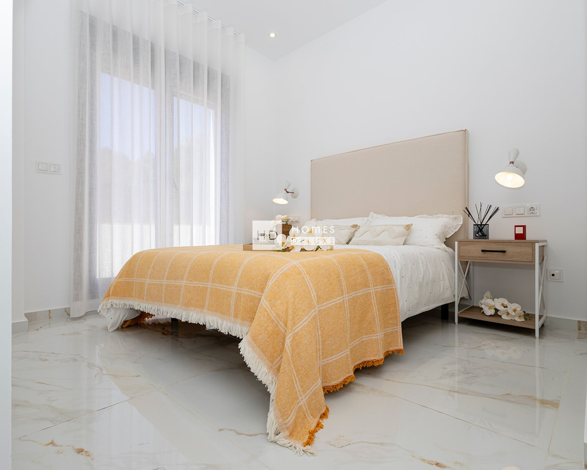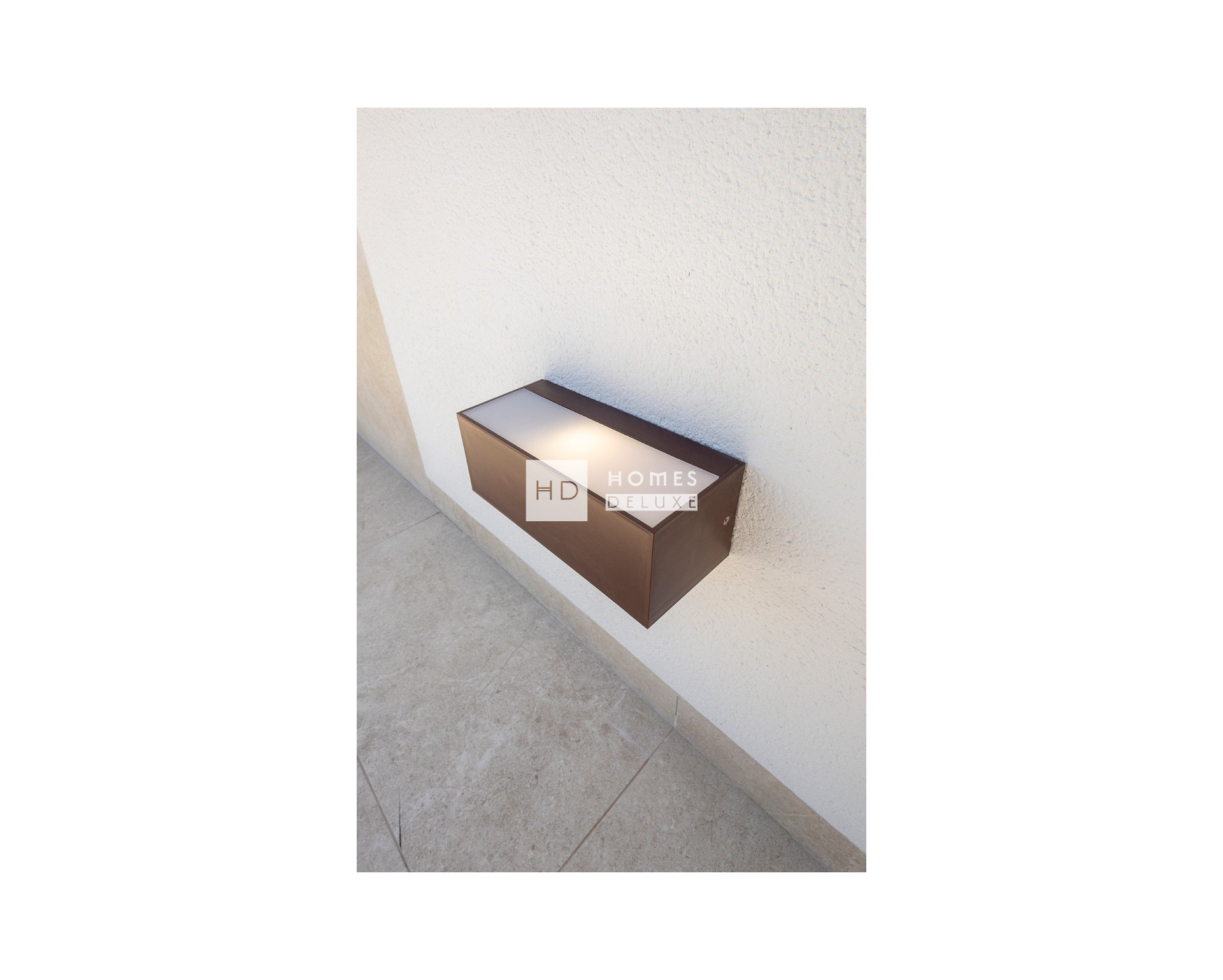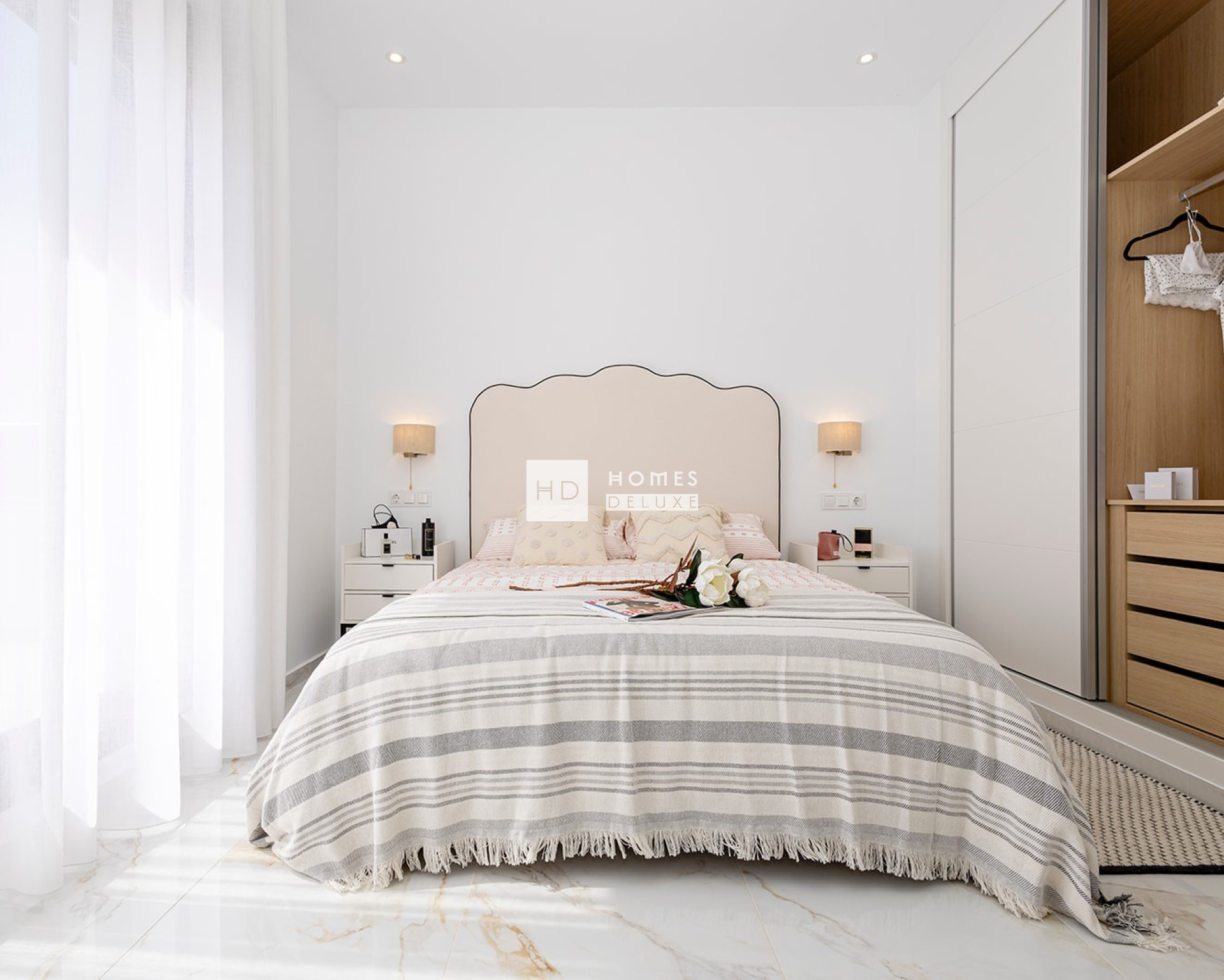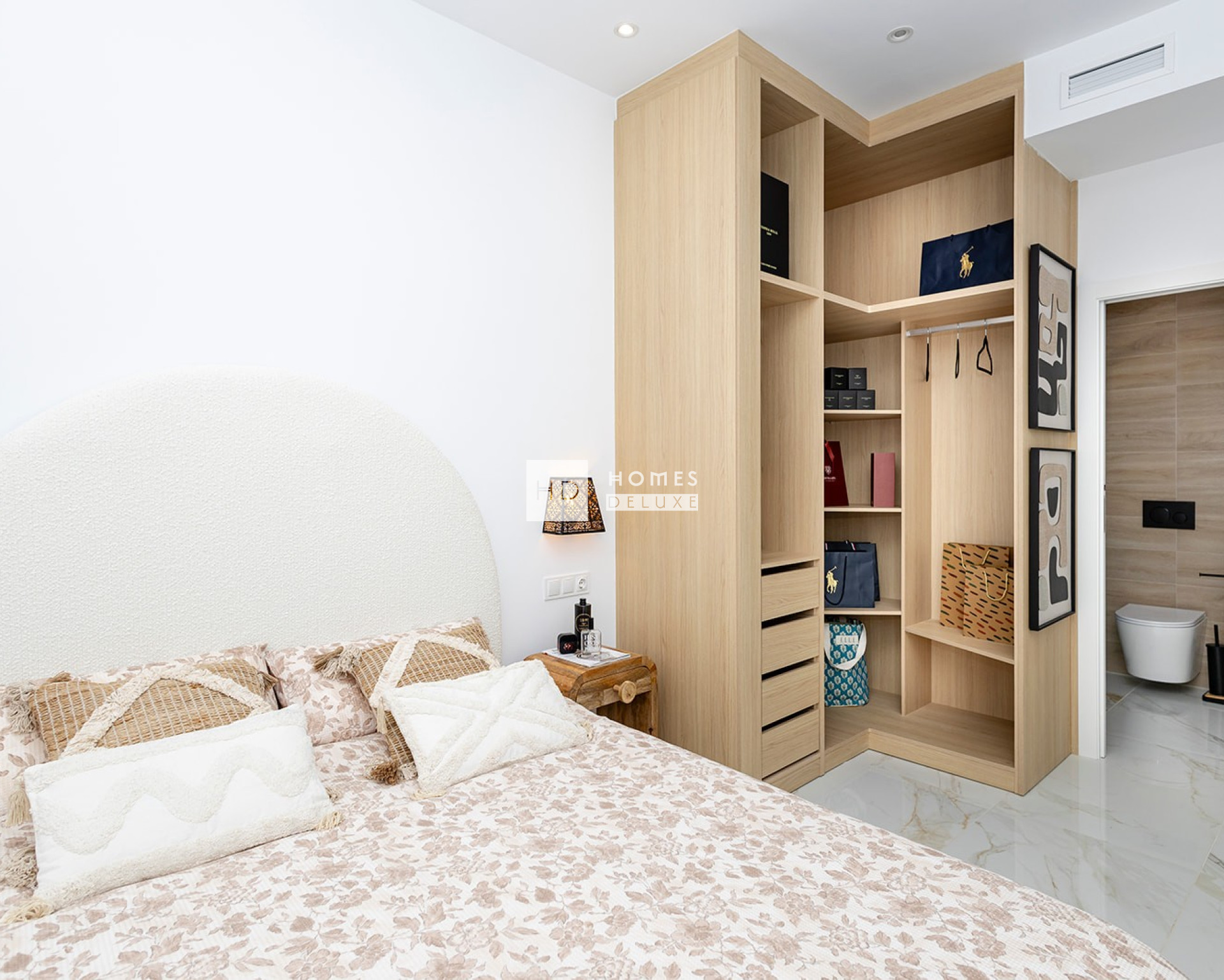 Ce modèle particulier de villa s'étend sur deux niveaux et dispose d'un solarium optionnel sur le toit. L'aménagement intérieur se compose d'un salon et d'une salle à manger ouverts, lumineux et spacieux, avec de grandes fenêtres qui s'ouvrent sur la terrasse. Dans l'espace de vie principal se trouve une cuisine moderne de style américain équipée de placards hauts et bas et d'un plan de travail compact en quartz. Le rez-de-chaussée comprend également une grande chambre double avec salle de bains privative et dressing, ainsi que des toilettes séparées pour les invités. L'escalier intérieur vous conduit au premier étage où se trouve la chambre principale avec salle de bain en-suite qui a accès à une terrasse privée de 28m2 avec vue sur la piscine et le jardin. Il y a une autre chambre double de bonne taille avec salle de bain en-suite qui a un accès privé à une terrasse plus petite. Le solarium optionnel est accessible par un escalier extérieur à l'arrière de la propriété, au premier étage. Le solarium de 46m2 vous permet d'étendre l'espace de vie extérieur où vous pourrez profiter du soleil toute la journée.