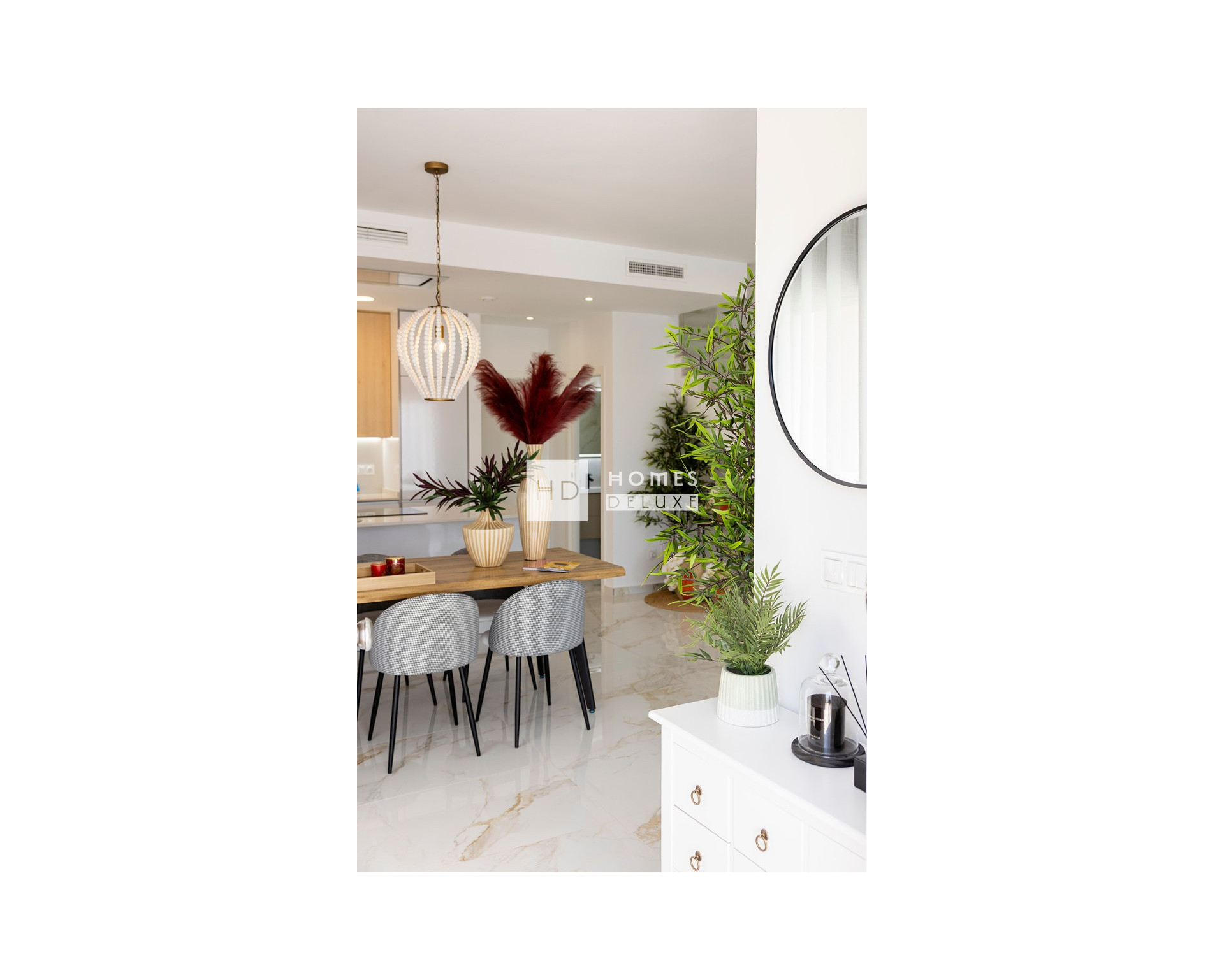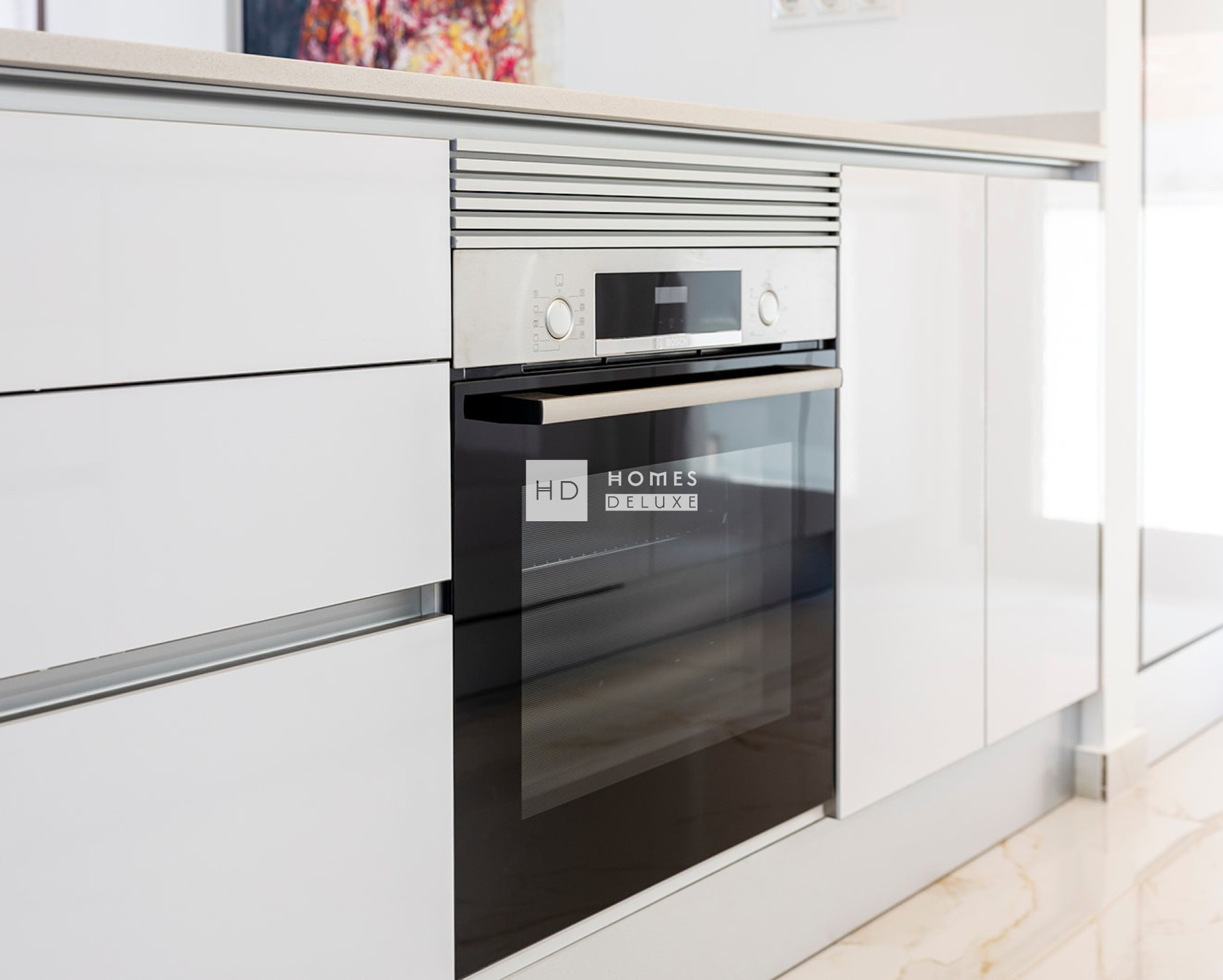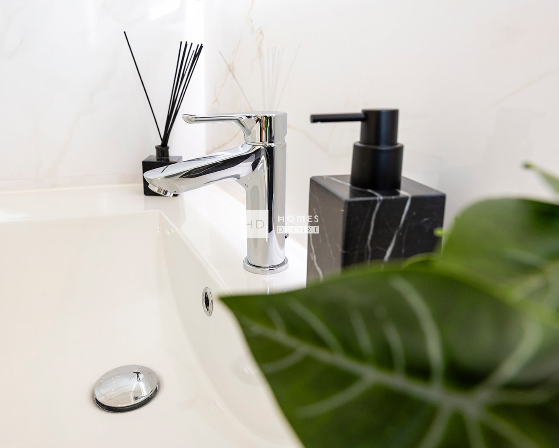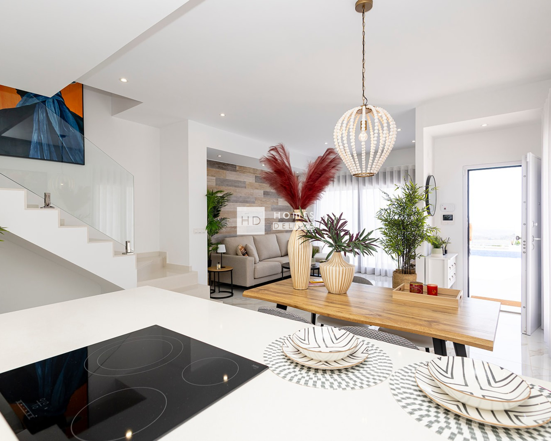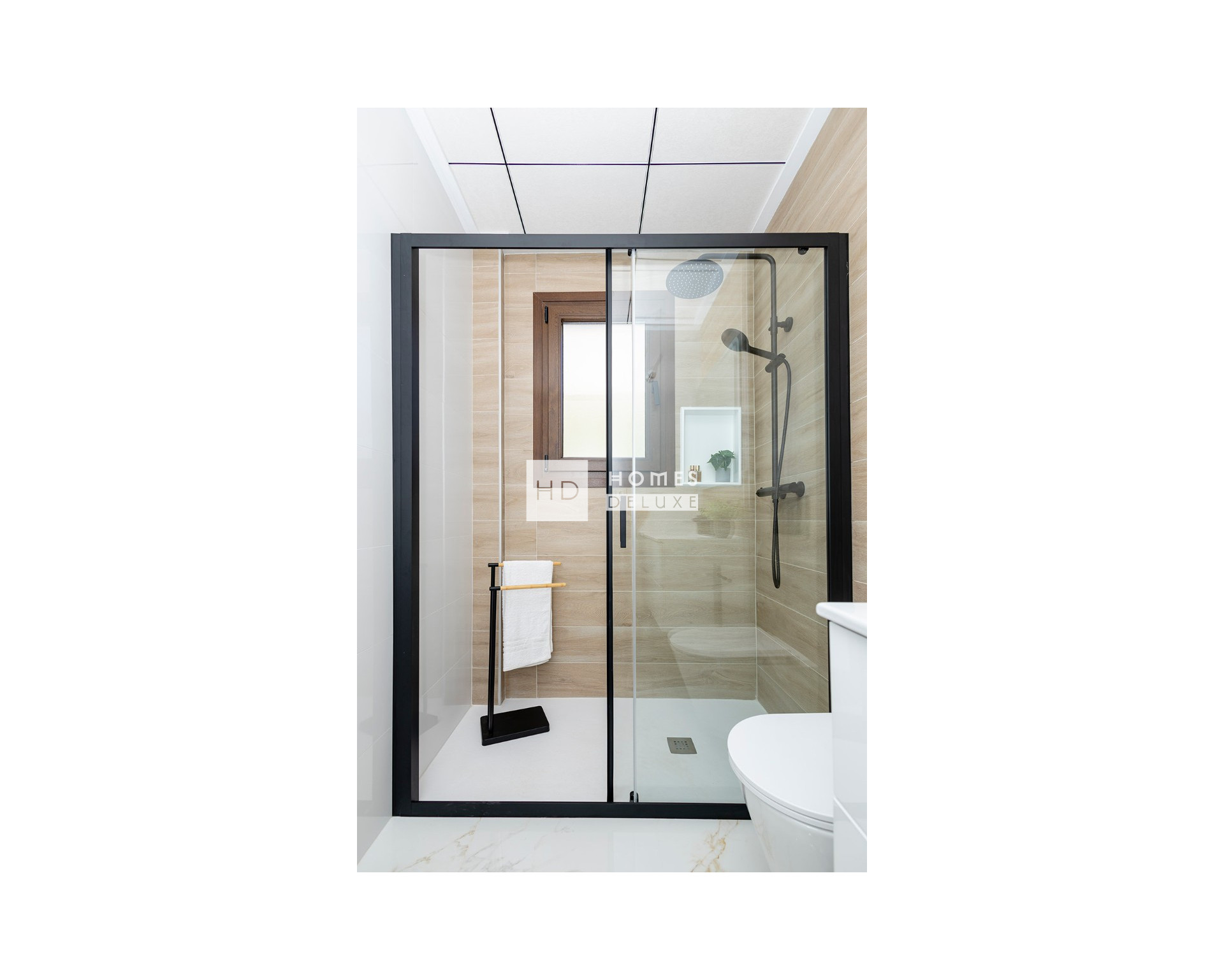 Ce modèle particulier de villa s'étend sur deux niveaux et dispose d'un solarium optionnel sur le toit. L'aménagement intérieur se compose d'un salon et d'une salle à manger ouverts, lumineux et spacieux, avec de grandes fenêtres qui s'ouvrent sur la terrasse. Dans l'espace de vie principal se trouve une cuisine moderne de style américain équipée de placards hauts et bas et d'un plan de travail compact en quartz. Le rez-de-chaussée comprend également une grande chambre double avec salle de bains privative et dressing, ainsi que des toilettes séparées pour les invités. L'escalier intérieur vous conduit au premier étage où se trouve la chambre principale avec salle de bain en-suite qui a accès à une terrasse privée de 28m2 avec vue sur la piscine et le jardin. Il y a une autre chambre double de bonne taille avec salle de bain en-suite qui a un accès privé à une terrasse plus petite. Le solarium optionnel est accessible par un escalier extérieur à l'arrière de la propriété, au premier étage. Le solarium de 46m2 vous permet d'étendre l'espace de vie extérieur où vous pourrez profiter du soleil toute la journée.