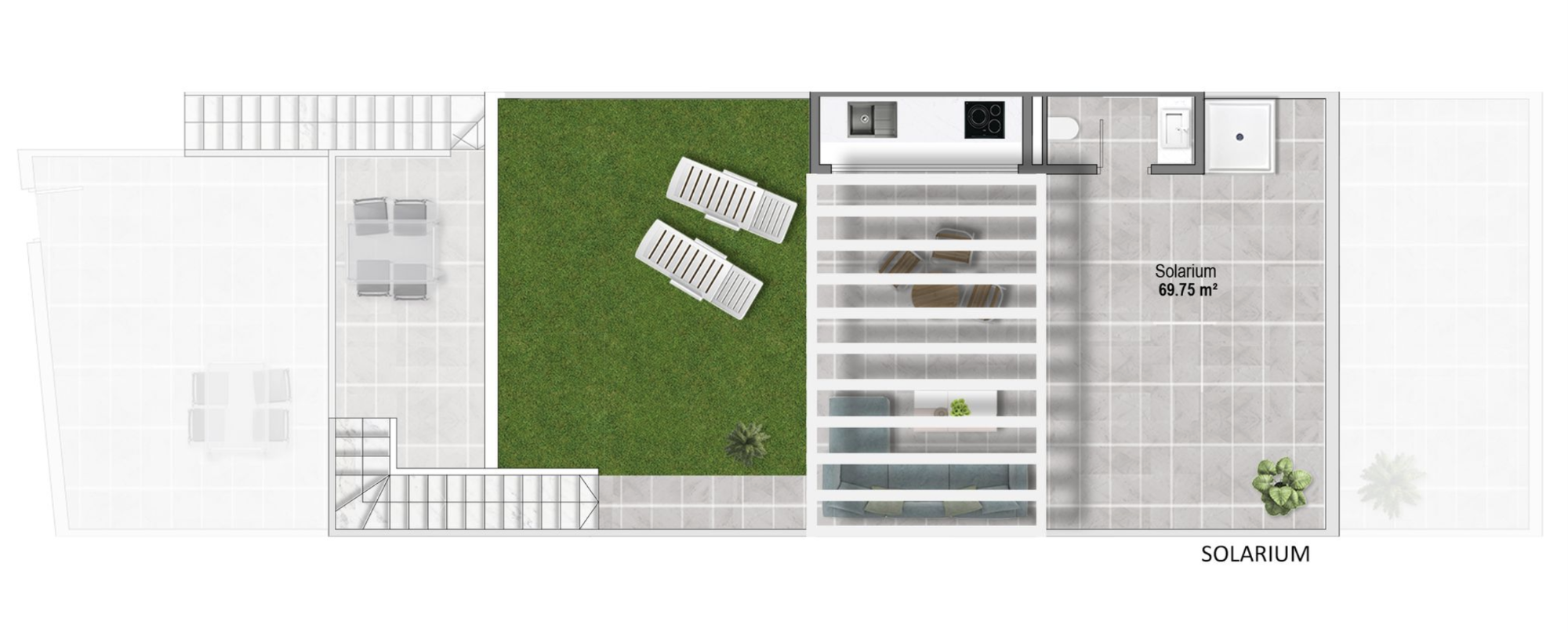 L'aménagement intérieur comprend un salon et une salle à manger spacieux et ouverts, avec des portes-fenêtres donnant sur la terrasse. Dans l'espace de vie principal se trouve une cuisine américaine moderne et entièrement équipée, ainsi qu'une buanderie séparée. La chambre principale comprend une salle de bains attenante, une autre chambre double de bonne taille et une salle de bains séparée pour les invités. Les appartements du dernier étage disposent d'un escalier extérieur sur la terrasse qui mène à un vaste solarium de 66 m2 sur le toit qui comprend une cuisine d'été fermée, une pergola, du gazon artificiel, une douche extérieure, de l'éclairage et des toilettes. Toutes les propriétés comprennent l'air conditionné, le chauffage au sol dans les salles de bains, des appareils de cuisine électriques (four, plaque de cuisson, hotte aspirante, micro-ondes, réfrigérateur-congélateur, lave-vaisselle et machine à laver), l'éclairage LED intérieur et extérieur, et une place de parking.
