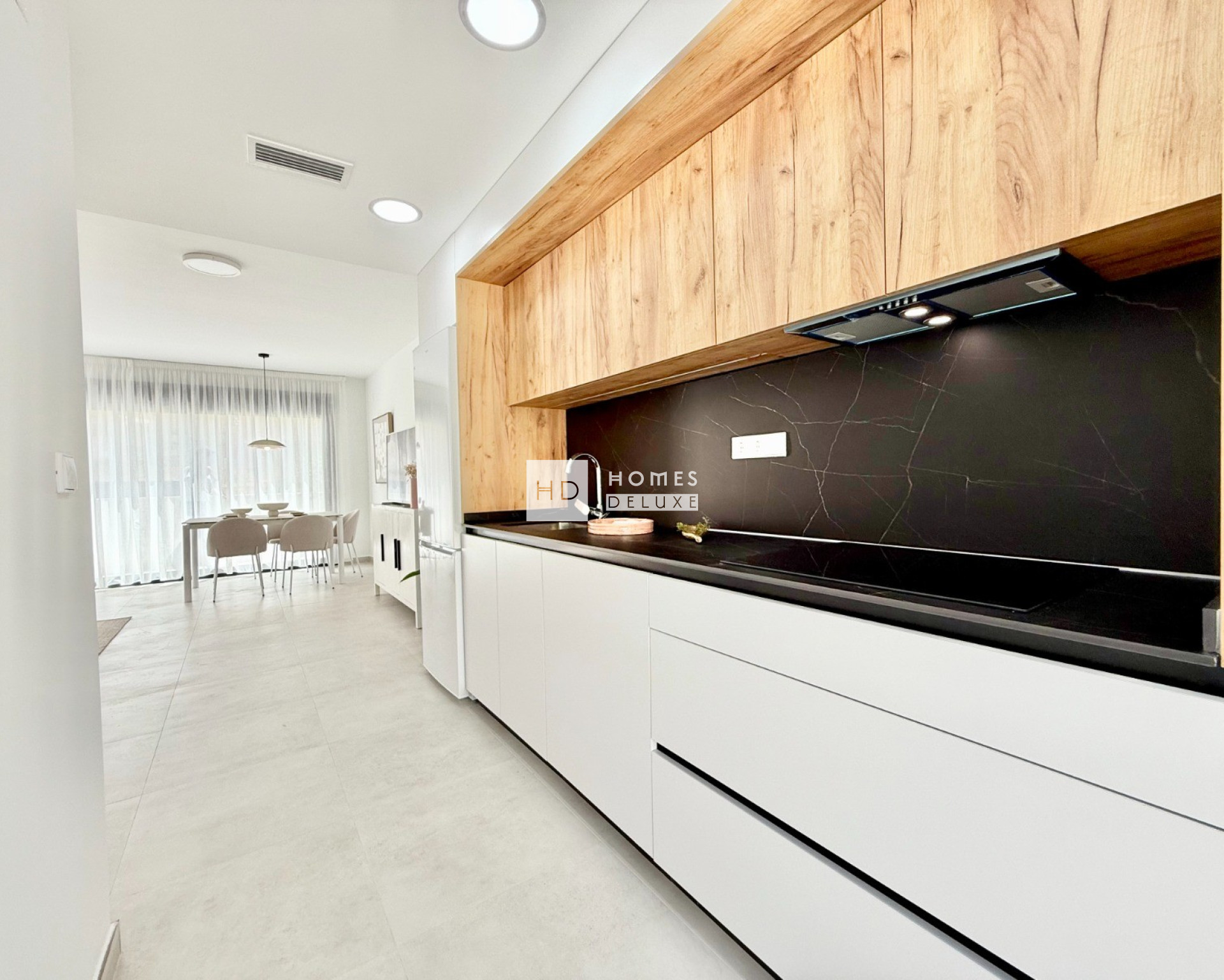 La propriété est répartie sur deux niveaux avec un solarium sur le toit. L'aménagement intérieur comprend un salon et une salle à manger spacieux et ouverts, avec de grandes fenêtres donnant sur la terrasse avant. Dans l'espace de vie principal se trouve une cuisine américaine entièrement équipée avec un plan de travail en Silestone, la cuisine a une porte d'accès au patio arrière de 19m2. Le rez-de-chaussée comprend également une chambre double et une salle de bains séparée pour les invités. L'escalier intérieur mène au premier étage où se trouve la grande chambre principale avec accès à la terrasse du premier étage. Il y a une autre chambre double de bonne taille et une deuxième salle de bain séparée pour les invités. La terrasse du premier étage dispose d'un escalier extérieur menant à un vaste solarium de 32 m2 sur le toit, comprenant une cuisine d'été, parfaite pour profiter des repas en plein air au soleil tout au long de la journée.