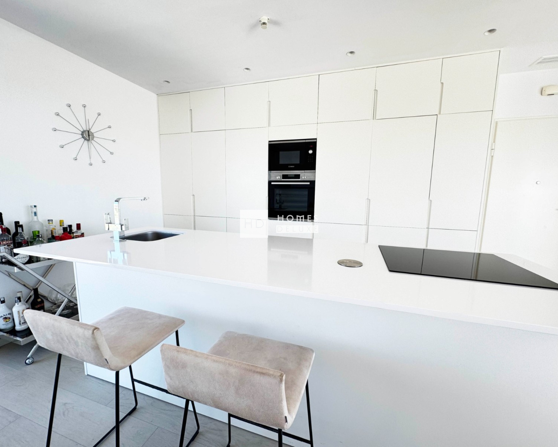 L'intérieur a été conçu avec une finition luxueuse et des équipements de première qualité. L'agencement comprend un hall d'entrée menant à un salon et à une salle à manger spacieux et lumineux, avec de grandes fenêtres doubles de chaque côté, créant une lumière naturelle abondante dans l'espace et s'ouvrant sur les terrasses. Dans l'espace de vie principal se trouve une cuisine américaine entièrement équipée, au design épuré et finie en blanc, avec des placards hauts et bas créant des rangements supplémentaires, et un îlot central avec un espace pour s'asseoir. La grande chambre principale comprend une salle de bains attenante avec douche à effet de pluie, des armoires encastrées et une porte-fenêtre donnant accès à la terrasse. Deux autres chambres doubles de bonne taille donnent sur le paysage verdoyant à l'arrière de la propriété, les deux chambres comprenant des armoires encastrées, et il y a une salle de bains séparée pour les invités avec une douche à effet de pluie. La propriété a été conçue et décorée avec goût sur un thème ultra moderne et dans des tons neutres, avec des carreaux de couleur bois clair dans tout l'appartement, qui s'étendent jusqu'à la terrasse qui réunit les espaces intérieurs et extérieurs. La propriété est vendue entièrement meublée et comprend l'installation complète de l'air conditionné, le chauffage au sol dans les deux salles de bains, le système de domotique avec Domotica, les stores intérieurs électriques, le parking souterrain privé, et cette propriété a le bonus supplémentaire d'avoir deux salles de stockage.