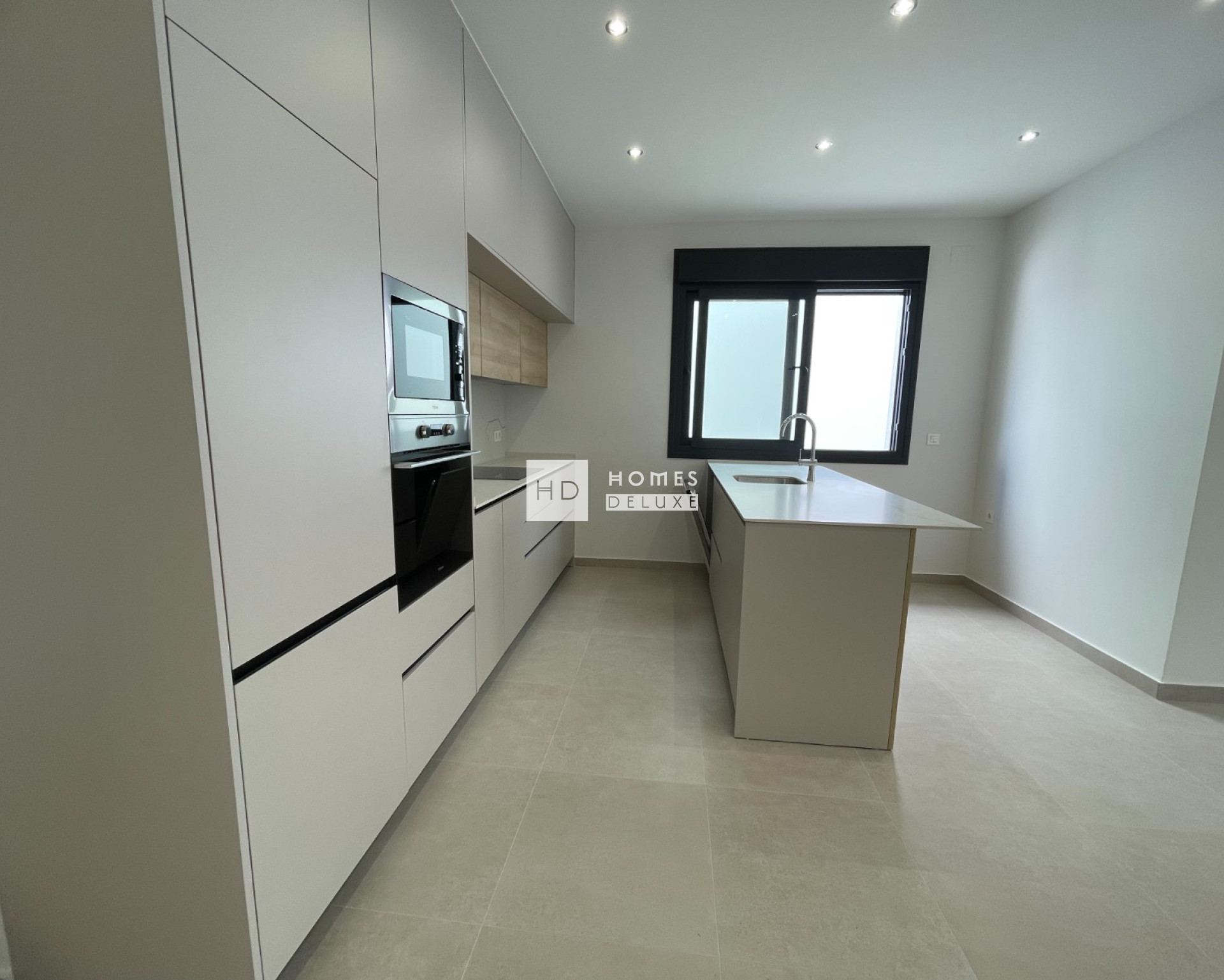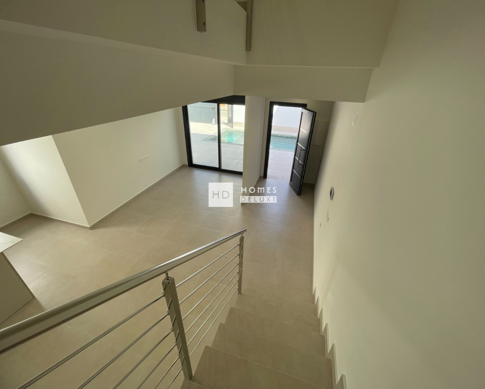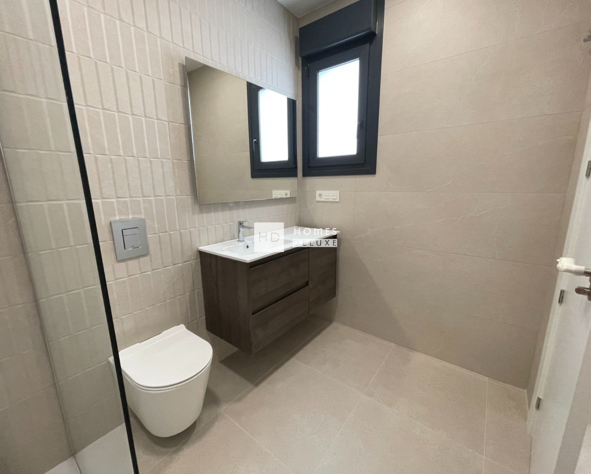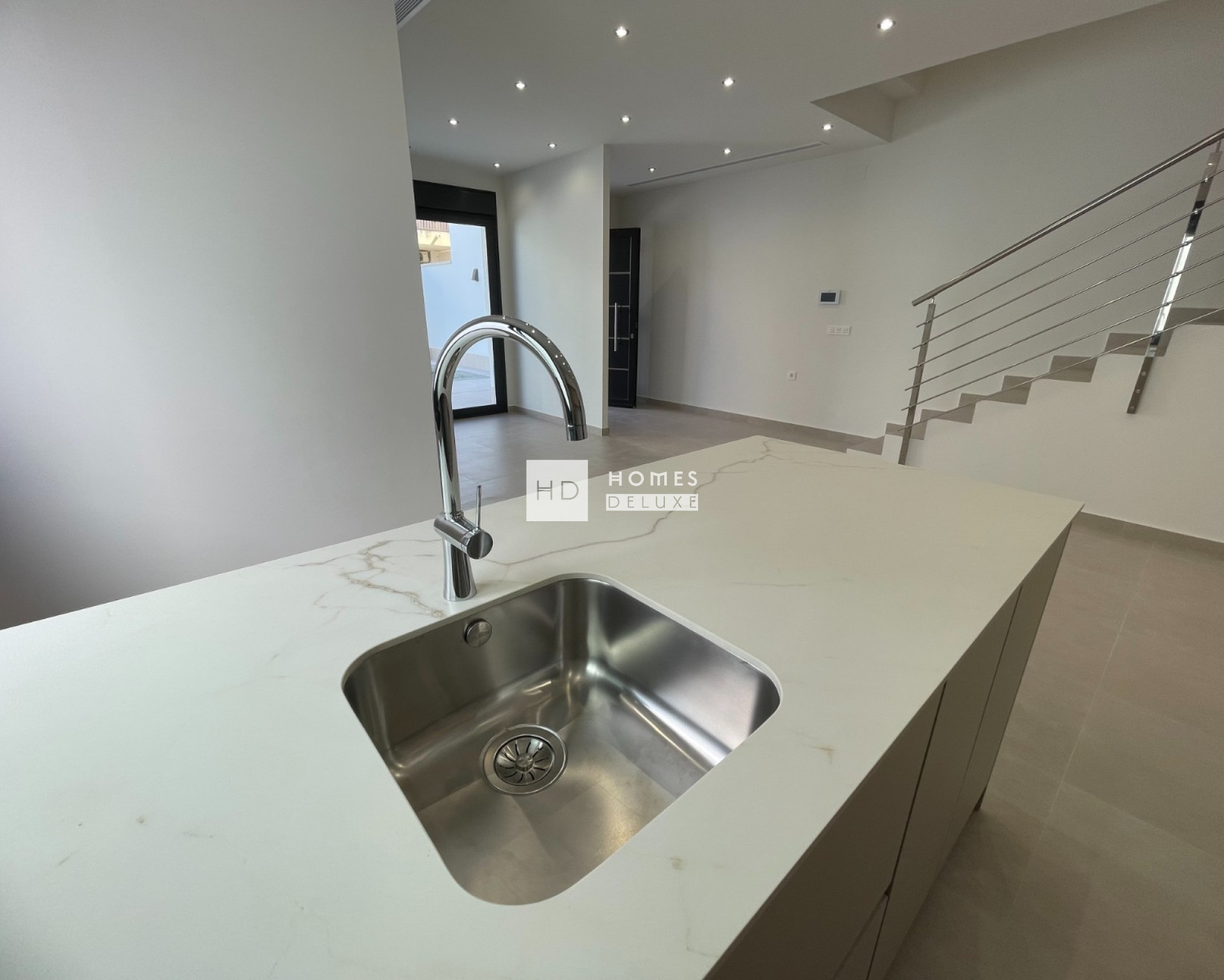 L'aménagement intérieur comprend un salon et une salle à manger ouverts, lumineux et spacieux, avec des portes-fenêtres donnant sur la terrasse. Dans l'espace de vie principal se trouve une cuisine moderne entièrement équipée, de style américain, avec un îlot central, et une buanderie séparée très utile. Le rez-de-chaussée comprend également une chambre double de bonne taille avec une porte-fenêtre donnant sur le jardin, ainsi qu'une salle de bains séparée pour les invités. L'escalier intérieur mène au premier étage où se trouvent deux impressionnantes chambres à coucher avec salle de bains attenante et dressing. La suite située à l'avant de la propriété a accès à une terrasse privée donnant sur le jardin et la piscine. Les propriétés comprennent l'air conditionné avec contrôle de zone, les appareils électriques de cuisine, les armoires encastrées dans toutes les chambres, l'éclairage LED intérieur et extérieur, le jardin avec système d'irrigation automatique, la piscine privée et le parking privé sur le terrain.