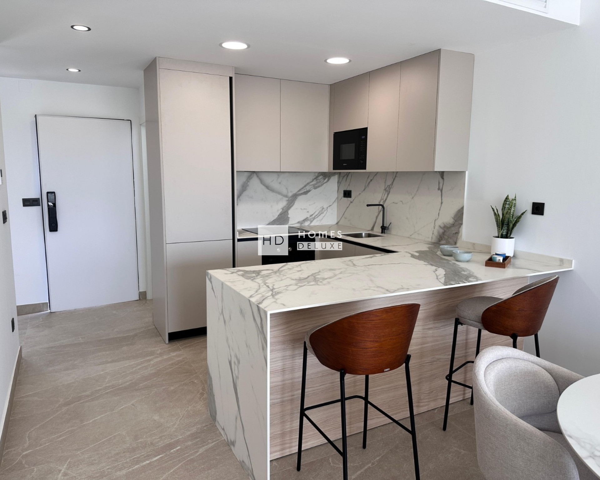 L'aménagement intérieur comprend un hall d'entrée menant à un salon et une salle à manger spacieux et lumineux, avec de grandes fenêtres donnant sur la terrasse privée. Dans l'espace de vie principal se trouve une cuisine moderne de style américain finie dans des tons écrus et bois (d'autres finitions ou couleurs sont disponibles). Il y a également une buanderie / salle de stockage séparée très utile. La grande chambre principale comprend une salle de bains attenante et un dressing, ainsi qu'un accès à la terrasse par une porte-fenêtre. Il y a une autre chambre double de bonne taille et une salle de bain séparée pour les invités. Les options du penthouse bénéficient d'un impressionnant solarium sur le toit de 65m2 ou plus, avec une pré-installation pour une cuisine d'été et un jacuzzi.