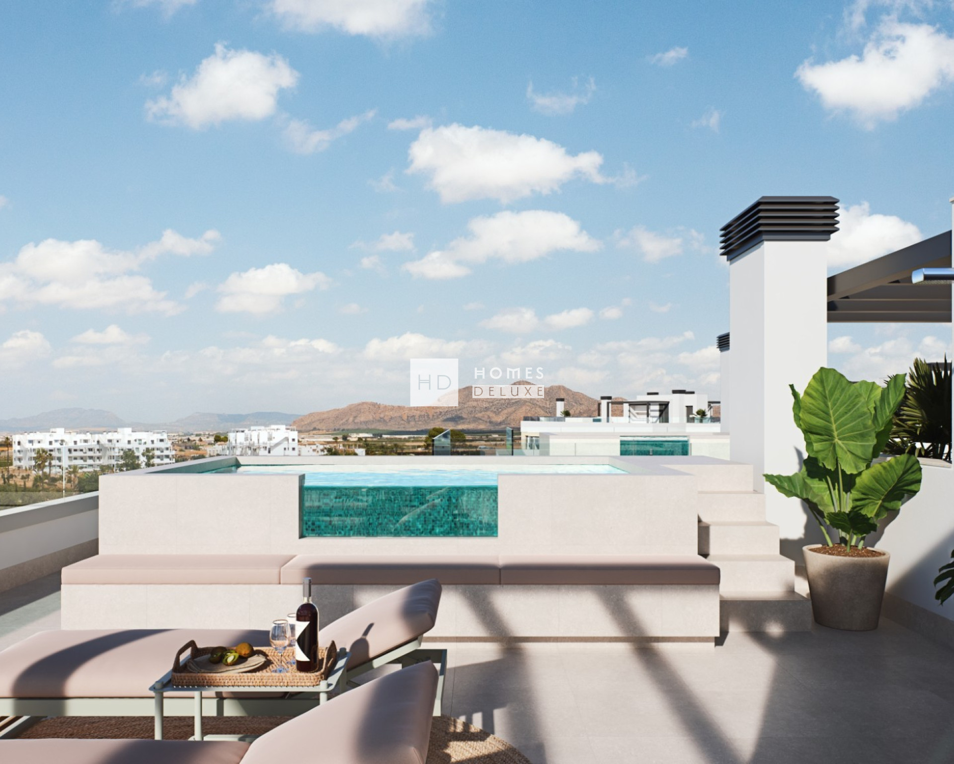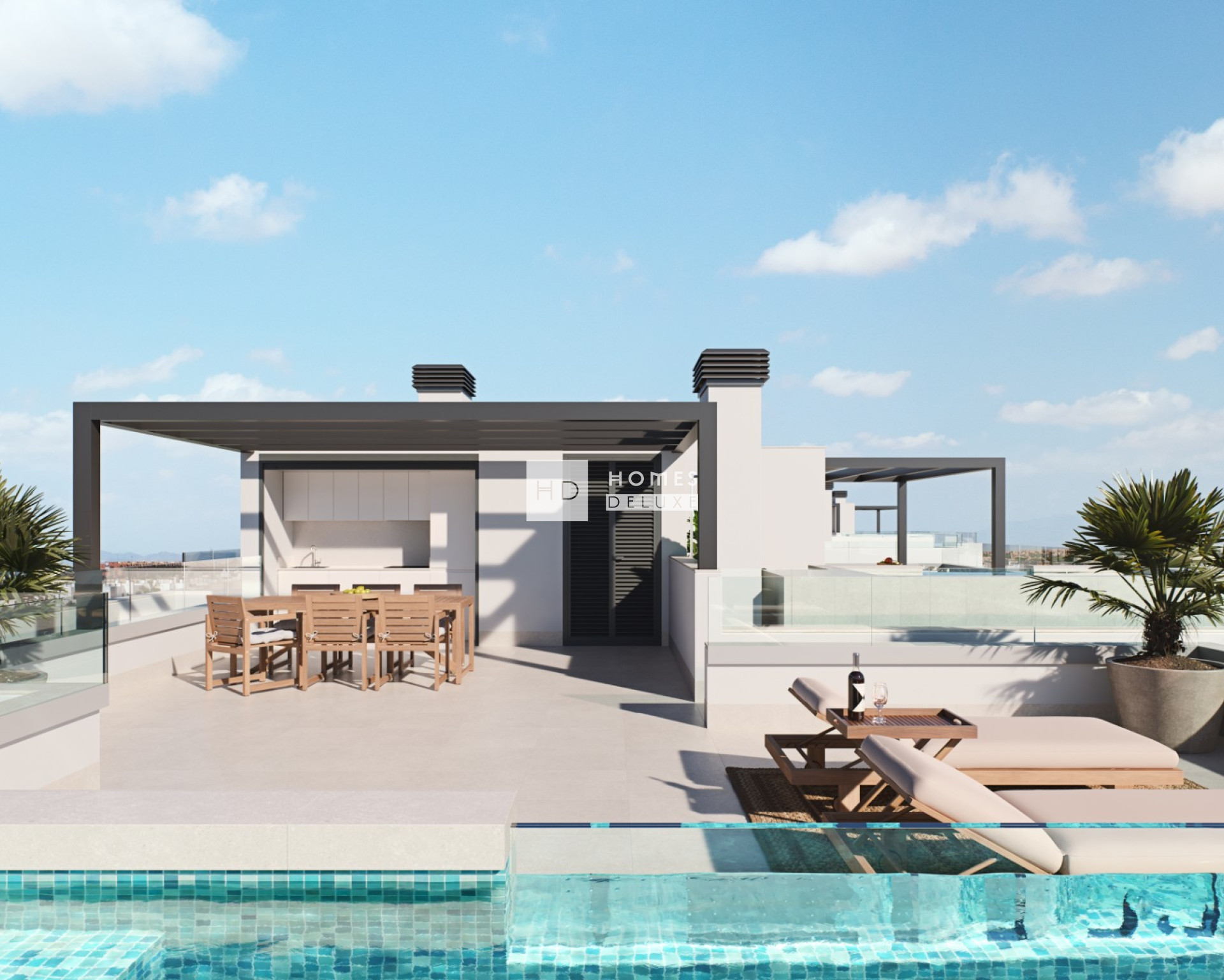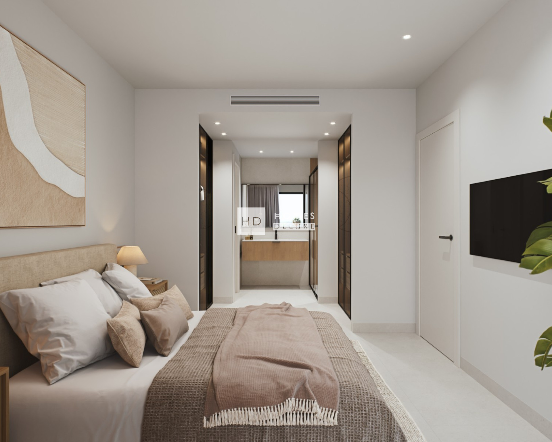 L'aménagement intérieur comprend un hall d'entrée menant à un spacieux espace de vie ouvert avec un salon lumineux et une salle à manger dotée de grandes baies vitrées donnant sur la terrasse. Dans la pièce à vivre principale se trouve une cuisine américaine entièrement équipée avec un grand espace de rangement et un îlot central. L'impressionnante chambre principale comprend une salle de bains attenante et un dressing. Il y a une autre chambre double de bonne taille et une salle de bains séparée pour les invités. Les penthouses disposent d'un escalier intérieur ou extérieur menant au vaste solarium sur le toit de 64 m² (2 chambres) ou 75 m² (3 chambres) pour profiter du soleil toute la journée. Les solariums sur le toit offrent une vue imprenable et permettent de profiter au maximum de la vie en plein air avec une piscine privée et un grand espace de détente avec une cuisine d'été.
