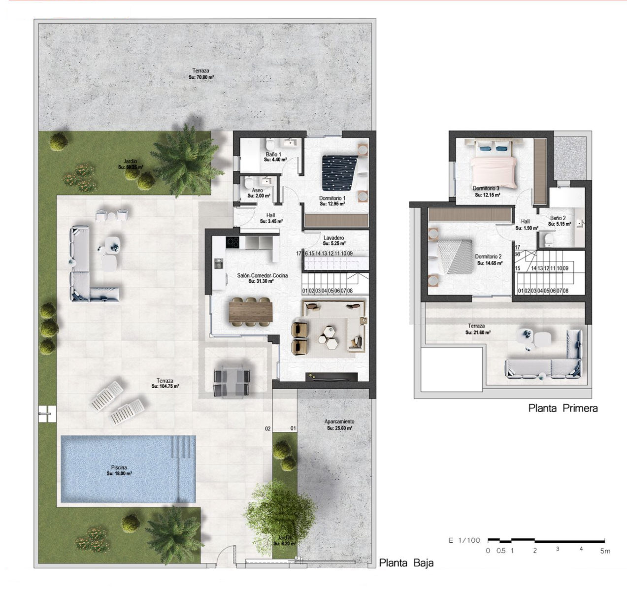 Le complexe résidentiel propose différents types de villas individuelles, toutes de plain-pied ou sur deux niveaux, avec 2, 3 ou 4 chambres, 2 ou 3 salles de bains et une piscine privée, avec de multiples options au choix et des finitions de haute qualité. Les villas ont été conçues pour intégrer l'extérieur à l'intérieur de l'espace de vie. Elles disposent de nombreux espaces extérieurs pour profiter de la vie en plein air en Espagne, avec un jardin privé, de grandes terrasses à l'avant et à l'arrière, et une piscine privée accueillante de 18 m².