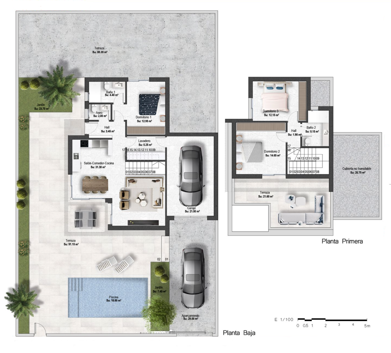 Le complexe résidentiel propose différents types de villas individuelles, toutes de plain-pied ou sur deux niveaux, avec 2, 3 ou 4 chambres, 2 ou 3 salles de bains et une piscine privée, avec de multiples options au choix et des finitions de haute qualité. Les villas ont été conçues pour intégrer l'extérieur à l'intérieur de l'espace de vie. Elles disposent de nombreux espaces extérieurs pour profiter de la vie en plein air en Espagne, avec un jardin privé, de grandes terrasses à l'avant et à l'arrière, et une piscine privée accueillante de 18 m².