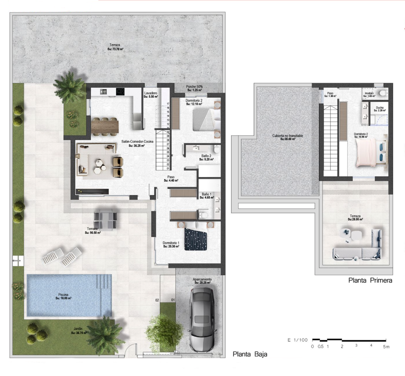 Le complexe résidentiel propose différents types de villas individuelles, toutes de plain-pied ou sur deux niveaux, avec 2, 3 ou 4 chambres, 2 ou 3 salles de bains et une piscine privée, avec de multiples options au choix et des finitions de haute qualité. Les villas ont été conçues pour intégrer l'extérieur à l'intérieur de l'espace de vie. Elles disposent de nombreux espaces extérieurs pour profiter de la vie en plein air en Espagne, avec un jardin privé, de grandes terrasses à l'avant et à l'arrière, et une piscine privée accueillante de 18 m².