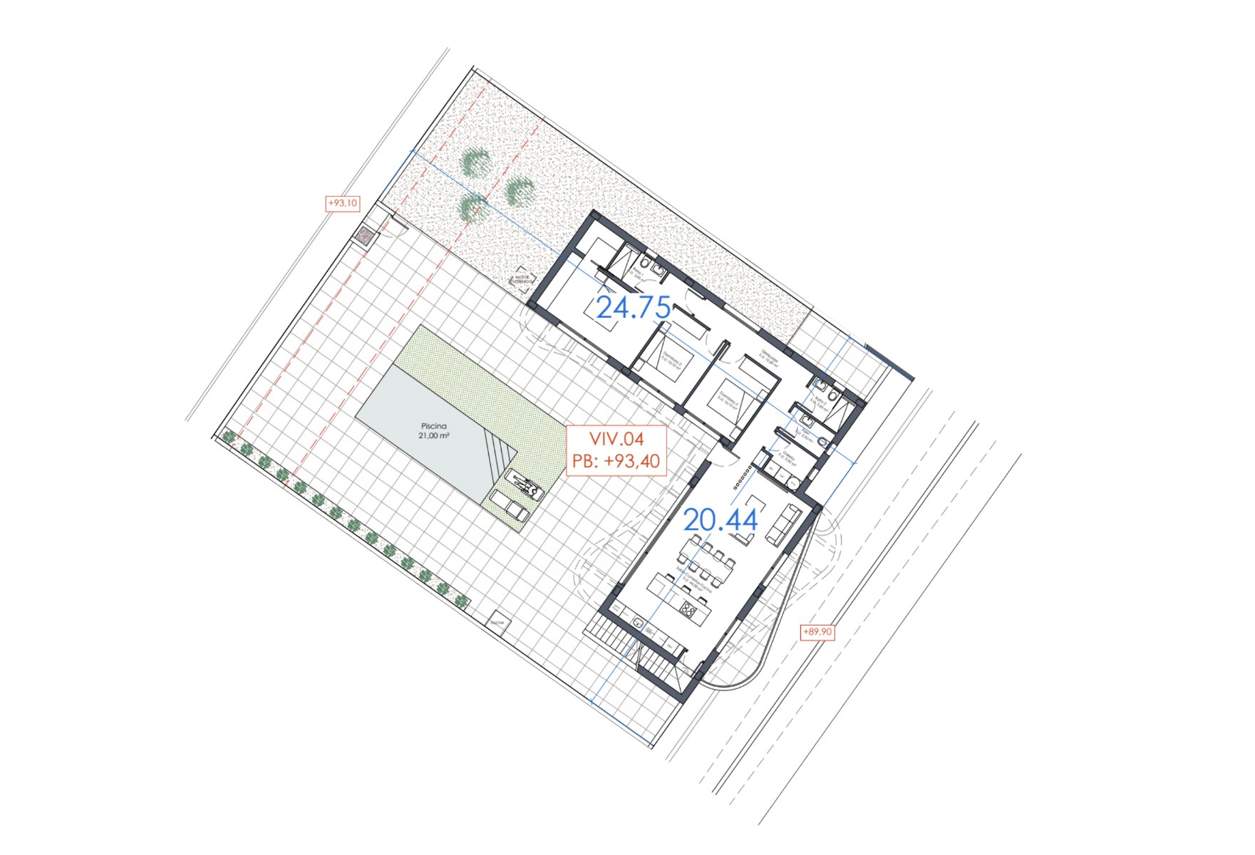 Cette villa particulière est la plus grande option au sein de la communauté, avec une conception en forme de L qui permet à pratiquement toute la maison d'avoir une vue et un accès au jardin spacieux et luxueux avec une piscine privée de 7 x 3 m. Une autre caractéristique supplémentaire de cette villa est que le sous-sol est inclus dans le prix. La villa est de plain-pied et l'aménagement intérieur comprend un salon et une salle à manger ouverts, lumineux et spacieux, avec de grandes fenêtres dans tout l'espace de vie, créant ainsi beaucoup de lumière naturelle et s'ouvrant sur la terrasse. Dans l'espace de vie principal se trouve une cuisine moderne de style américain entièrement équipée, avec des placards bas et hauts et un îlot central. Il y a également une buanderie séparée très pratique et des toilettes pour invités. L'impressionnante suite parentale comprend une très grande chambre avec salle de bains attenante et un dressing. Il y a deux autres chambres doubles de bonne taille, toutes les chambres ont accès à la terrasse principale par une porte-fenêtre, et il y a une salle de bains séparée pour les invités. Un escalier extérieur sur le côté de la propriété vous mène au vaste solarium sur le toit, idéal pour profiter du soleil toute la journée. Les propriétés sont équipées d'une pré-installation pour la climatisation, d'armoires encastrées avec tiroirs dans toutes les chambres, d'un éclairage LED intérieur et extérieur, d'un système domotique en option, d'un jardin avec des zones pavées, de gazon artificiel avec un espace disponible pour l'aménagement paysager et d'un parking privé sur le terrain.