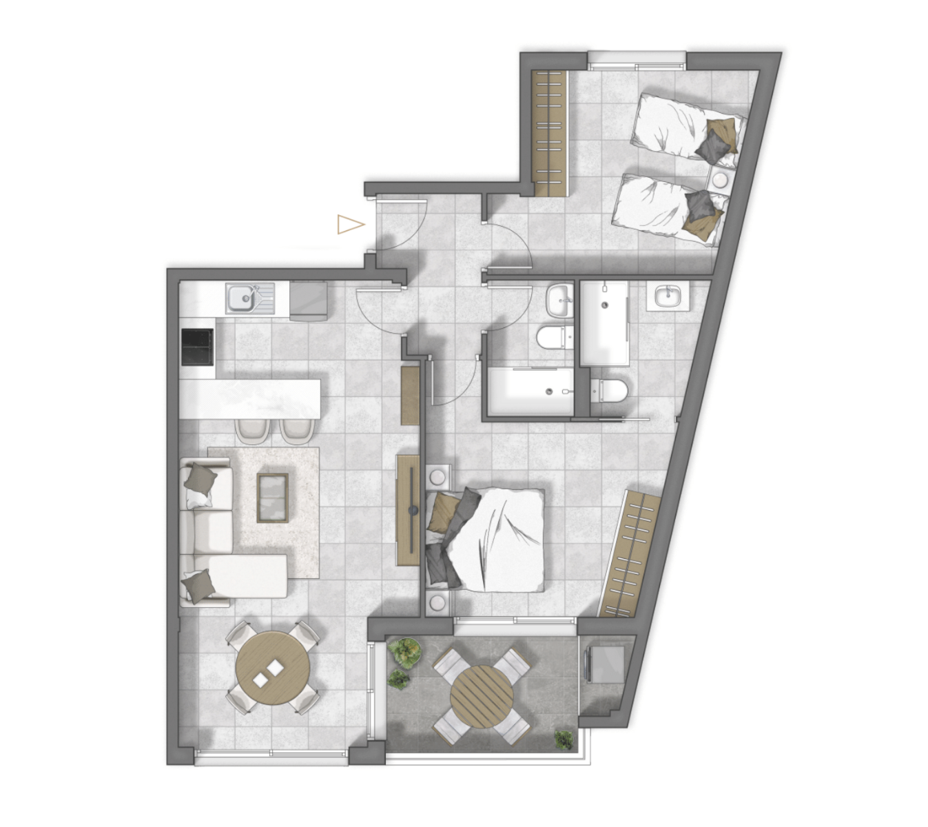 L'aménagement intérieur comprend un hall d'entrée menant au spacieux salon et salle à manger ouverts, avec des portes-fenêtres donnant sur la terrasse. L'espace de vie principal comprend également une cuisine moderne de style américain, équipée de placards hauts et bas et d'un bar pratique pour le petit-déjeuner. Il y a une chambre principale de bonne taille avec salle de bains attenante, une autre chambre double et une salle de bains séparée pour les invités. Les appartements-terrasses disposent tous d'un solarium privé sur le toit pour profiter au maximum de la vie en plein air en Espagne. Les propriétés sont équipées d'une pré-installation pour la climatisation, d'une hotte aspirante dans la cuisine, d'armoires encastrées dans toutes les chambres, d'un système d'interphone et d'un débarras.
