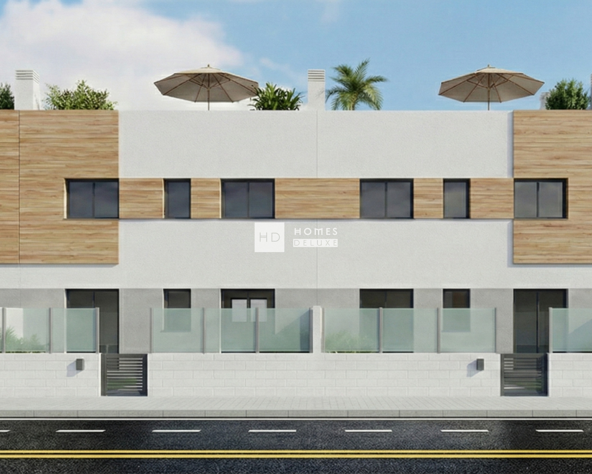 L'aménagement intérieur des 3 chambres comprend un spacieux salon et une salle à manger ouverts avec des portes-fenêtres donnant sur la terrasse. Dans l'espace de vie principal se trouve une cuisine américaine moderne entièrement équipée, avec une finition blanche et un plan de travail en Calacatta disponible en plusieurs couleurs au choix. La grande chambre principale est située à l'arrière de la propriété et dispose d'une porte-fenêtre donnant sur le patio, ainsi que d'une salle de bains attenante. Il y a deux autres chambres doubles de bonne taille et une salle de bains séparée pour les invités. Les appartements du dernier étage disposent d'un escalier extérieur sur la terrasse qui mène au vaste solarium de 70 m² sur le toit, qui comprend une cuisine d'été pour profiter des repas en plein air. Les appartements du rez-de-chaussée comprennent également une cuisine d'été située sur le patio arrière.
