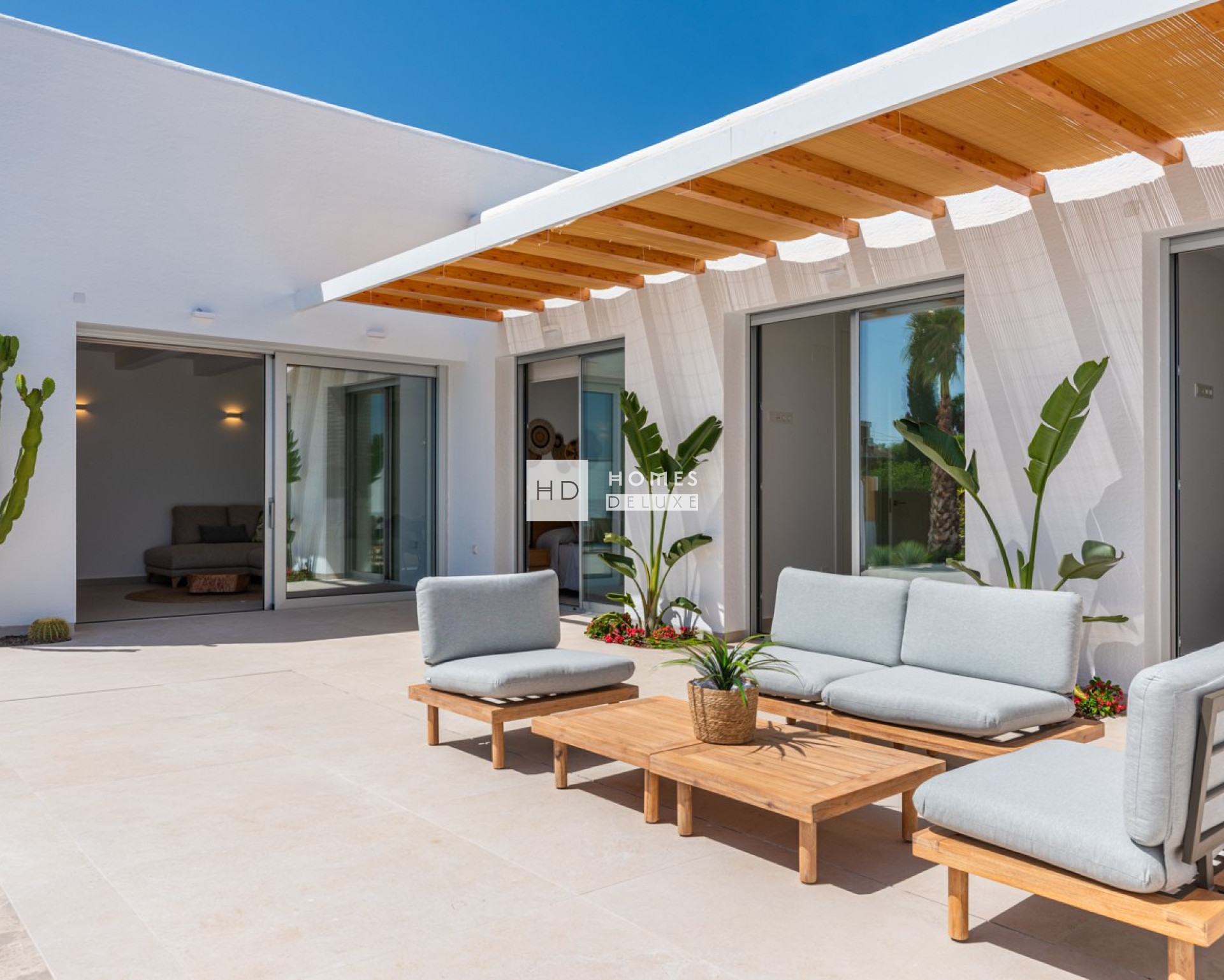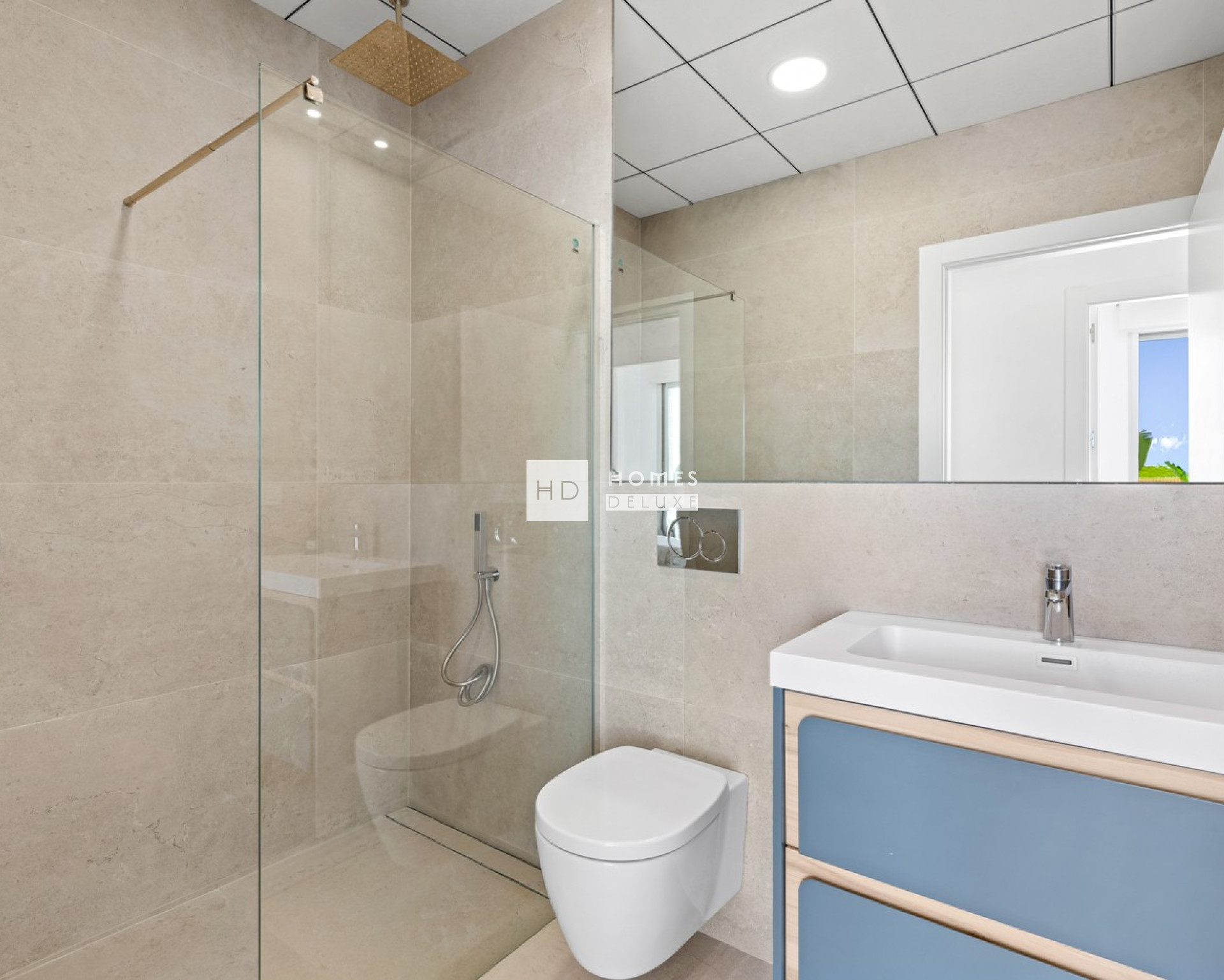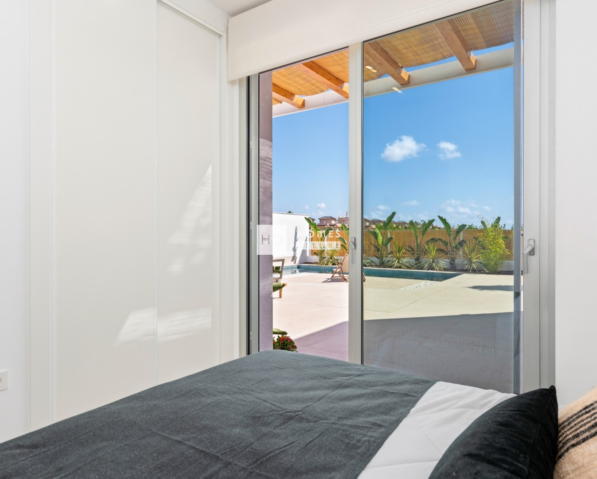 Les villas sont toutes de plain-pied et l'aménagement intérieur comprend un salon et une salle à manger spacieux et lumineux, avec de grandes baies vitrées laissant entrer beaucoup de lumière naturelle et donnant sur la terrasse extérieure. Dans l'espace de vie principal se trouve une cuisine moderne et élégante de style américain, avec des armoires hautes et basses laquées en blanc et des détails en bois, ainsi qu'un bar pratique pour le petit-déjeuner. L'impressionnante suite principale comprend une grande chambre, une salle de bains attenante et un dressing. Il y a deux autres chambres doubles de bonne taille, toutes les chambres ont accès à la terrasse principale par une porte-fenêtre, et il y a également une salle de bains séparée pour les invités. Un escalier extérieur sur le côté de la propriété vous mène au vaste solarium de 33 m² sur le toit, où vous pourrez profiter de la vue imprenable et du soleil toute la journée.