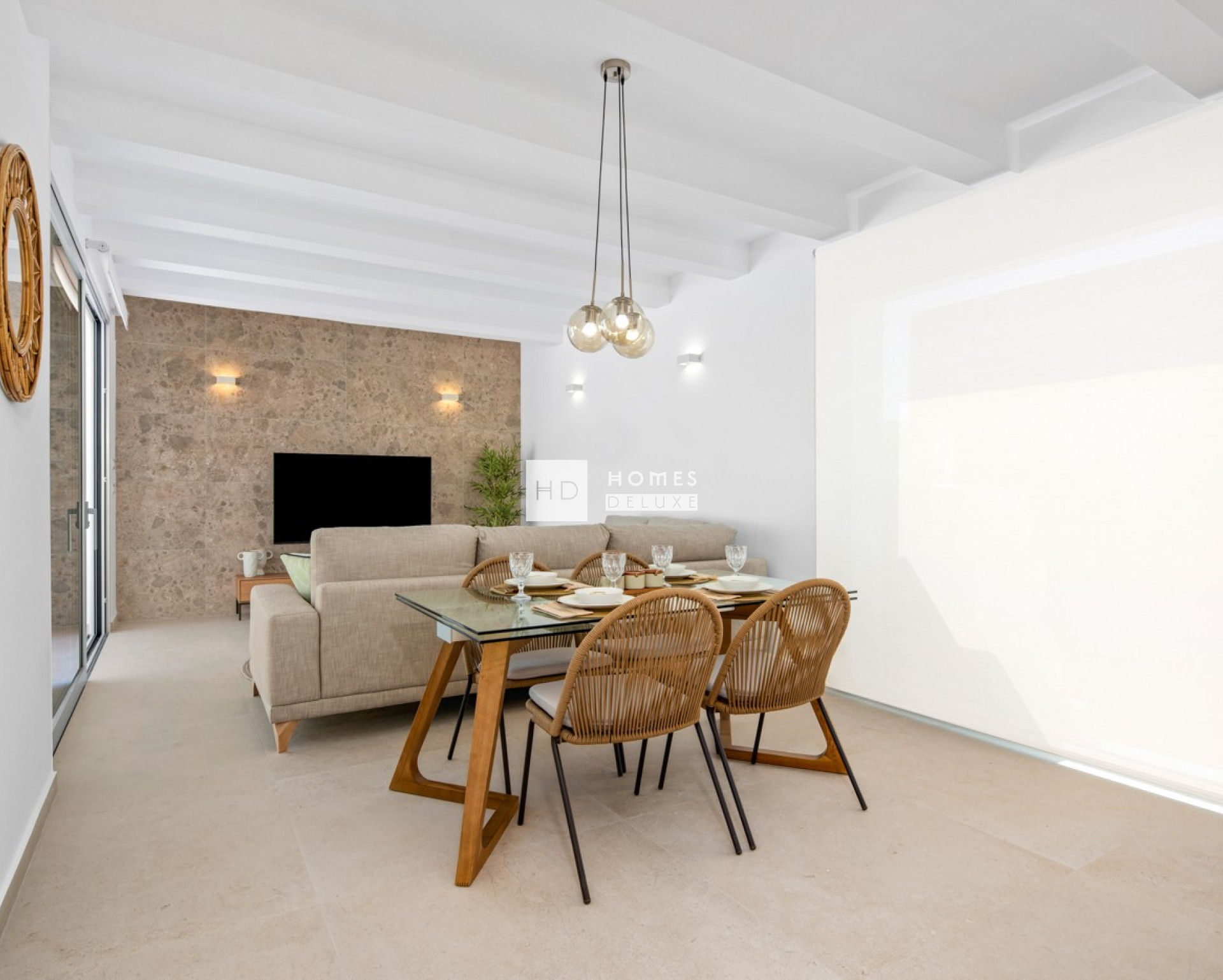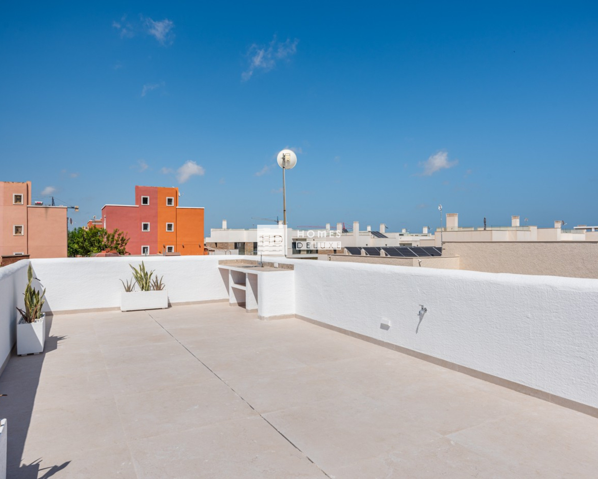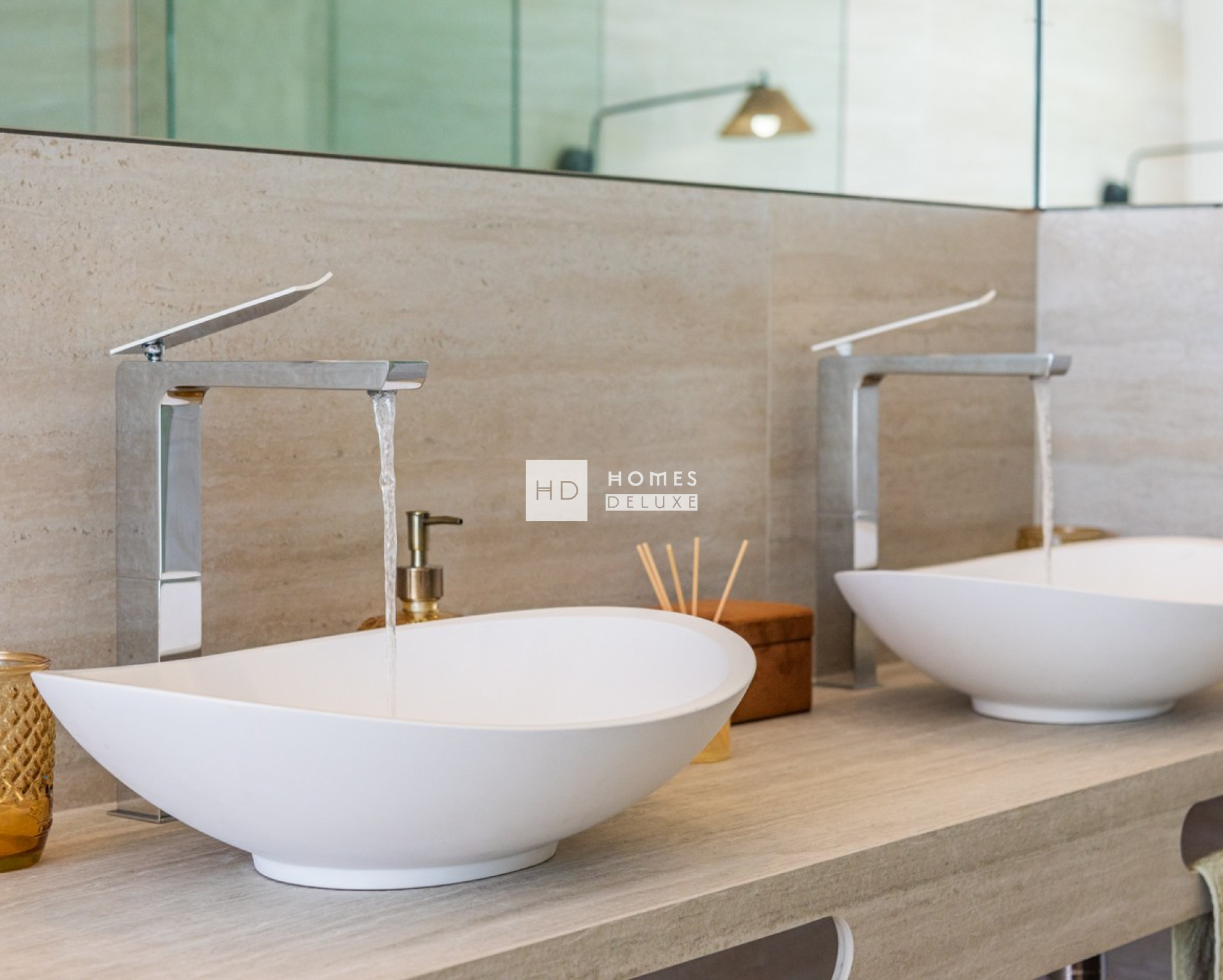 Les villas sont toutes de plain-pied et l'aménagement intérieur comprend un salon et une salle à manger spacieux et lumineux, avec de grandes baies vitrées laissant entrer beaucoup de lumière naturelle et donnant sur la terrasse extérieure. Dans l'espace de vie principal se trouve une cuisine moderne et élégante de style américain, avec des armoires hautes et basses laquées en blanc et des détails en bois, ainsi qu'un bar pratique pour le petit-déjeuner. L'impressionnante suite principale comprend une grande chambre, une salle de bains attenante et un dressing. Il y a deux autres chambres doubles de bonne taille, toutes les chambres ont accès à la terrasse principale par une porte-fenêtre, et il y a également une salle de bains séparée pour les invités. Un escalier extérieur sur le côté de la propriété vous mène au vaste solarium de 33 m² sur le toit, où vous pourrez profiter de la vue imprenable et du soleil toute la journée.