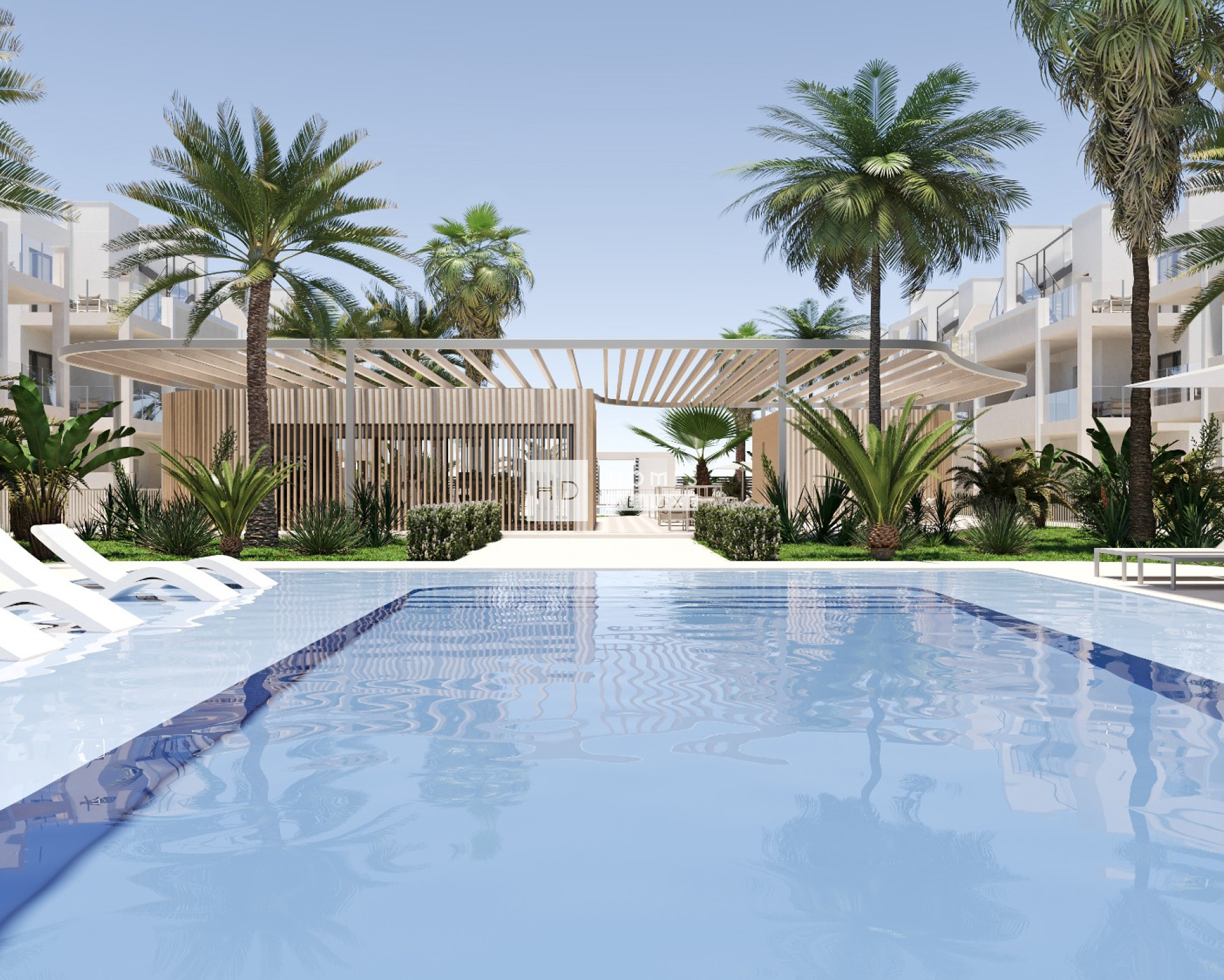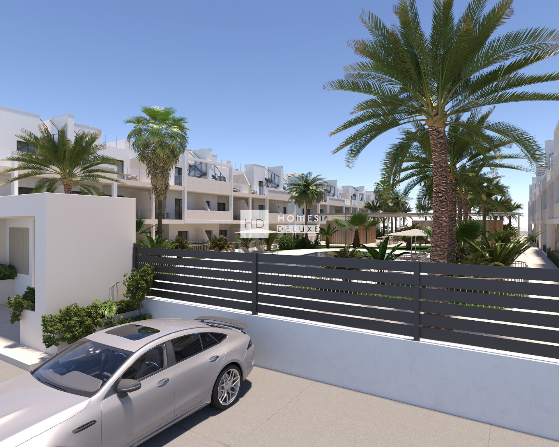 Le complexe se compose de 72 appartements répartis dans 4 bâtiments entourés d'espaces communs soigneusement conçus, comprenant deux piscines communes et une salle de sport entièrement équipée avec des appareils de fitness et de musculation, qui vous permet de profiter d'une vue imprenable à travers les baies vitrées. La salle de sport dispose également de salles de bains communes très pratiques, et les propriétés sont dotées de places de parking extérieures et de débarras privés au sous-sol.