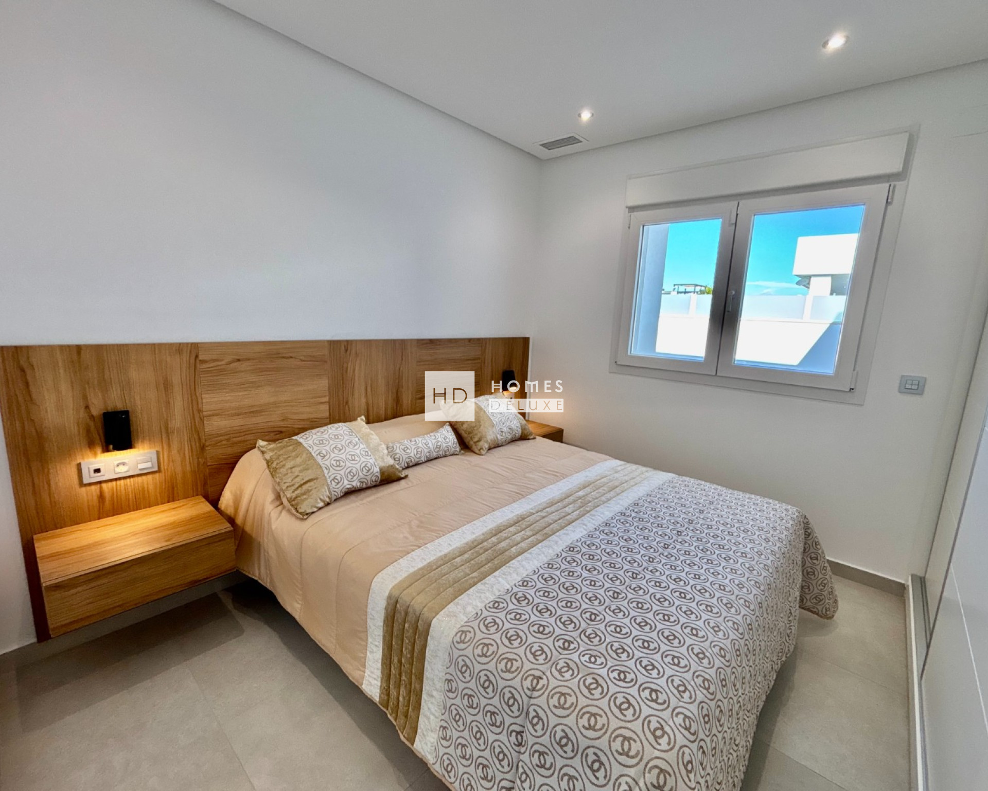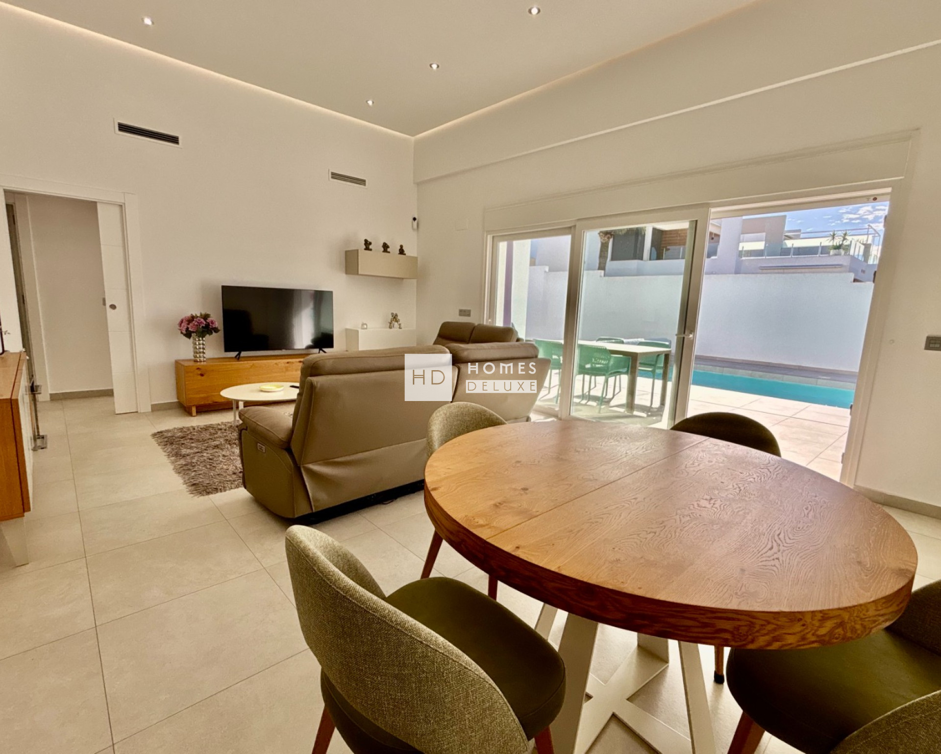 La maison est conçue avec soin sur un seul niveau, garantissant un accès facile et une transition harmonieuse entre les espaces de vie intérieurs et extérieurs. Cette disposition est particulièrement attrayante pour ceux qui recherchent le confort, la commodité et un style de vie méditerranéen moderne. La villa dispose de trois chambres bien proportionnées, chacune offrant une lumière naturelle abondante et des rangements intégrés. La suite principale se distingue par son accès direct au jardin et à la piscine, créant un havre de paix où vous pouvez vous réveiller sous la douce lumière du soleil espagnol. Les deux salles de bains élégantes sont finies avec des matériaux de haute qualité et des équipements contemporains, offrant une atmosphère raffinée, semblable à celle d'un spa, qui renforce le sentiment général de luxe de la maison. Au cœur de la propriété se trouve le salon ouvert, conçu pour maximiser l'espace et la lumière. La cuisine moderne, équipée de finitions haut de gamme et de plans de travail généreux, s'intègre naturellement dans la salle à manger et le salon. De grandes portes coulissantes s'ouvrent directement sur la terrasse, permettant à l'intérieur de se fondre harmonieusement avec l'environnement extérieur. Que vous receviez des invités, profitiez d'une soirée tranquille ou vous détendiez simplement en famille, cet espace s'adapte parfaitement à toutes les occasions.