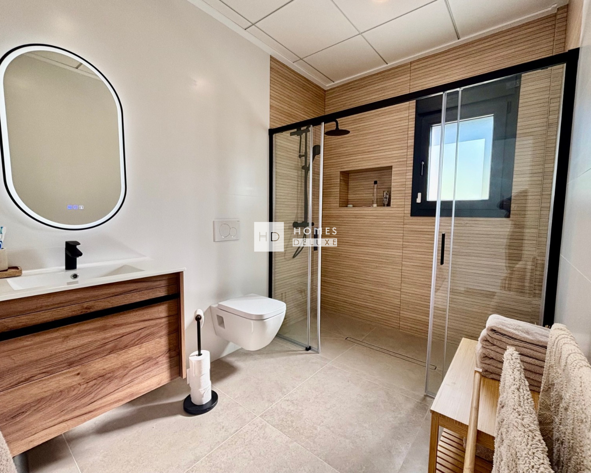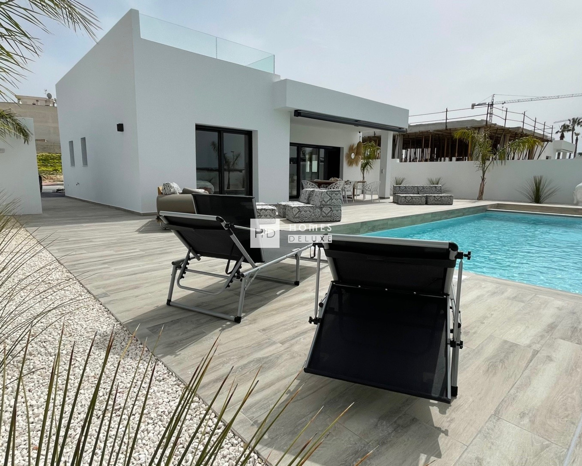 L'aménagement intérieur comprend un salon et une salle à manger spacieux et lumineux, avec de grandes fenêtres donnant sur la terrasse. Dans l'espace de vie principal se trouve une cuisine moderne de style américain avec un bar pour le petit-déjeuner et une buanderie séparée très pratique. La grande chambre principale est située à l'avant de la propriété, avec des portes-fenêtres donnant sur la terrasse principale, et comprend une salle de bains attenante. Il y a deux autres chambres doubles de bonne taille et une salle de bains séparée pour les invités. L'intérieur comprend des menuiseries modernes dans toute la maison, un choix de carrelages pour les sols et les murs dans les salles de bains et la cuisine, ainsi que de grandes baies vitrées et portes-fenêtres de haute qualité de la société Schuco. Les propriétés sont équipées d'une pré-installation pour la climatisation centralisée, d'un système de panneaux solaires photovoltaïques, d'un chauffage au sol dans les salles de bains, d'armoires encastrées dans toutes les chambres, de stores électriques, d'un jardin paysager avec système d'arrosage automatique et finition en gravier, et d'un parking privé sur le terrain avec portail d'entrée motorisé.