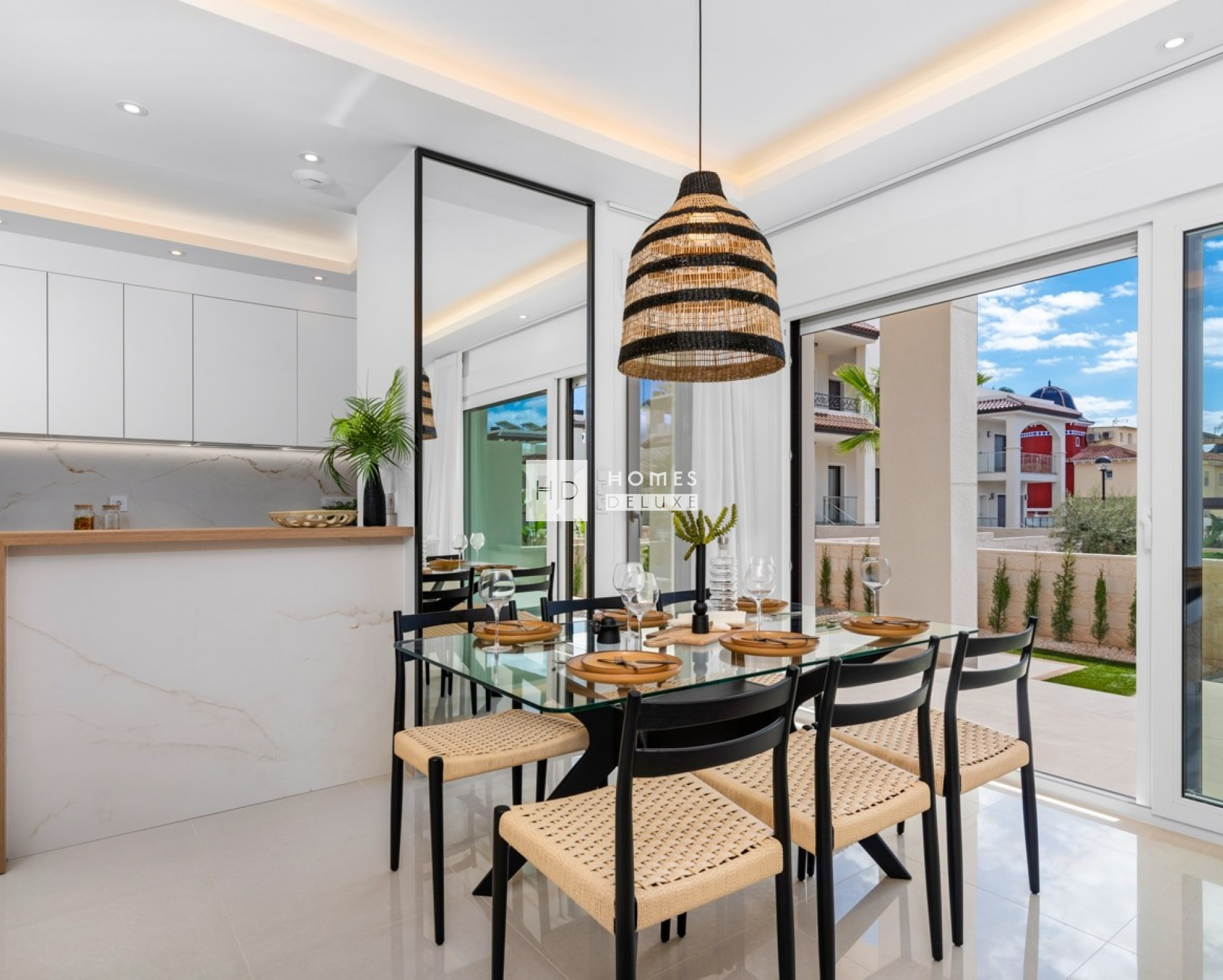 Le complexe vous offre le choix entre des appartements au rez-de-chaussée avec un grand jardin privé et une terrasse ou des appartements au dernier étage avec un grand solarium sur le toit. L'aménagement intérieur comprend un hall d'entrée menant au salon et à la salle à manger spacieux et lumineux, avec des fenêtres donnant sur la terrasse. Dans la pièce à vivre principale se trouve une cuisine américaine avec des placards bas et hauts ainsi qu'un bar pour le petit-déjeuner. La grande chambre principale dispose d'une salle de bains attenante. Il y a deux autres chambres doubles de bonne taille et une salle de bains séparée pour les invités. Les appartements du dernier étage disposent d'un escalier extérieur sur la terrasse menant au vaste solarium de 95 m² ou plus, pour profiter du soleil toute la journée. Les propriétés sont équipées d'une pré-installation pour la climatisation centralisée, d'armoires encastrées dans toutes les chambres, de stores électriques, d'un système d'interphone et d'un parking privé.