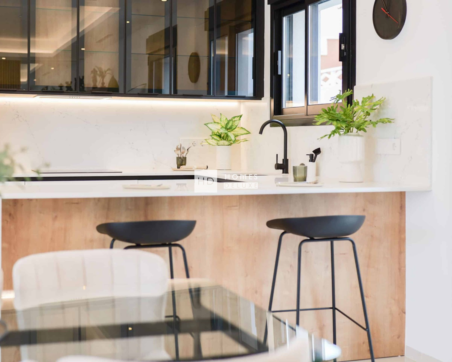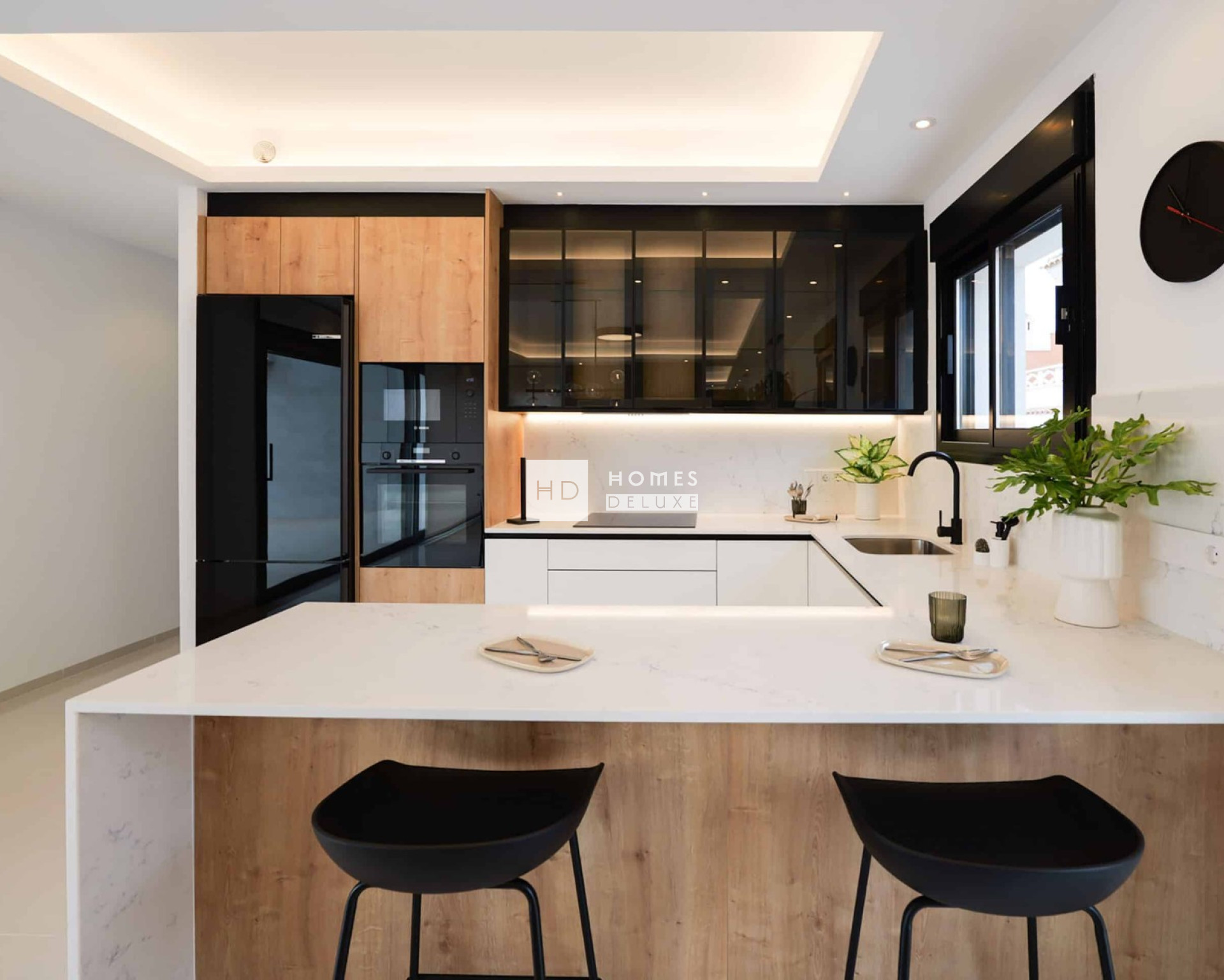 La villa elle-même est de plain-pied et offre des espaces lumineux et fonctionnels. L'aménagement intérieur comprend un hall d'entrée menant au spacieux salon et salle à manger ouverts, avec de hauts plafonds et de grandes fenêtres dans tout l'espace, créant ainsi beaucoup de lumière naturelle et s'intégrant parfaitement à l'extérieur. Dans l'espace de vie principal se trouve une cuisine moderne de style américain avec des armoires hautes et basses ainsi qu'un îlot central. La grande chambre principale avec fenêtre d'angle comprend une salle de bains attenante et un grand espace de rangement. Il y a deux autres chambres doubles de bonne taille avec des armoires encastrées et une salle de bains séparée pour les invités. Un escalier extérieur sur le côté de la propriété vous mène au solarium sur le toit avec une pergola, idéal pour profiter à la fois du soleil et de l'ombre.