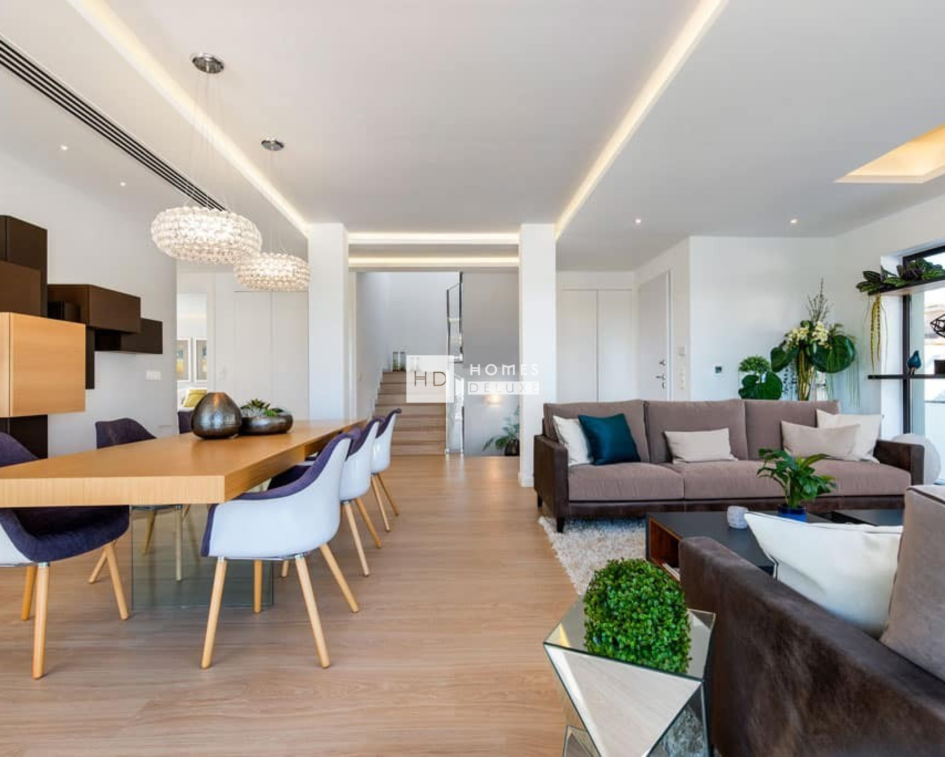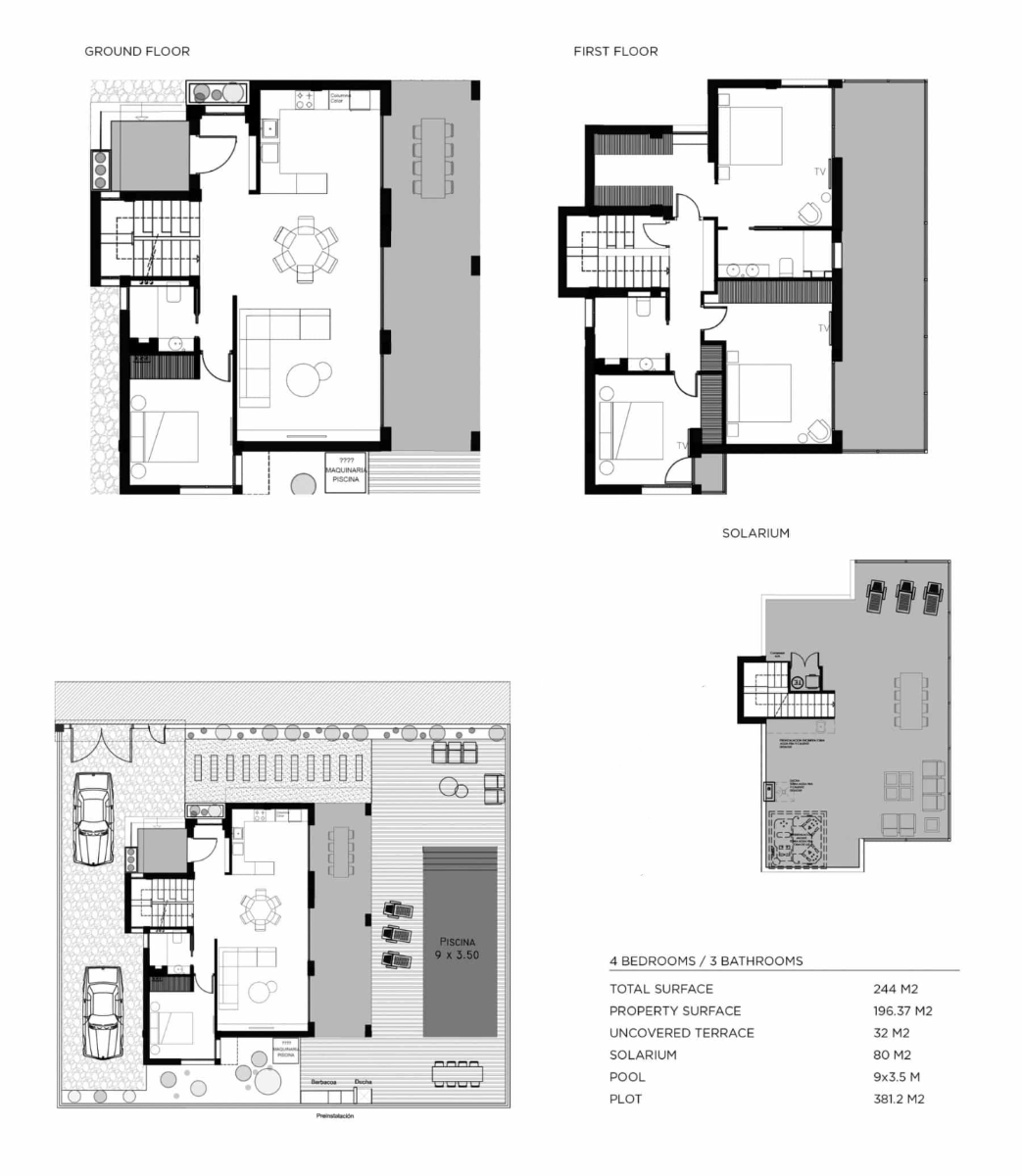 Les villas sont réparties sur deux niveaux et l'aménagement intérieur comprend un hall d'entrée menant au spacieux salon et salle à manger ouverts, avec de hauts plafonds et de grandes fenêtres dans tout l'espace, créant ainsi beaucoup de lumière naturelle et s'intégrant parfaitement à l'extérieur. Dans l'espace de vie principal se trouve une cuisine moderne de style américain avec des armoires hautes et basses. Le rez-de-chaussée comprend également une chambre double avec des armoires encastrées et une salle de bains séparée pour les invités. L'escalier intérieur vous mène au premier étage où se trouve l'impressionnante chambre principale avec salle de bains attenante et dressing. Il y a deux autres chambres doubles de bonne taille avec placards intégrés et une deuxième salle de bains séparée pour les invités. L'escalier intérieur vous mène également au solarium de 80 m² sur le toit, où vous pourrez profiter du soleil toute la journée. Les finitions de la propriété sont de qualité supérieure, tant au niveau des matériaux extérieurs que de l'intérieur des maisons, de la façade, de la cuisine, des salles de bains... Vous pouvez également opter pour un système domotique en option afin de contrôler les stores électriques, l'éclairage ou la température de votre maison.