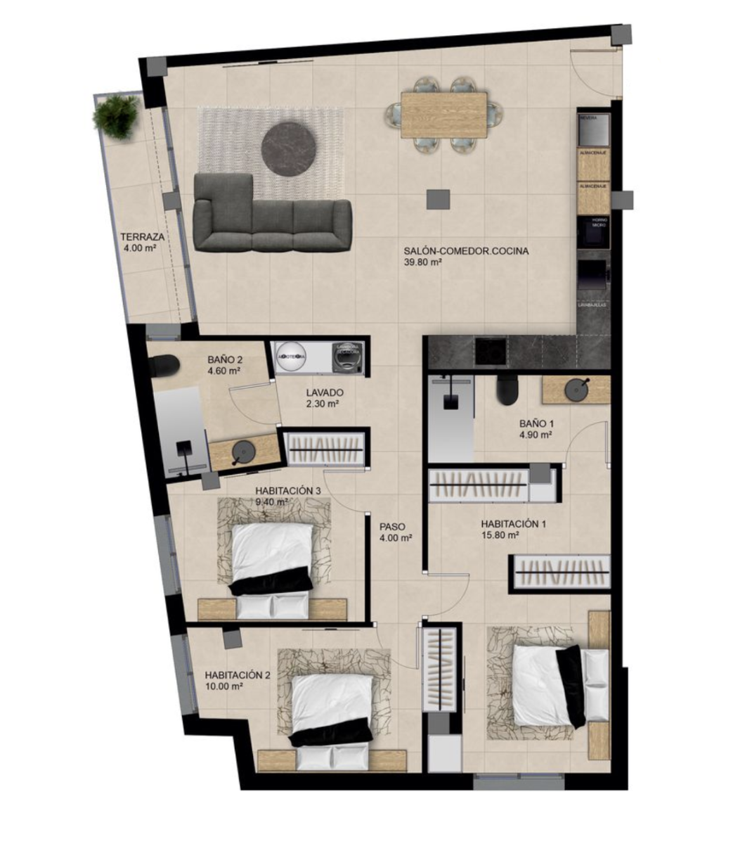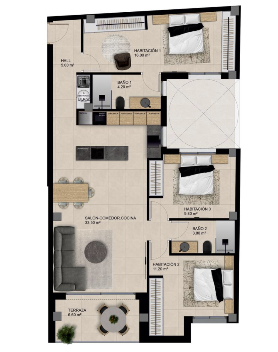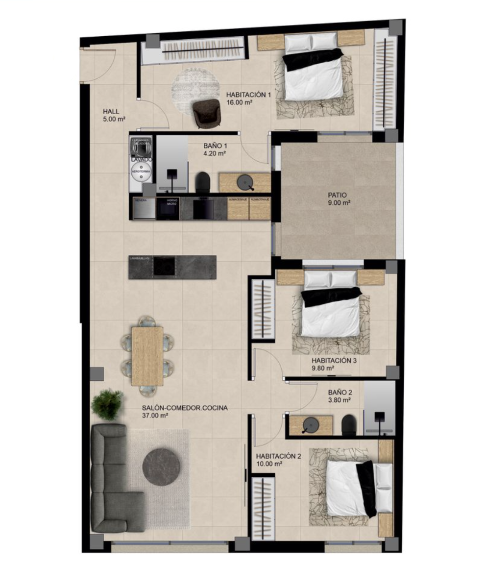 L'aménagement intérieur comprend un hall d'entrée menant au spacieux salon et salle à manger ouverts, avec des fenêtres donnant sur une terrasse ou un patio selon le modèle d'appartement. Dans l'espace de vie principal se trouve une cuisine américaine entièrement équipée, certains appartements offrant une buanderie séparée. La grande chambre principale comprend une salle de bains attenante et un grand espace de rangement. Il y a deux autres chambres doubles de bonne taille et une salle de bains séparée pour les invités. Les propriétés sont équipées d'une pré-installation pour la climatisation centralisée, du chauffage au sol dans les salles de bains, de tous les appareils électroménagers Bosch, y compris un lave-linge et un sèche-linge, d'armoires encastrées dans toutes les chambres, de stores électriques, d'un éclairage, d'un parking souterrain privé et d'un débarras selon la propriété.