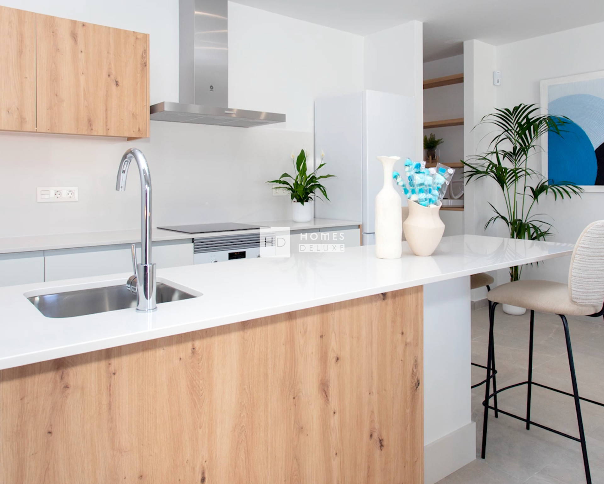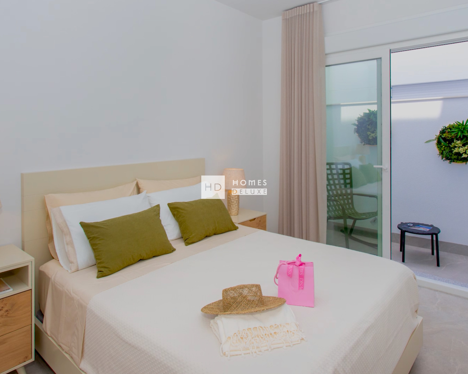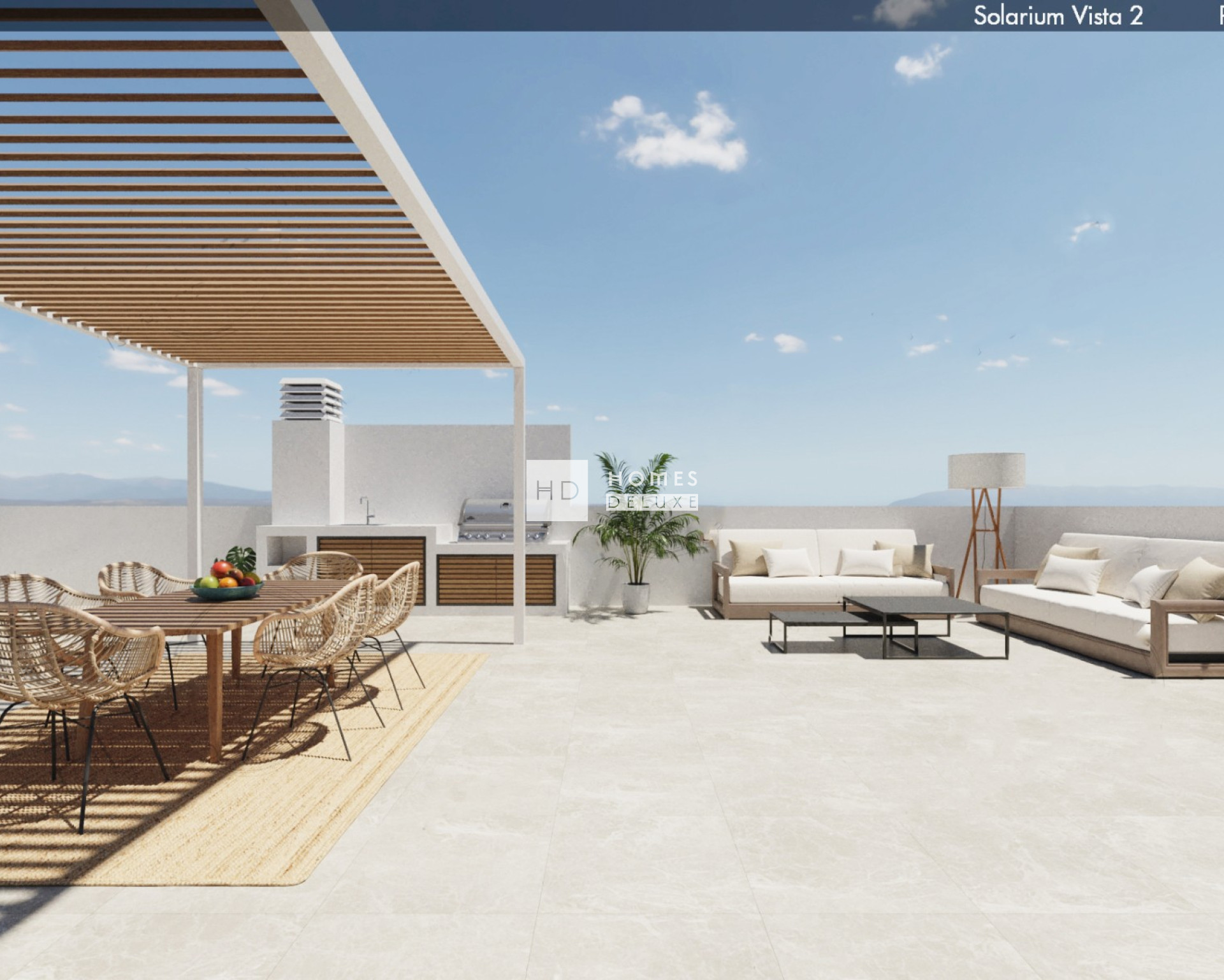 L'aménagement intérieur comprend un spacieux salon-salle à manger ouvert, doté de grandes baies vitrées donnant sur la terrasse privée. Au sein de l'espace de vie principal se trouve une cuisine américaine entièrement équipée avec un comptoir pour le petit-déjeuner (selon le modèle d'appartement, certains disposent d'une buanderie séparée). La grande chambre dispose d'une porte-fenêtre donnant sur la terrasse et comprend une salle de bains attenante. Les appartements situés au dernier étage disposent d'un escalier extérieur sur la terrasse menant à un vaste solarium sur le toit, où vous pourrez profiter du soleil toute la journée.