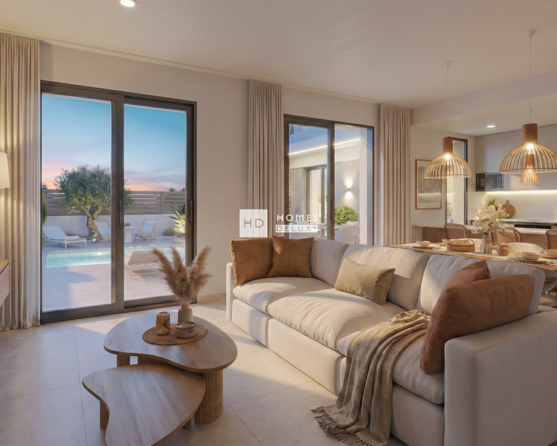 Les villas ont été conçues avec un magnifique agencement en "L" et l'intérieur comprend un hall d'entrée menant au spacieux salon et salle à manger ouverts, dotés de plusieurs grandes fenêtres qui laissent entrer un maximum de lumière naturelle et donnent accès à la terrasse et au jardin. Au sein de l'espace de vie principal se trouve une cuisine moderne de style américain, aux finitions blanches épurées, avec un îlot central. De l'autre côté de la villa se trouve l'espace nuit, où vous trouverez une grande chambre principale avec salle de bains attenante et une porte-fenêtre donnant sur la terrasse principale. Il y a deux autres chambres doubles de bonne taille et une salle de bains séparée pour les invités. Un escalier extérieur sur le côté de la propriété vous mène au vaste solarium de 63 m² sur le toit.
